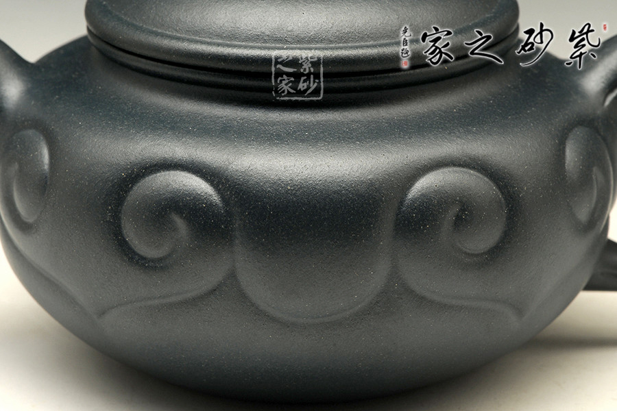 此款仿古如意在傳統(tǒng)仿古扁壺造型上加飾如意筋紋,身、蓋、頸、腹、鈕,錯(cuò)落有致,骨肉亭勻,壺的口沿與壺蓋連成一條圓線,口蓋各占一半,蓋子蓋上即合成飽滿的圓線,其對作者的考量可想而知,壺流胥出自然,壺把勻勢而起,且與壺身如意貫氣,壺鈕為如意形橋梁式,平緩舒展合體,整器精美絕倫。