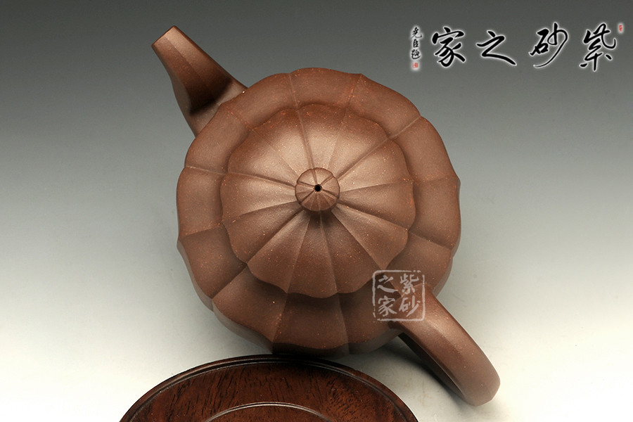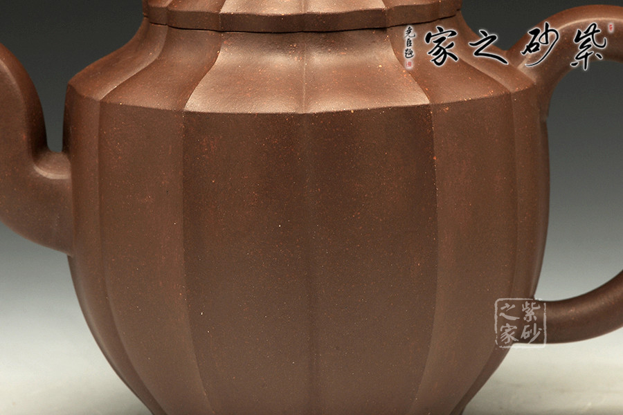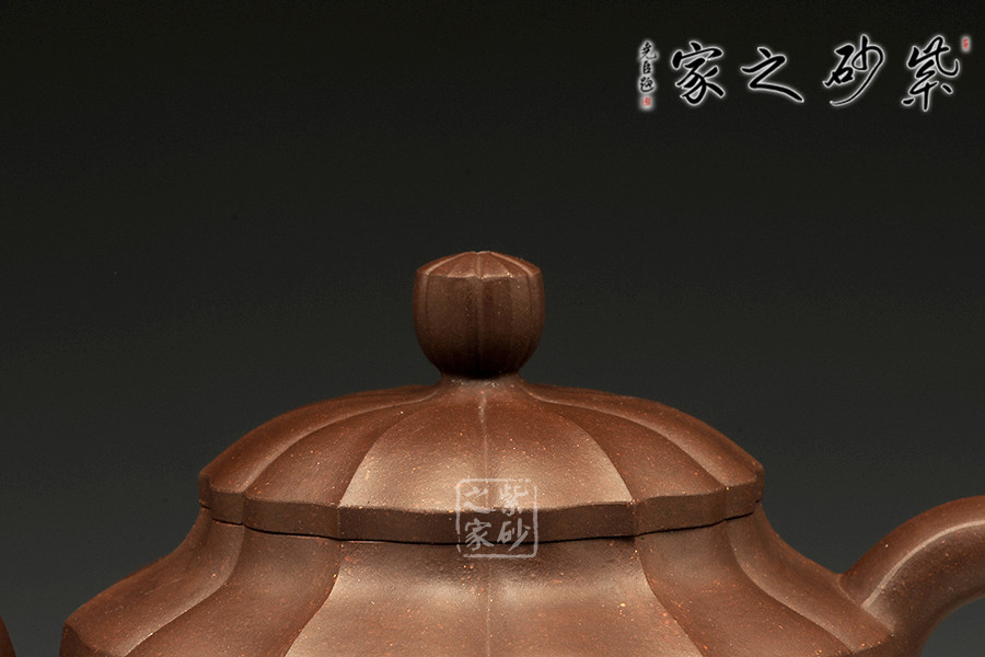 壺體為菱花式造型,壺腹上部漸寬,三彎流曲線順暢,把渾而圓,高頸平肩,脈絡(luò)清新。壺身筋紋流暢,脈絡(luò)清新。壺身自上而下弧線形漸收,此壺制作精細(xì)規(guī)整,把傳統(tǒng)紫砂筋囊器制作工藝運(yùn)用到極致,達(dá)到爐火純青的地步,各瓤瓣之間相依相偎,親密無間。壺式古樸風(fēng)雅,不愧為大家名作。
