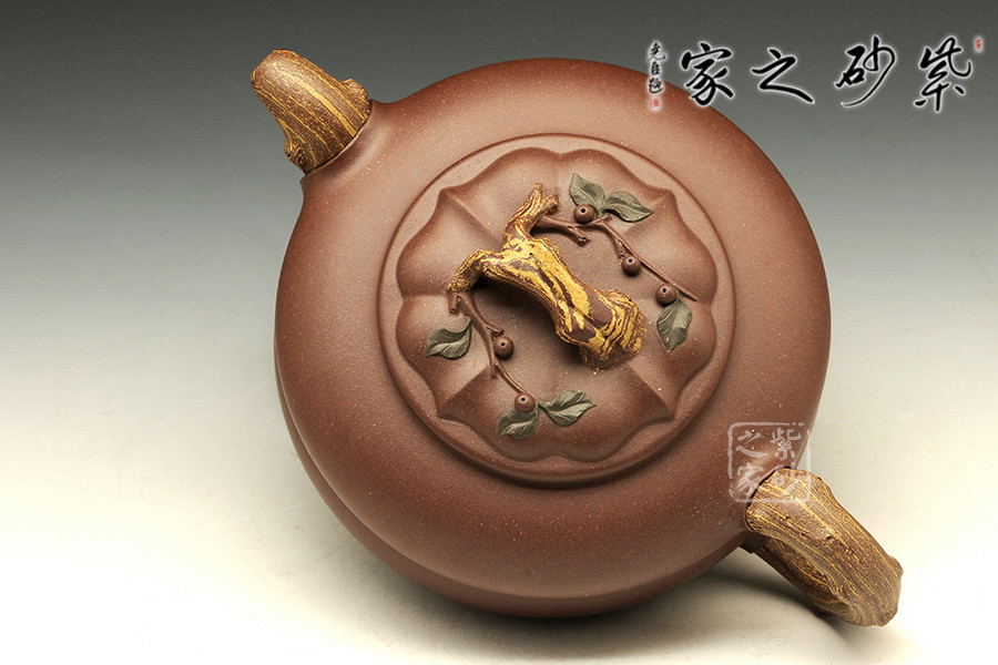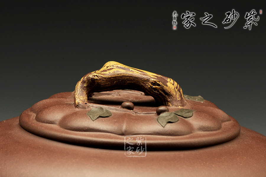 作品由花器+圓器+筋紋器融合而成,既有花貨的逼真惟美,又有筋紋器的陰陽(yáng)有致,是一款極為考驗(yàn)藝人技藝功底的作品。壺身由一圈筋紋一分二為,上下飽滿有張力;嘴把鈕以樹枝設(shè)計(jì),樹的紋理可以假亂真;壺蓋以筋紋樣式設(shè)計(jì),凸凹有致,對(duì)比協(xié)調(diào)。從壺的色澤樣式中似乎能感受到夏天時(shí)枝頭開始結(jié)果的瞬間。