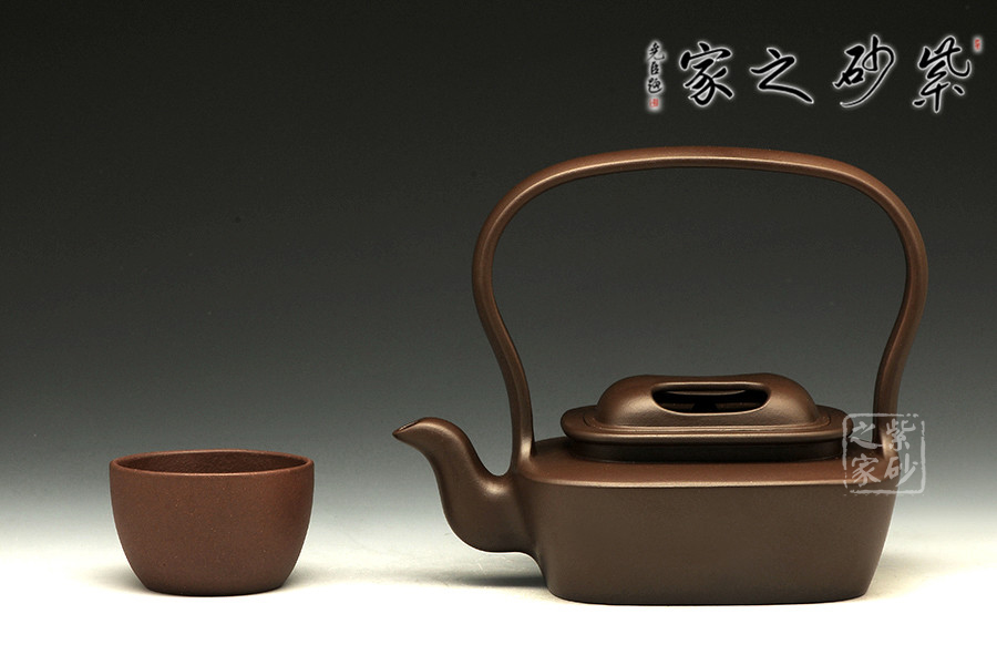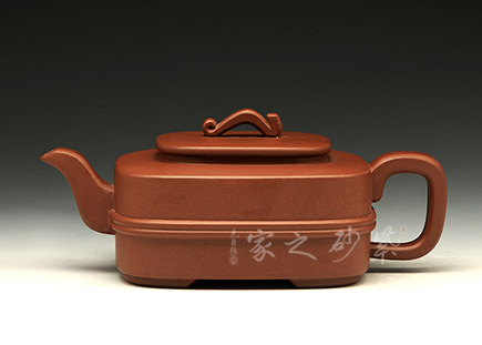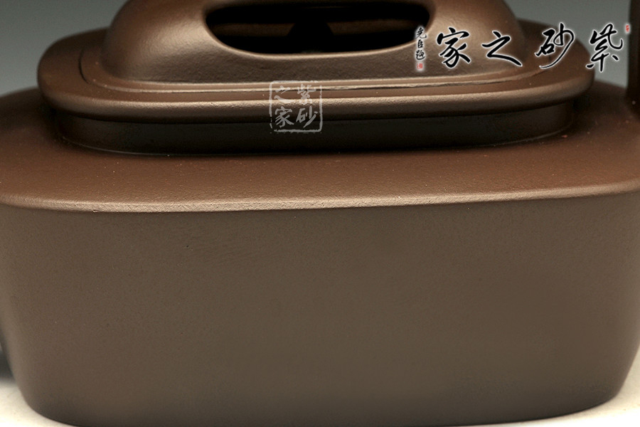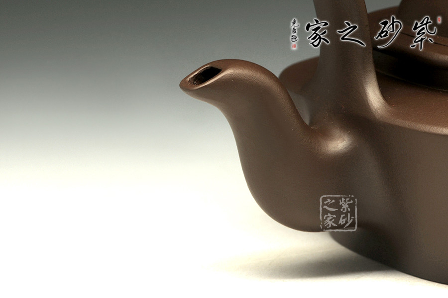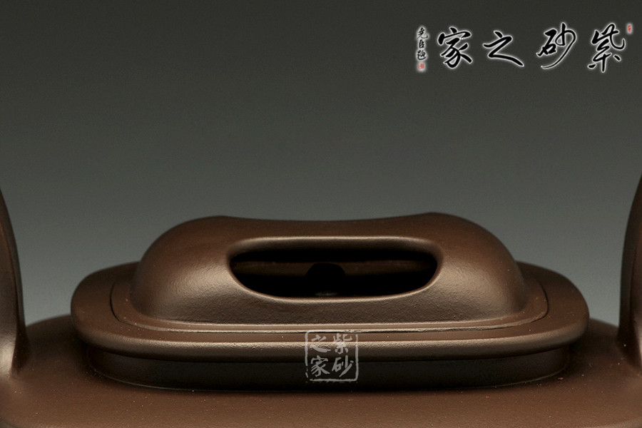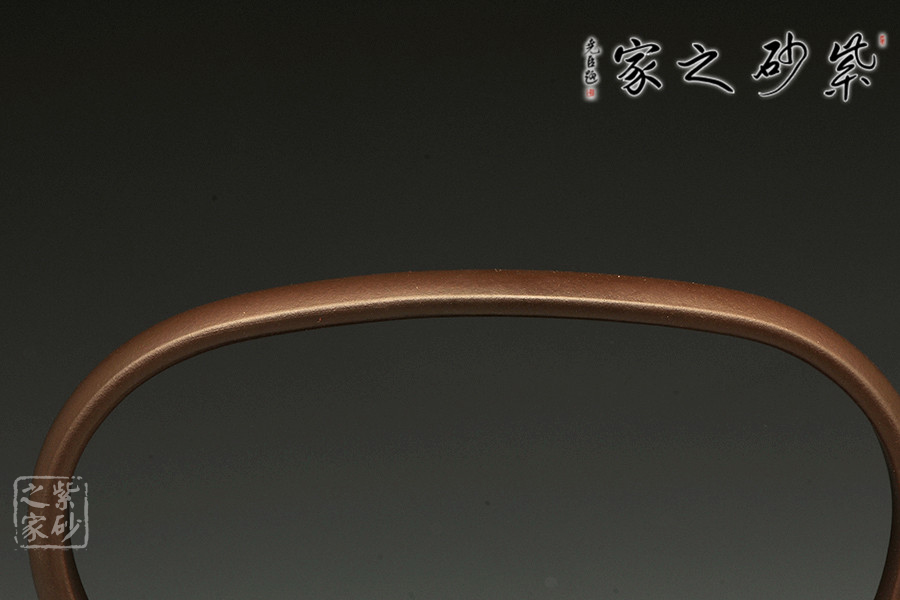 此壺為牛蓋提梁是范錫明老師精心創(chuàng)作的力作,彎嘴胥出自然,出水暢快,壺蓋以牛蓋的形式來表現(xiàn)非常新穎,嵌蓋絲密嚴(yán)縫做工實(shí)屬不易。以提梁代替壺把,盡以曲度應(yīng)和身筒方正之感,上下合一渾然一體。此壺線條流暢,線條清晰而自然,以壺底之高襯托壺身讓整體高挺,更使提梁挺拔,整體氣勢不凡。