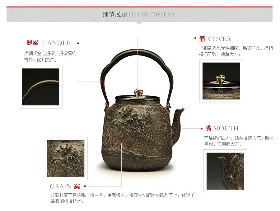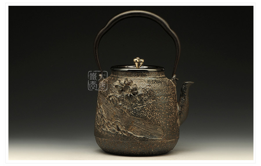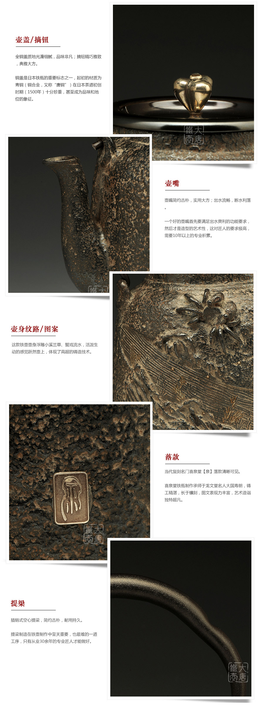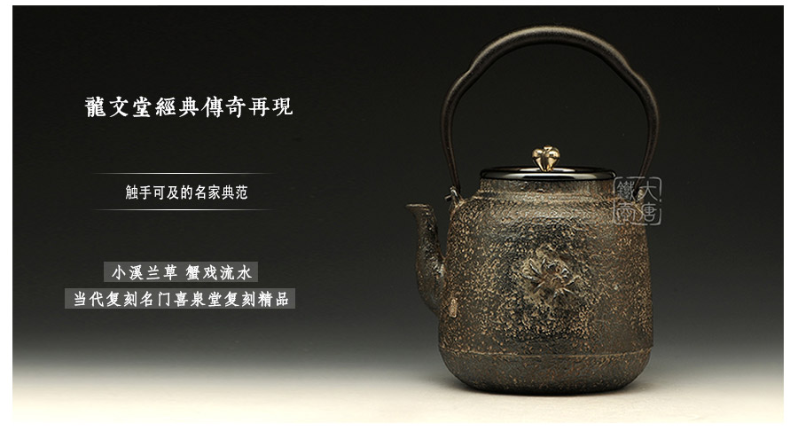 當(dāng)代復(fù)刻名門喜泉堂復(fù)刻精品,龍文堂經(jīng)典傳奇再現(xiàn),壺身浮雕小溪蘭草、蟹戲流水,活潑生動的感覺躍然壺上,體現(xiàn)了高超的鑄造技術(shù)。