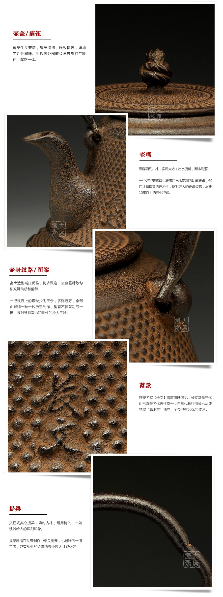 昭和27年(1952年)長文堂初代長谷川長六從鑄物屋“高陽堂”中獨立,自設(shè)工房,從事鐵瓶和湯釜的制作。昭和39年(1964年),長六逝世,其子長谷川文雄繼承父業(yè),成為二代目,并在山形縣銅町設(shè)立新的工房,取其父親名中的“長”和自己名中的“文”,合名為長文堂。此后,長谷川文雄常以藝名“長文” 制作和出席各類活動。