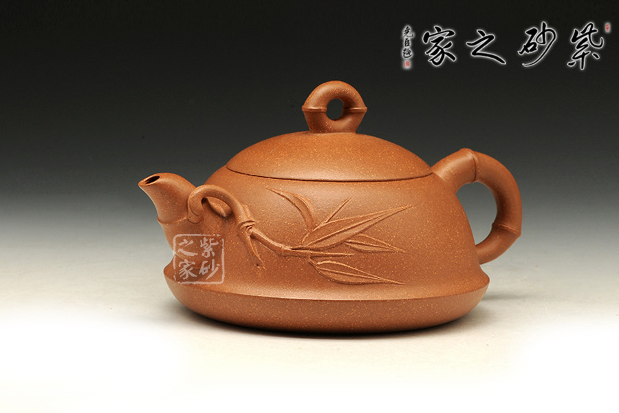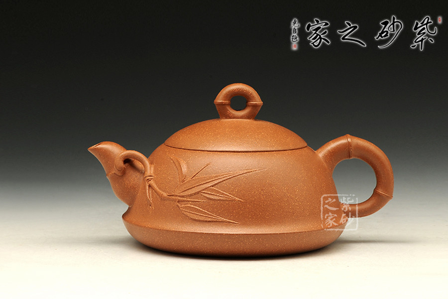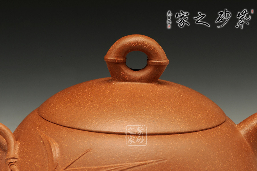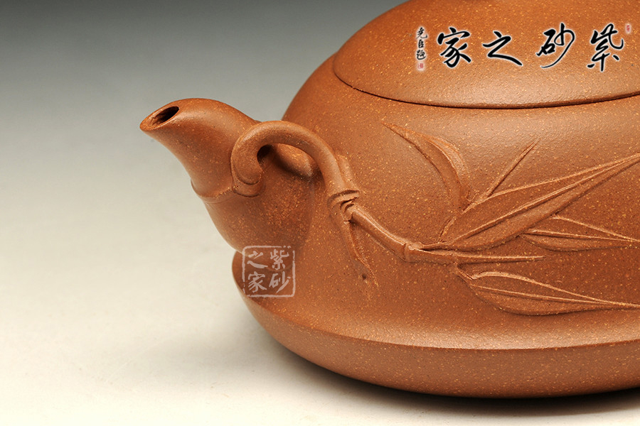 此壺形似半月,壺身呈半圓形,截蓋讓整壺融合一體,形成一個完整的半圓。壺底設(shè)計新穎,外擴一圈,似有容忍之力,托起整壺,極具張力。整壺處處可見竹的元素,圓把與壺鈕均是一圈竹節(jié)形式,兩者呼應(yīng),圓融可愛。壺嘴也粗壯短促,曲折蜿蜒,壺嘴上冒出一枝竹節(jié),貼合壺身,竹報平安之意,整個壺的造型呈現(xiàn)出優(yōu)美雅致感,耐人尋味。
