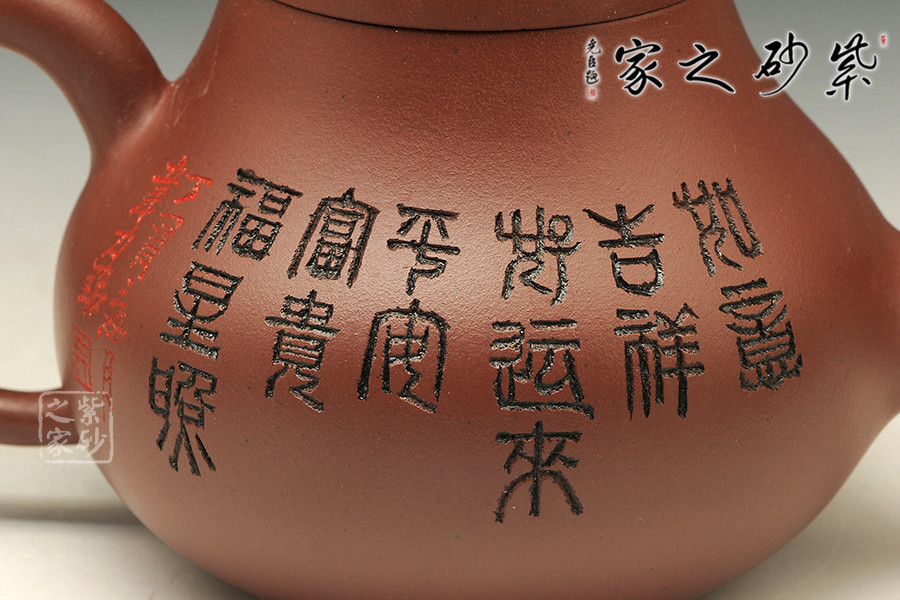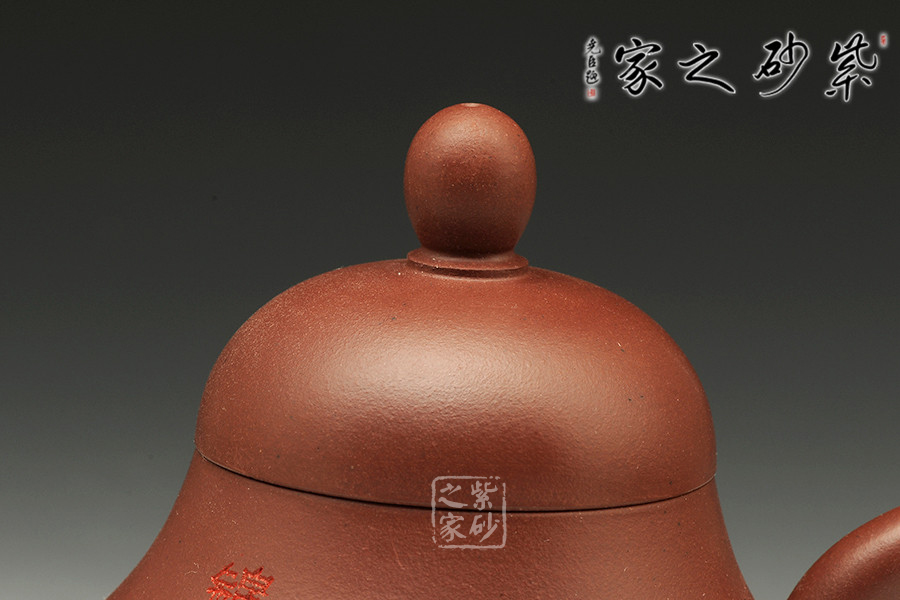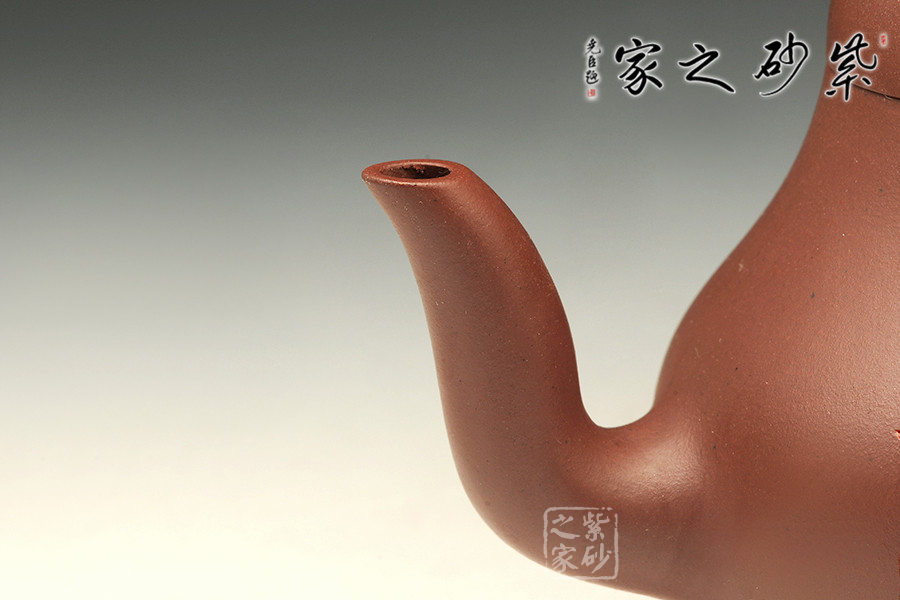 思亭壺為清代陸思亭所創(chuàng)壺式,器形簡潔大方,為后世人紛紛效仿。壺身如葫蘆,細長的壺嘴自壺腹向上胥出,圈把秀麗,高截蓋與壺口相切,形成一個完整的葫蘆;子母線切合嚴密,氣密性極好,圓球形壺鈕,干凈利索,一捺底,整器均勻,的流把明接手法,處理細致到位。