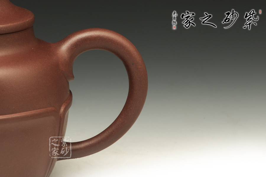 陳腐10余年底槽青為泥,泥質(zhì)細(xì)膩有光澤,易于泡養(yǎng)。此為老師原創(chuàng)之作,手工成型,頗見(jiàn)功力。以蓮花為基形,壺身呈圓柱狀,上寬下窄。壺體以官帽上的菱花紋為裝飾,豐富了整器的層次感;三彎長(zhǎng)流線條優(yōu)美,細(xì)長(zhǎng)的耳形把與壺嘴對(duì)稱,比例精準(zhǔn);平蓋之上飾以柱形壺鈕,方便提攜。整器內(nèi)蘊(yùn)豐富,各部位完美搭配,賞之和諧。