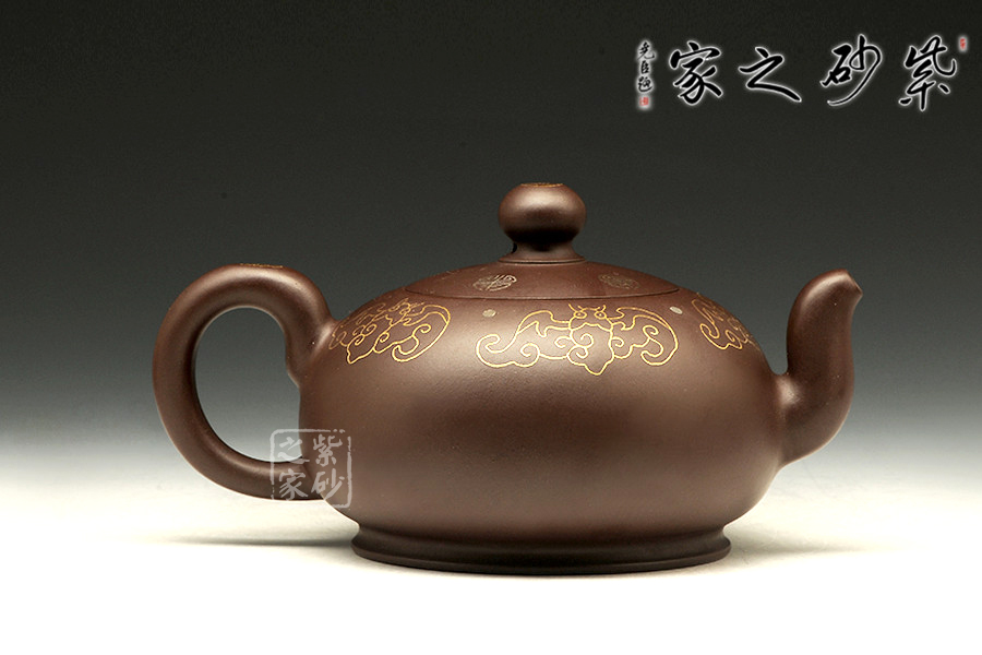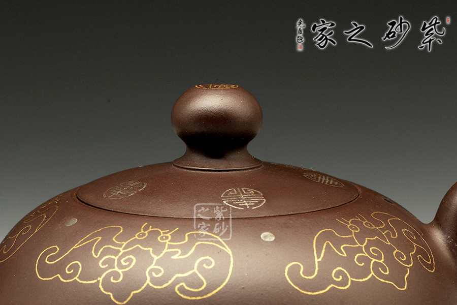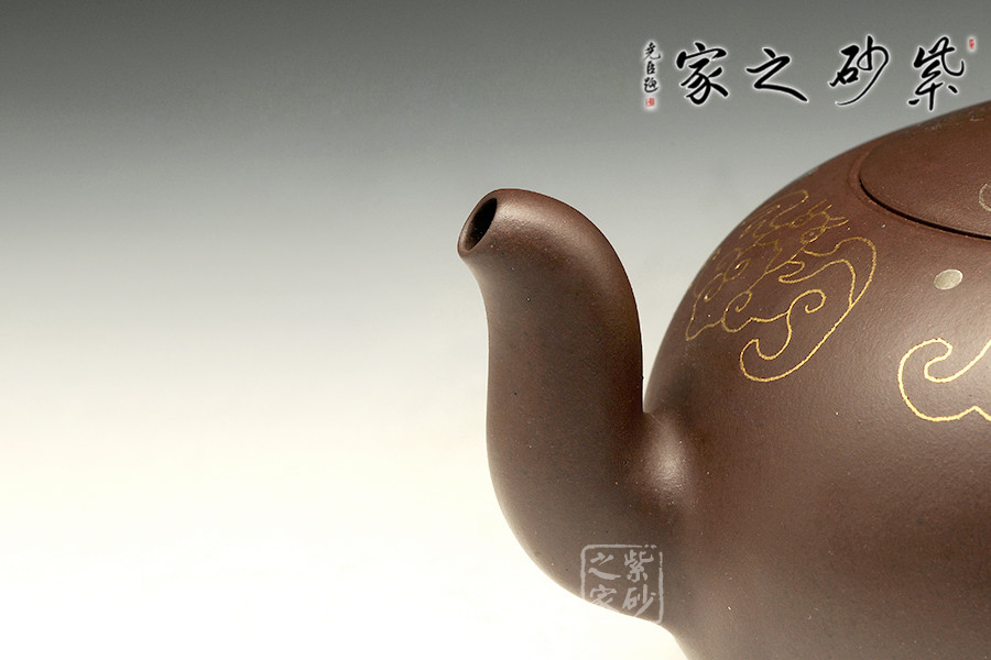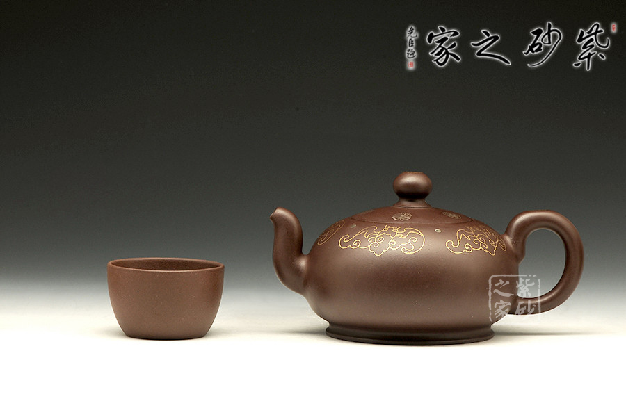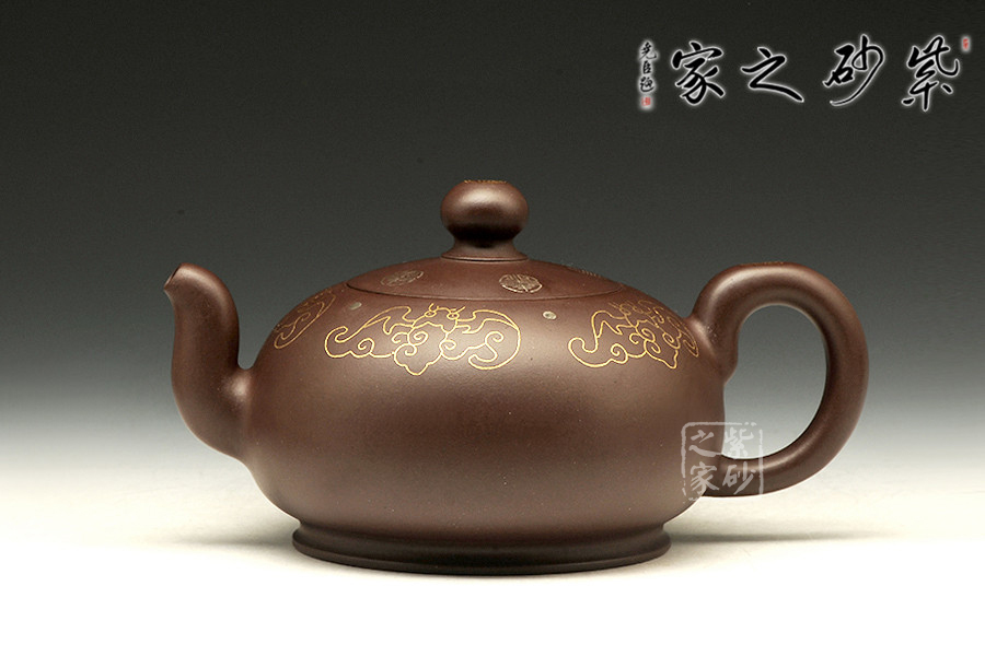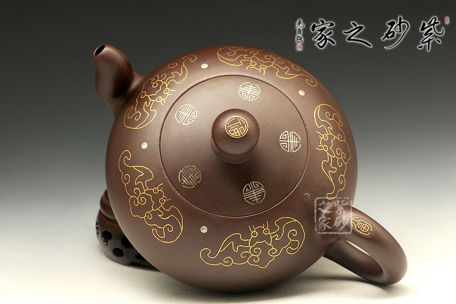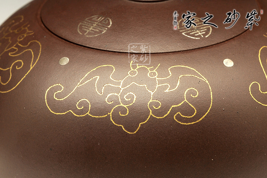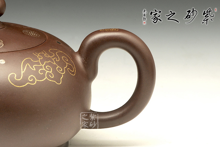福壽一粒珠,顧名思義,此壺集喜樂、安康、祥和、吉慶于一身,極為祥瑞。此器為圓壺,圓潤飽滿,壺身描金,繪以五只蝙蝠,蝠為“福”,“五福臨門”之意;壺蓋對應(yīng)同為描金五個“壽”字,意為“五福捧壽”;有“福”有“壽”,又寓意“福壽雙全”。壺鈕同為圓形,與整壺對應(yīng),壺鈕上繪有“福”字,乃身在福中;壺把上繪有“富”字,泡茶倒茶之時,無論拇指是按壓壺鈕還是壺把,“福壽”“富貴”皆是水到渠成。此壺?zé)o論是收藏把玩,還是禮送贈友都實(shí)屬上品,不可多得。