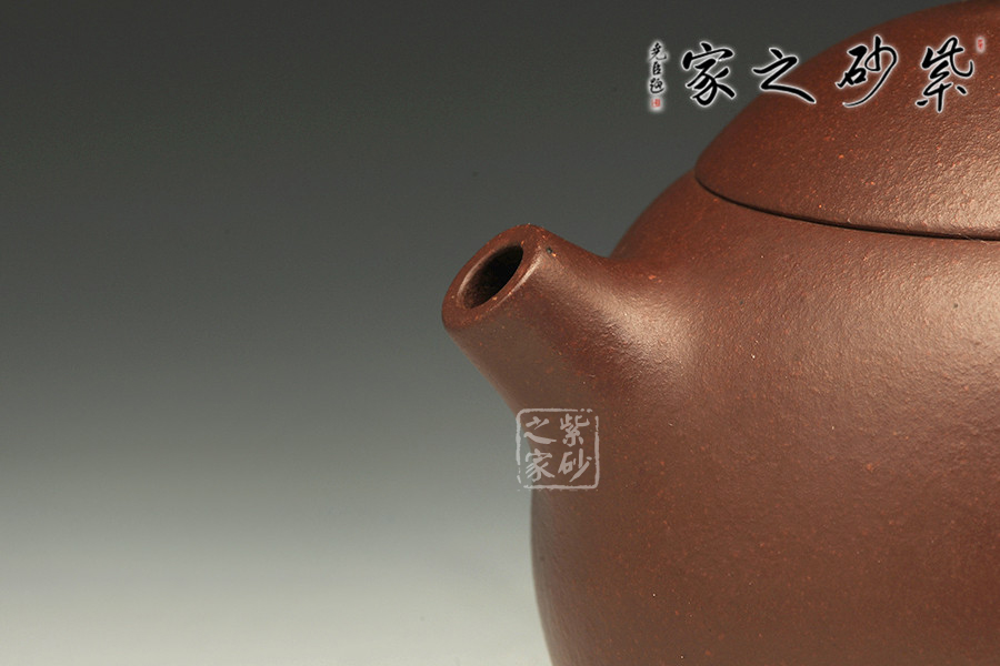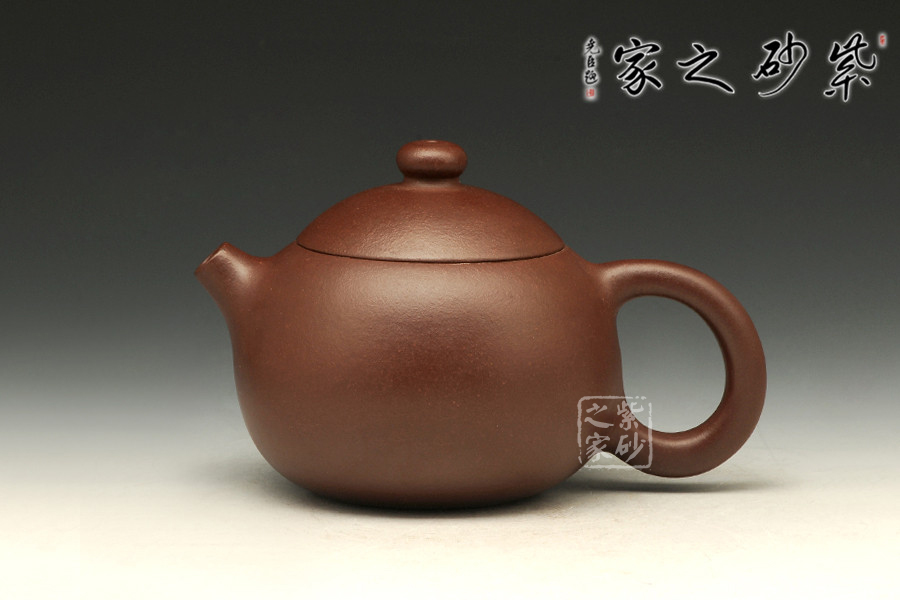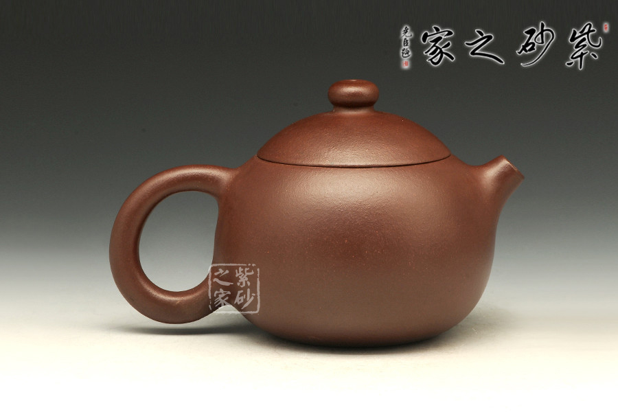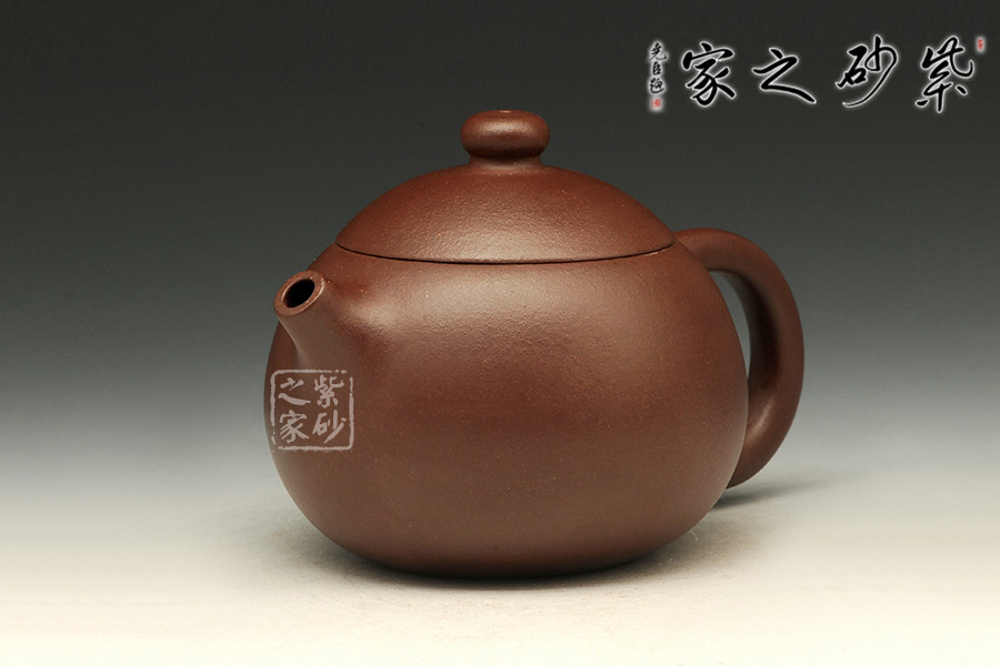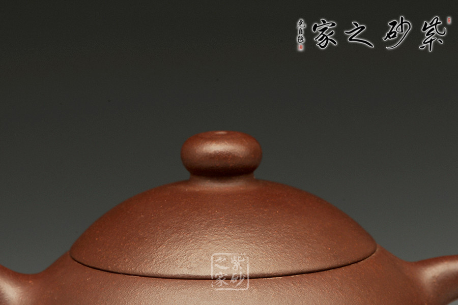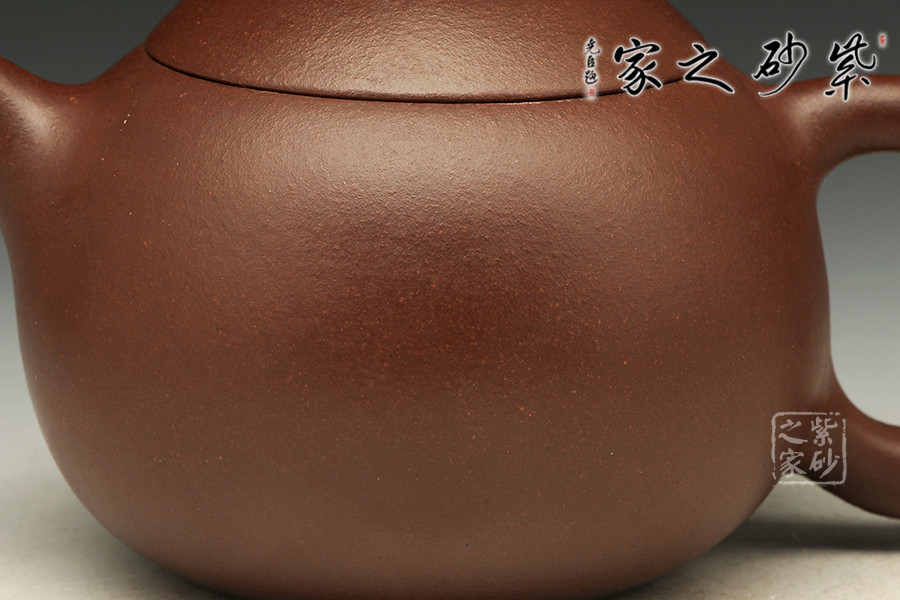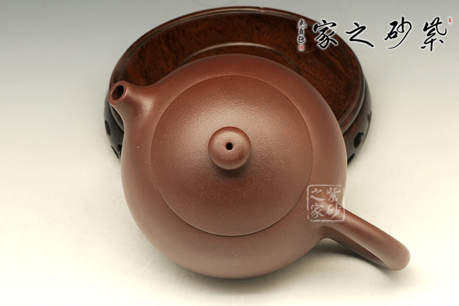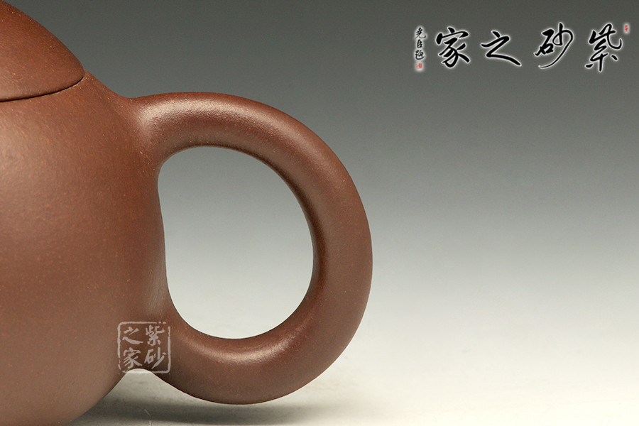 倒把西施是經(jīng)典壺型之一,點(diǎn)滴變化,魅力無(wú)窮,由極精簡(jiǎn)的線面,架構(gòu)成西施乳形,流線豐滿光潤(rùn),身蓋相連呈截蓋,鈕為圓乳頭狀,底向里收斂,呈一捺底狀,嘴短而小巧,把圈向下傾斜,俗稱“倒把”,整器均采用暗接處理,甚見(jiàn)壺藝家功力。