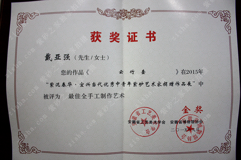 2016年廣州紫砂陶瓷藝術文化節(jié)“紫金城天工杯”榮獲金獎。