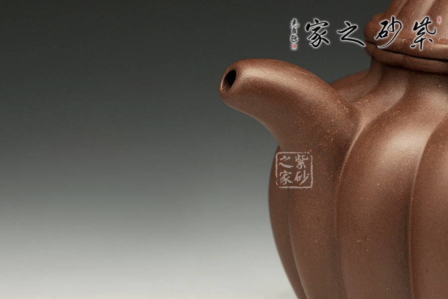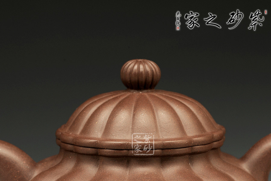 此壺采用紫泥燒造,色澤秀美艷麗;器身分為十六瓣,器身橫向呈扁菊,正向成瘦菊。菊球壺既呈圓形,又分十六均等的花瓣,其制作難度可想而知,足見陶藝家手藝精巧嫻熟。壺蓋和口瓣相吻,筋紋從壺蓋頂端放射到蓋口,再舒展過(guò)渡到壺體,直到壺底中心,全器貫通一氣。瓣面大小如一,腴而不肥,轉(zhuǎn)角純而清朗,呈現(xiàn)出勻稱豐腴的寶相,惹人喜愛。壺鈕如精巧的菊花蕾,雖小巧玲瓏,其上筋紋歷歷可數(shù),精雕細(xì)刻,清晰規(guī)整。使整器恰似芬芳的菊花,沁人心脾。