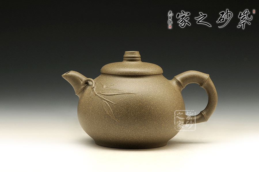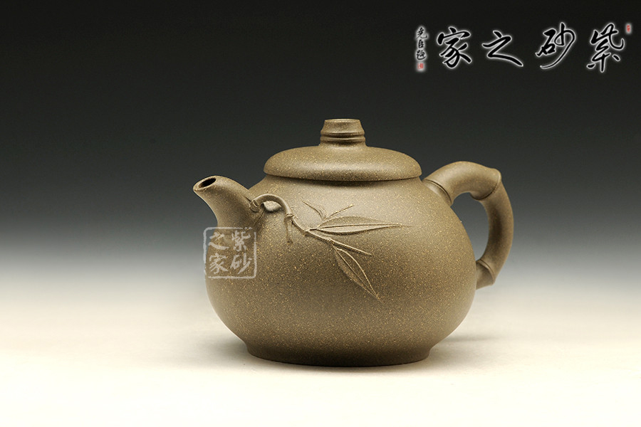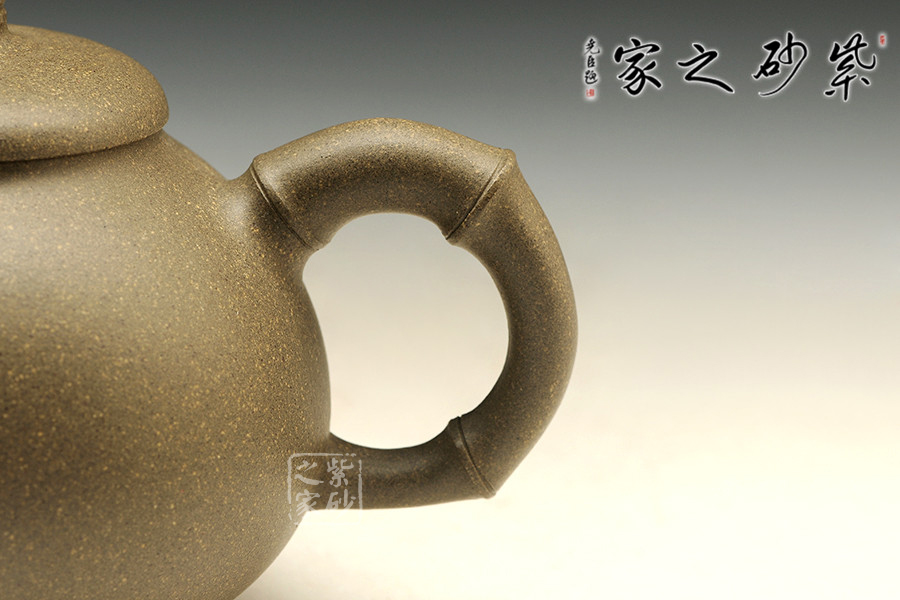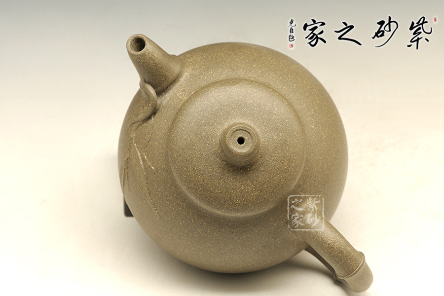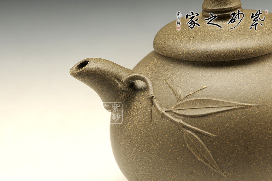 此壺壺型圓融,壺腹飽滿,有容乃大,外觀勻稱,穩(wěn)重端莊,通體充盈著溫雅的品味。處處可見以竹為題材,壺鈕、壺嘴、壺把均采用竹節(jié)形制,壺把更是一直竹節(jié)冒出,更添情趣,整器渾然一體,形態(tài)逼真,令人賞心悅目。