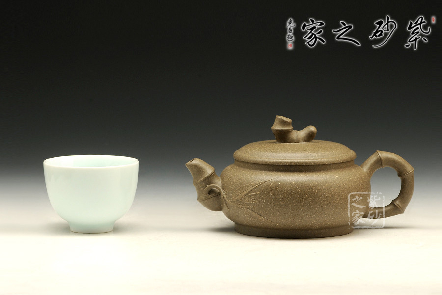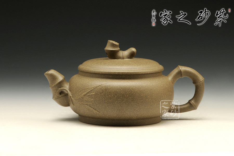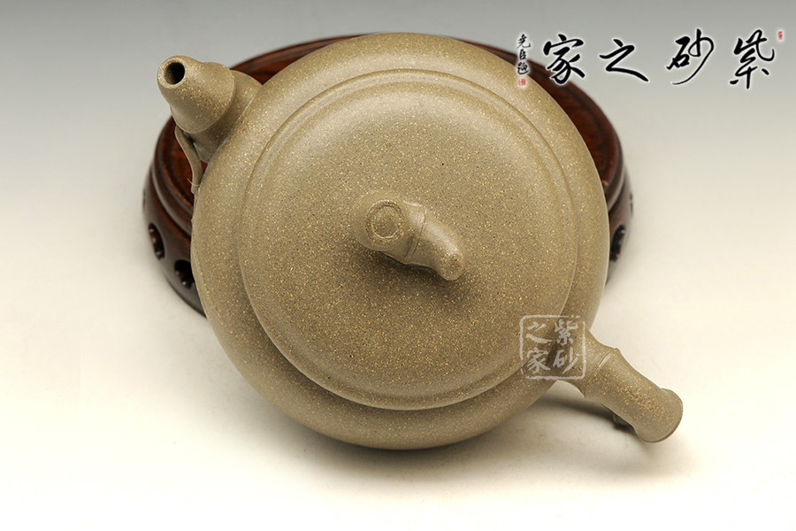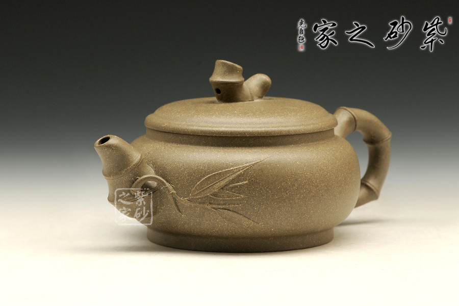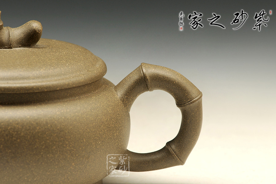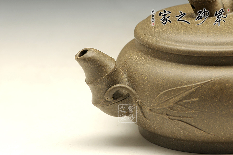 古韻壺壺身扁圓,壺口、壺底兩頭呼應(yīng),呈收勢(shì),壓蓋嚴(yán)謹(jǐn),蓋面微鼓,蓋沿一圈密封性好。壺鈕、壺嘴、壺把均采用竹節(jié)形制,壺嘴一彎嘴,嘴口收勢(shì),出水有力,從壺嘴上蜿蜒一節(jié)竹枝,形態(tài)逼真,賞心悅目;壺鈕是一節(jié)仿生的竹段,自然彎曲伏于壺頂,逸趣橫生;耳型把圓潤(rùn),竹節(jié)仿生。整壺野趣生動(dòng),富有韻味,題材富有詩(shī)意,造型優(yōu)美,把玩和泡養(yǎng)兼?zhèn)洹?/p>