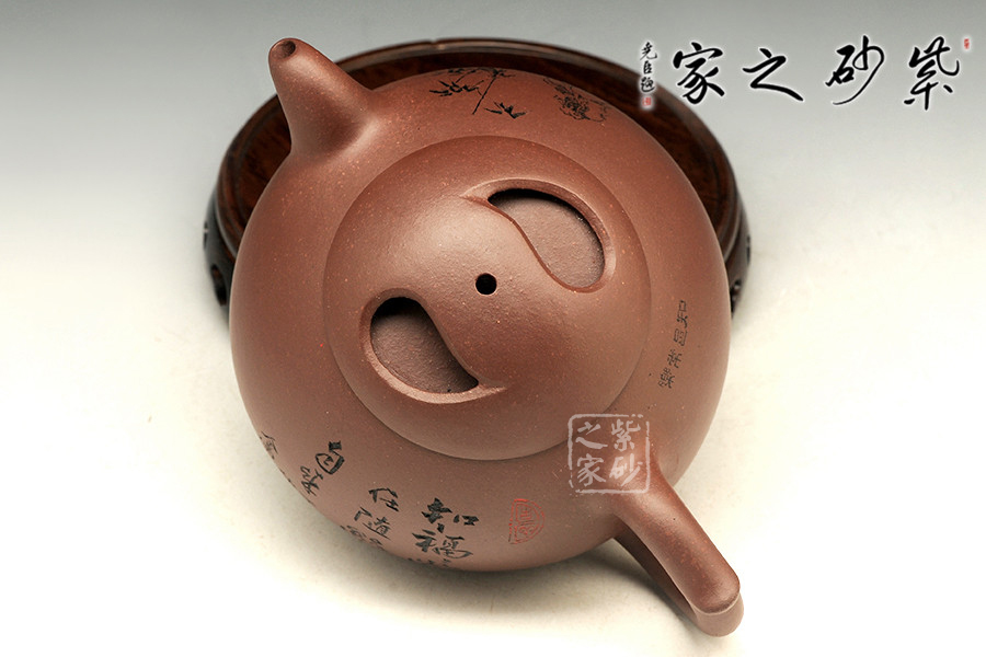 知福壺整壺圓融飽滿,憨態(tài)可掬,成穩(wěn)任重。截蓋與壺身融合一體,牛蓋高起,契合圓福之形。一彎嘴短促,胥出有力,圈把圓滑,向上挺翹。從上俯視,可見牛蓋兩鼻孔設(shè)計,暗含八卦之意,天地萬物,自有天意。
