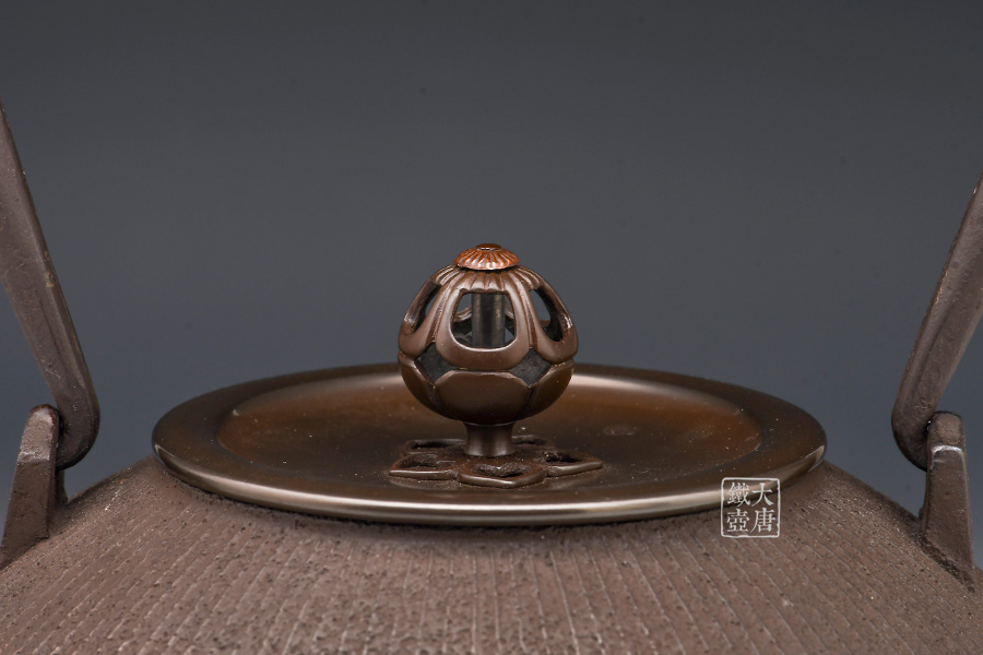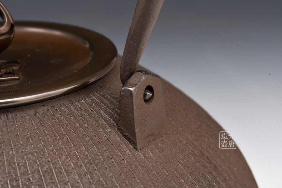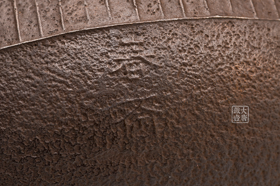 鐵瓶內(nèi)底被稱之為“鳴金”的響片使得水燒開之后的煮沸聲更為悅耳。鐵瓶下側(cè)的“春齋”刻印以及共箱蓋子的題字都是作者親筆所寫。此為檢驗(yàn)春齋鐵瓶真?zhèn)蔚臉?biāo)志之一。