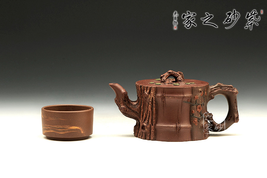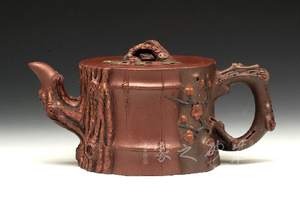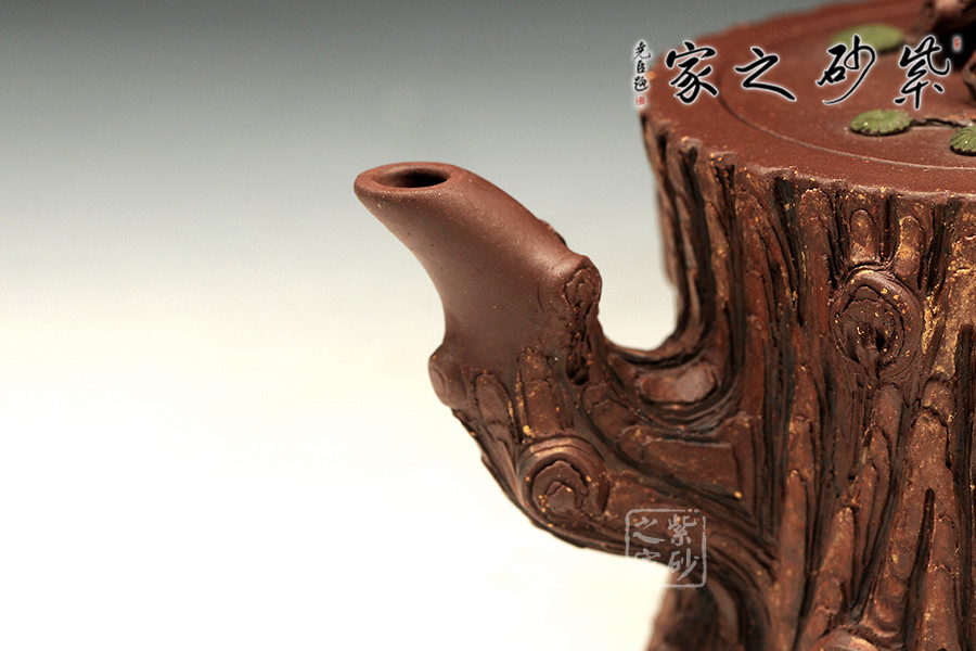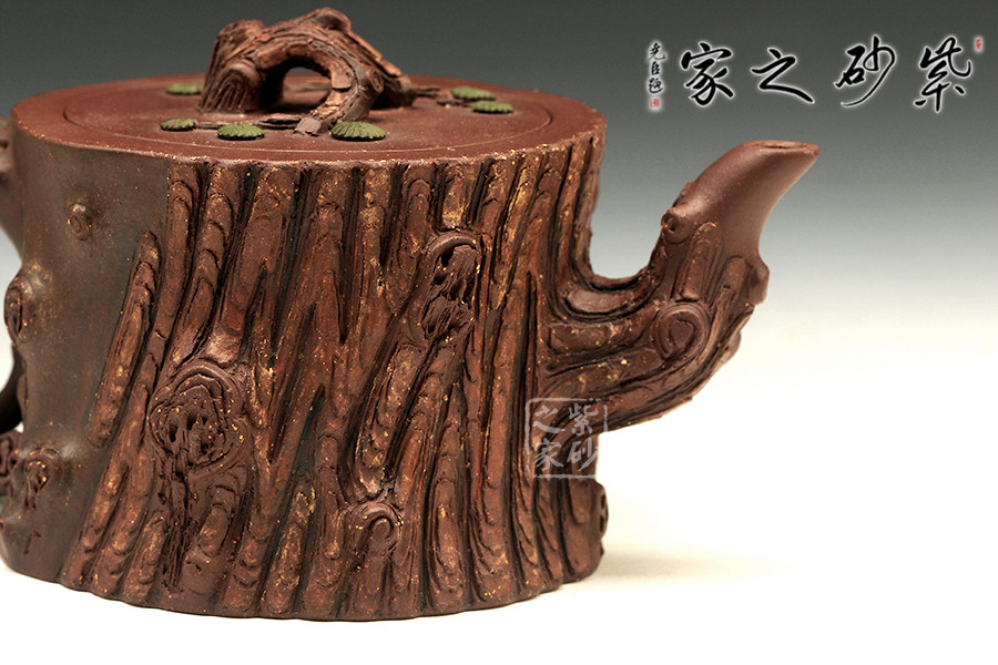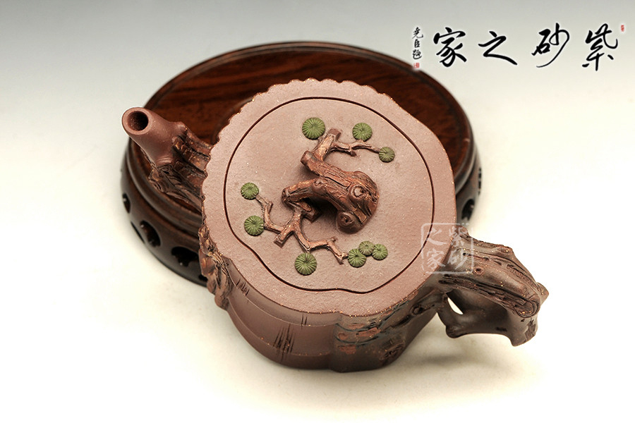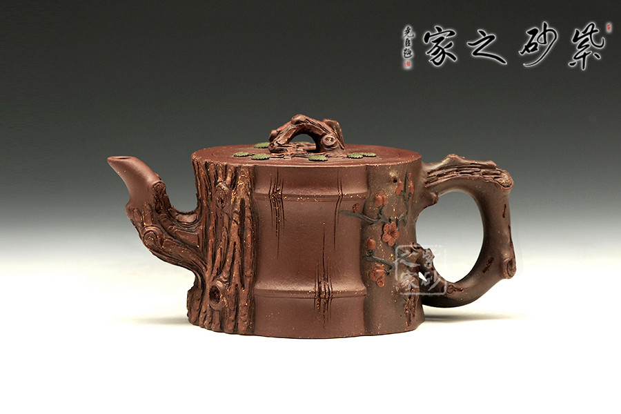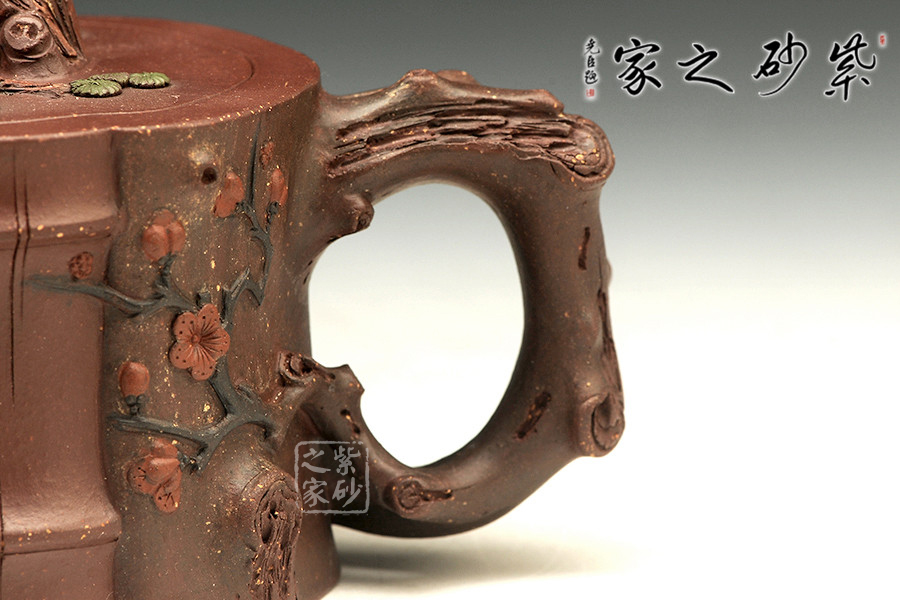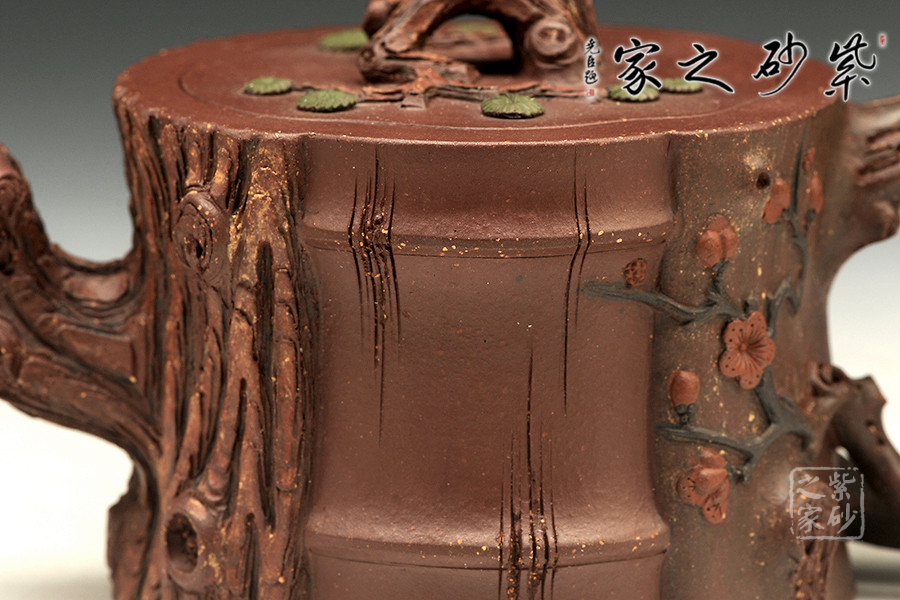 壺把為梅樁,壺身竹段,壺嘴為松枝,壺身三友相互融合,以最樸實的形態(tài)展現(xiàn)最高潔的精神。松皮、松針的滄桑老道,梅枝的高雅精致,竹段質(zhì)樸清幽,無一不表現(xiàn)得淋漓盡致,壺中上品,值得收藏!