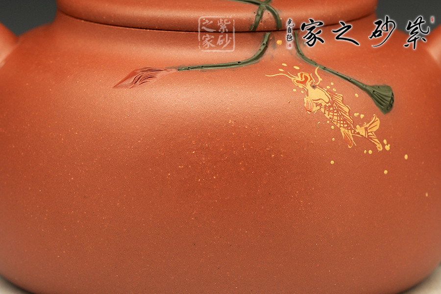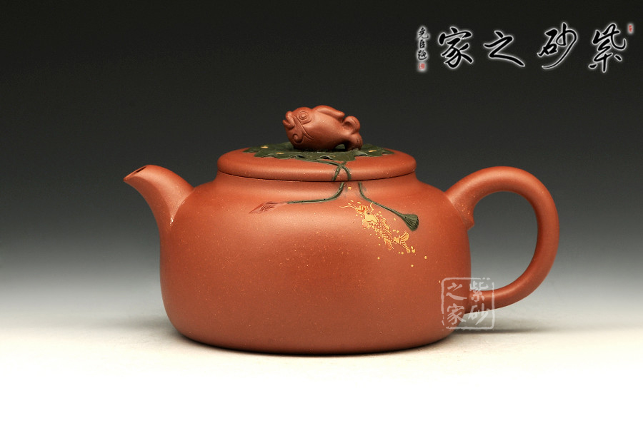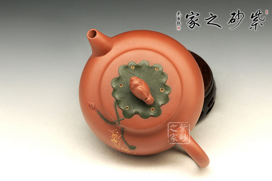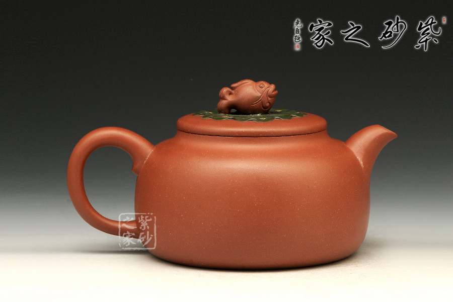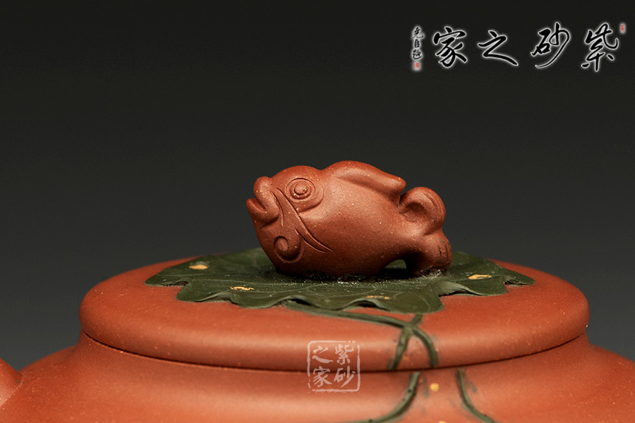 魚戲蓮葉壺,趣味盎然,悠然自得,線條柔和秀雅,作工細致。壺鈕是條游魚,仿生生動,似要躍起,擺頭搖尾,伏于一片荷葉之上,荷葉之下,一尾鯉魚也躍躍欲試,欲登上峰頂。整壺敦實,重心在下,給人踏實感,筆意流暢自然,古風遺韻,賞心悅目,值得收藏。