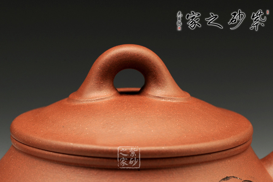 此作醇和自然,色澤古樸典雅。壓蓋,橋梁鈕;蓋形飽滿豐腴,中間微凸;壺鈕圓潤(rùn)光滑,提攜順手;壺的口沿與壺蓋截成一條圓線,口蓋各占一半,蓋子蓋上即合成飽滿的圓線,其對(duì)作者的考量可想而知。嘴為三彎式構(gòu)造,嘴腹粗大至嘴口稍有收縮成圓口出水便利,不滴水流蜒。大耳飛把,略有夸張之感。壺體渾圓,整體觀之,珠圓玉潤(rùn),雍容大氣盡現(xiàn)。