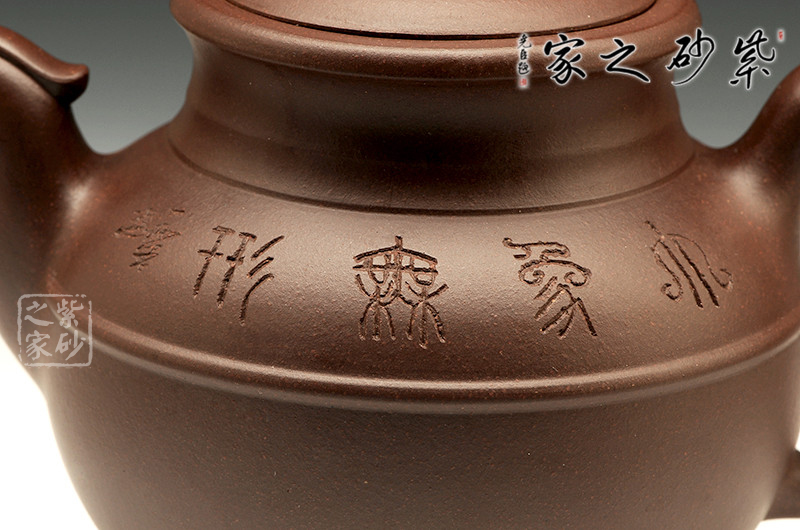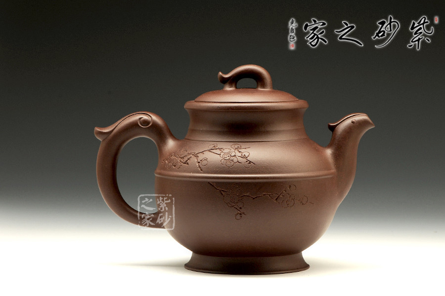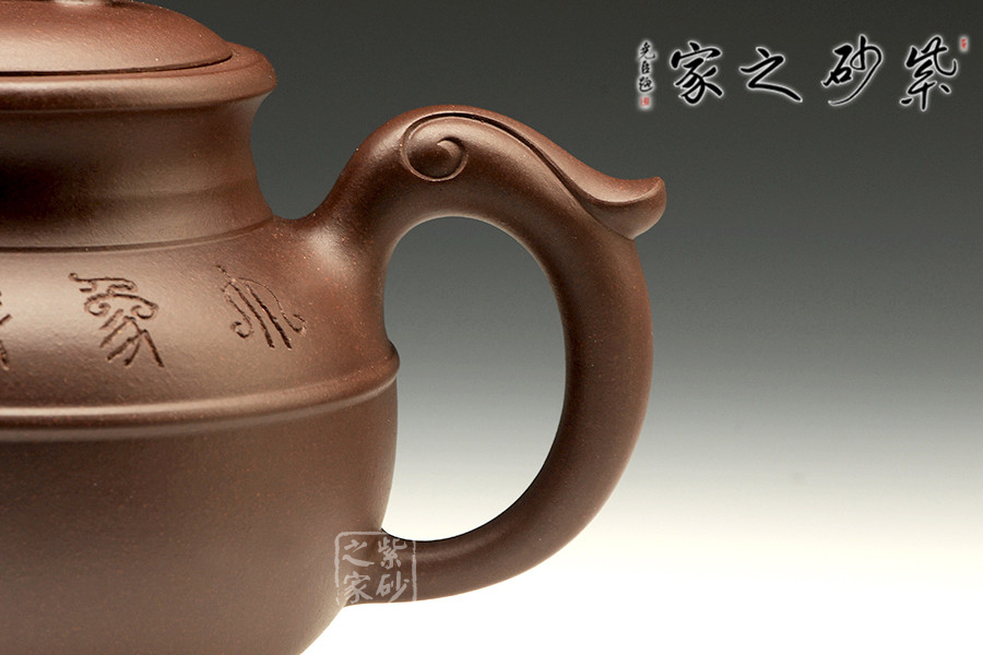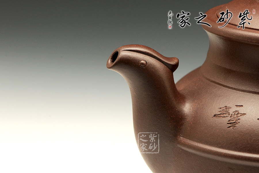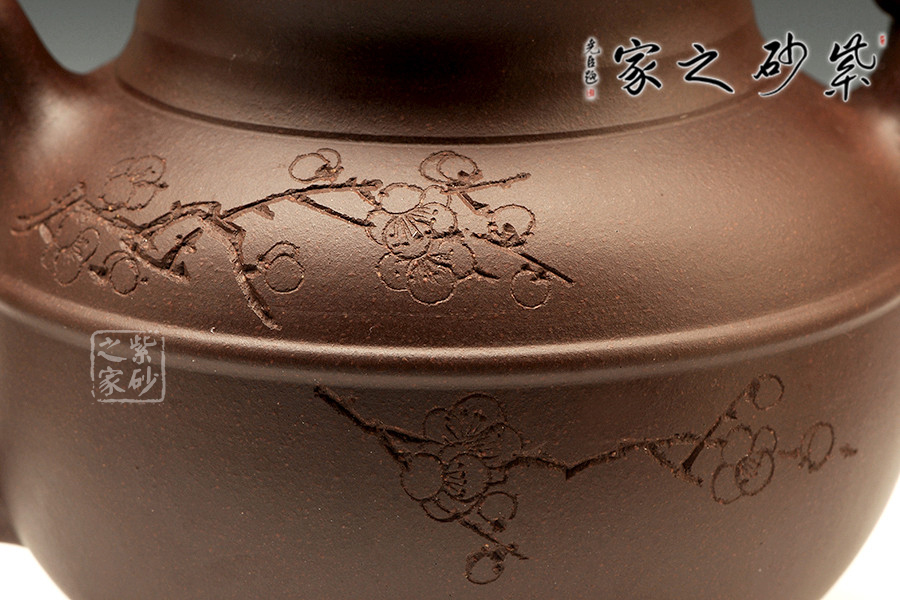 壺身以線圈為軸分成上下兩部分,更顯該壺的恢弘、壯麗。壺身一側(cè)上篆“大象無形”四個(gè)大字,另側(cè)所刻梅花,或簇或長(zhǎng),隨意伸延,呈兼容百態(tài)之勢(shì),不刻意、不張揚(yáng)。壺嘴經(jīng)全手工制作,將鳳凰形象捏制的栩栩如生,不僅出水暢爽而且美觀。壺把為鳳尾,造型秀美,流線型壺把,握感舒適。壺鈕、壺嘴、壺把三點(diǎn)一線,好似天成,無論從哪個(gè)角度看都很完美。