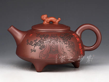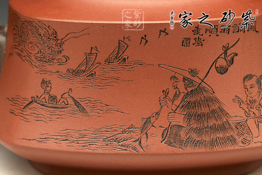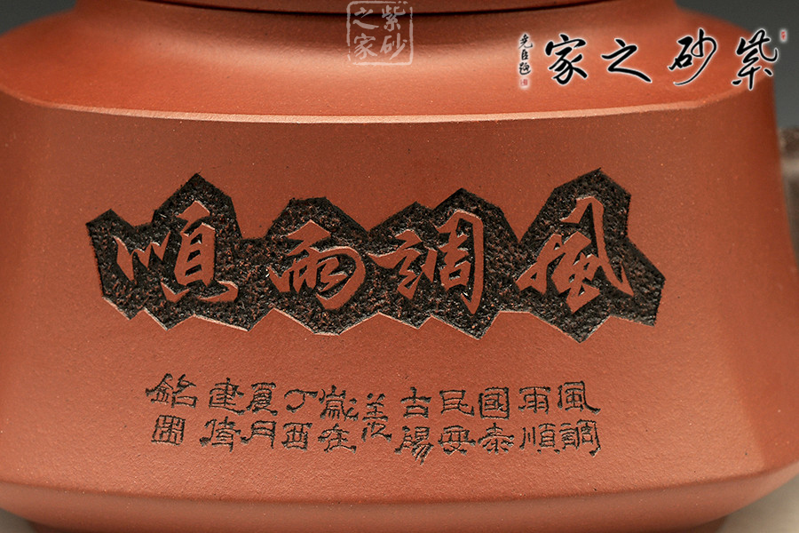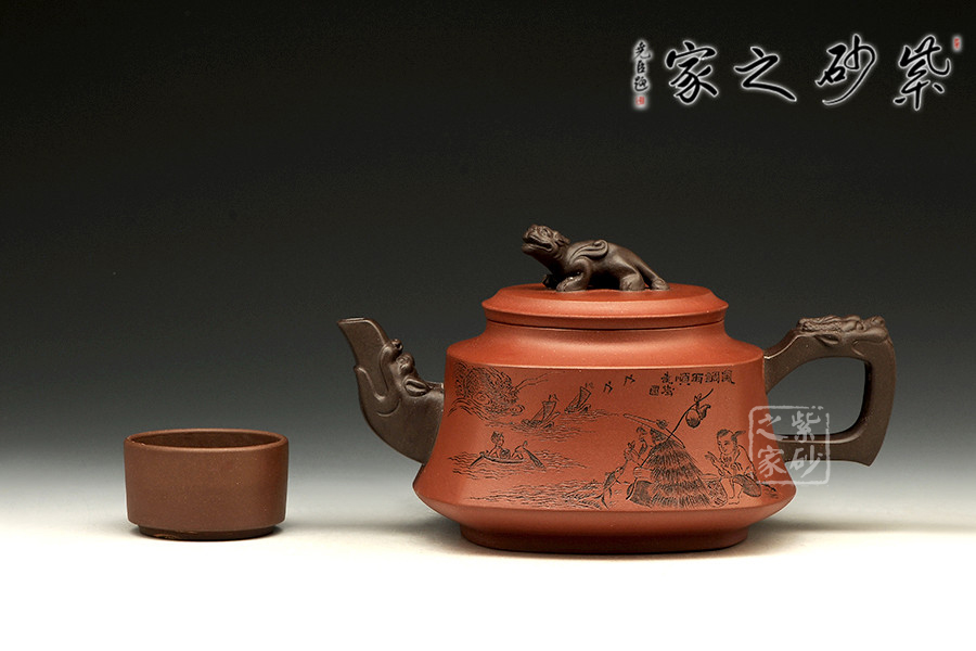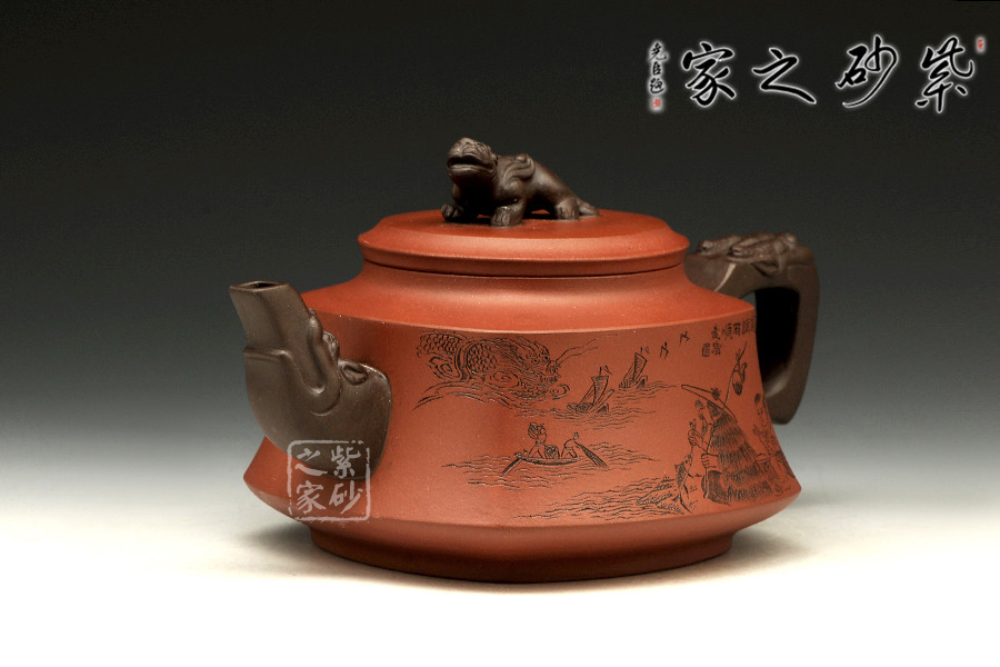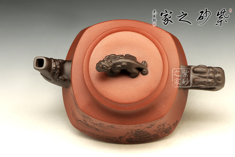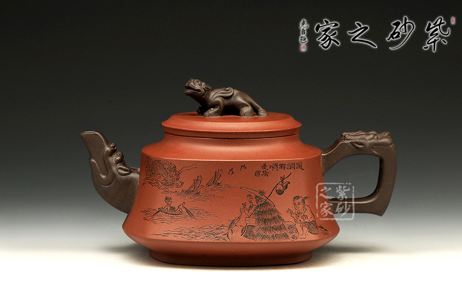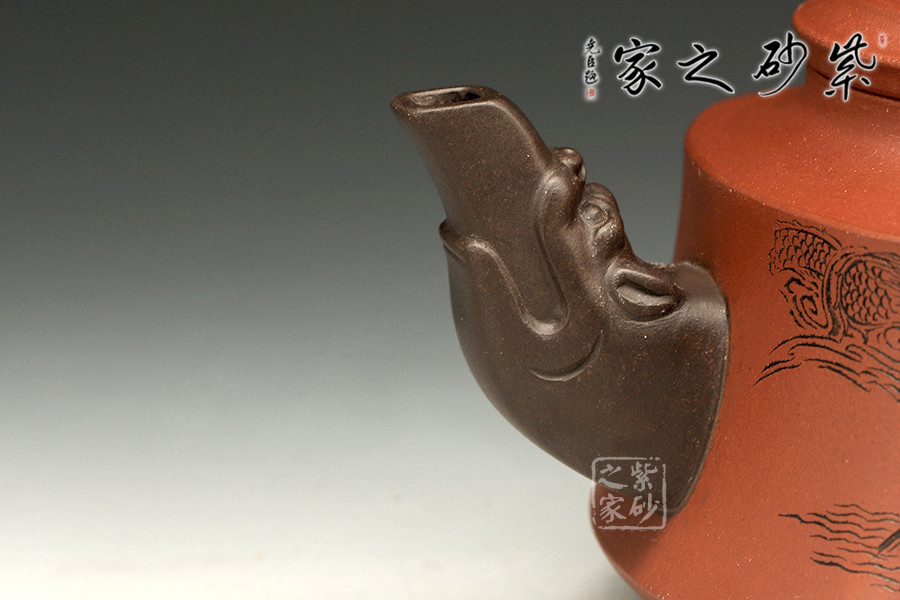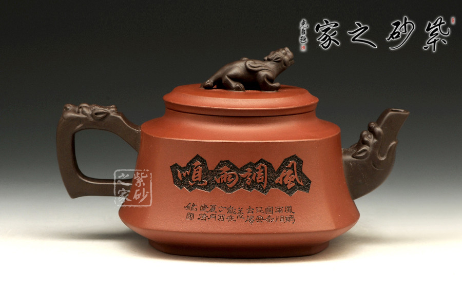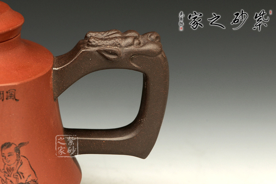 此壺以硬朗的直線為主,挺拔工整,又透出圓潤的溫婉。造型別致,值得收藏!壺身被分為四面,切面圓潤平滑,棱角有度卻分明。肩部為一平面,壓蓋對接嚴密,整體簡潔。壺鈕、壺嘴和把皆以龍形為素,刻畫生動形象,相互交映。