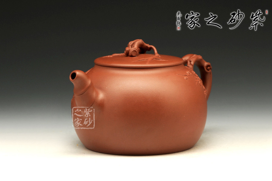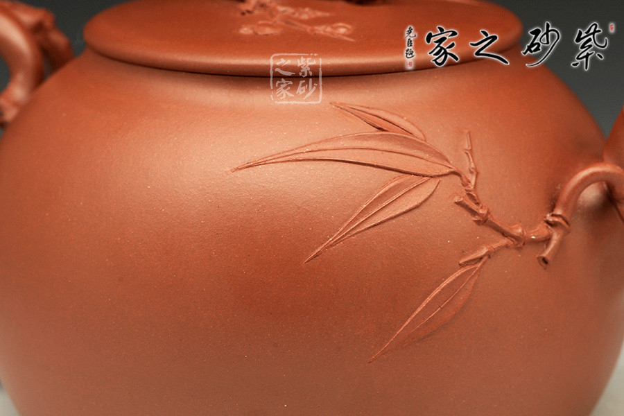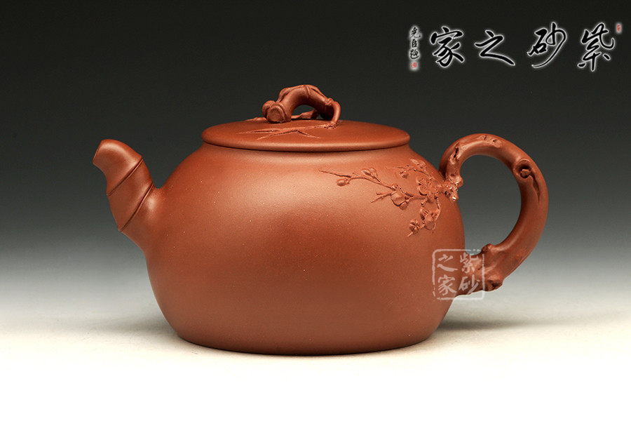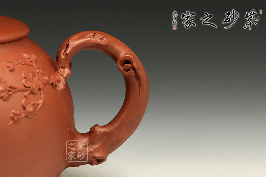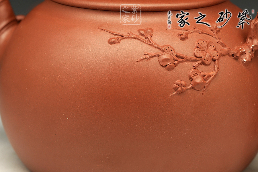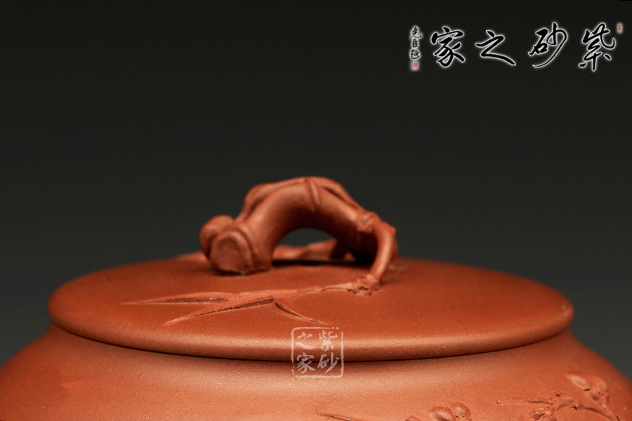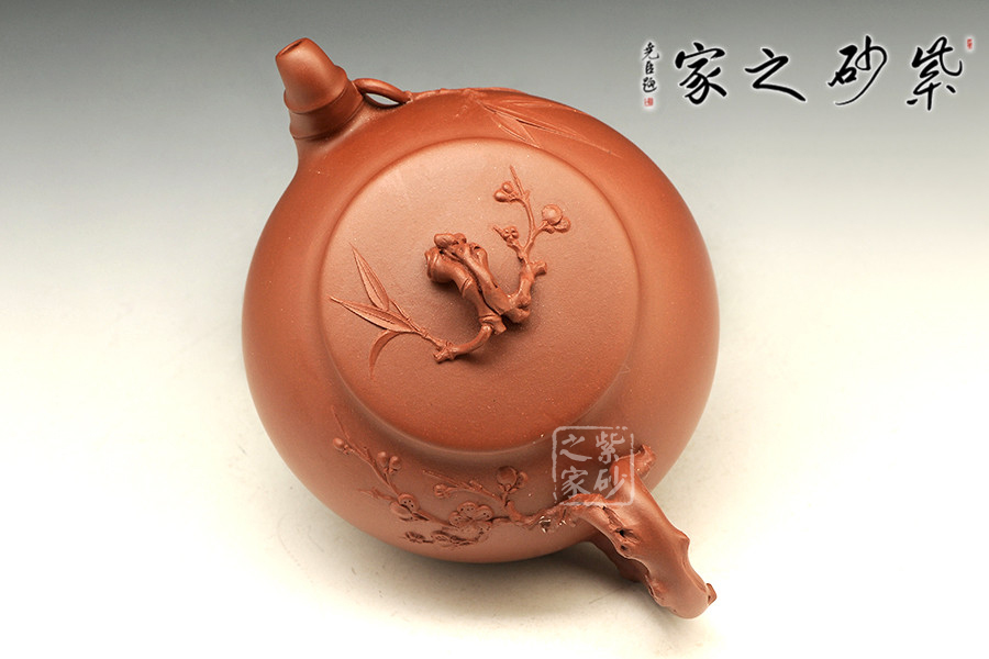 此壺為圓壺,壺身圓潤飽滿,一捺底給整壺穩(wěn)重、踏實之感。平蓋平實,壺鈕由兩瓣拼合而成,一瓣竹節(jié)接以竹葉貼以蓋面,另一半為梅枝,連接點(diǎn)點(diǎn)梅花在蓋面綻放。壺嘴彎流,飾以竹節(jié)紋,并有竹葉綴以壺身;耳型把仿梅枝,伴有梅花綴于壺身,兩者相得益彰,不驕不躁,煞是喜人。
