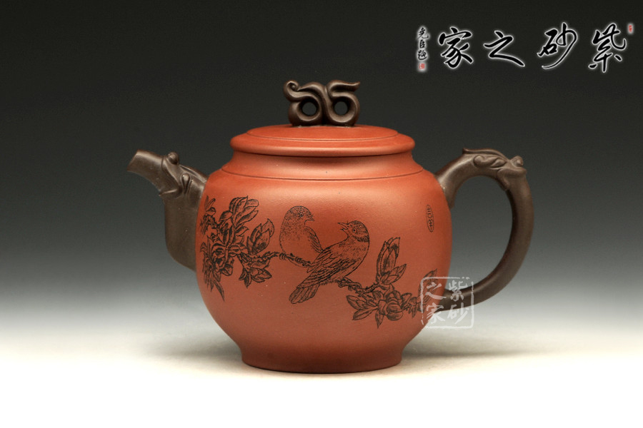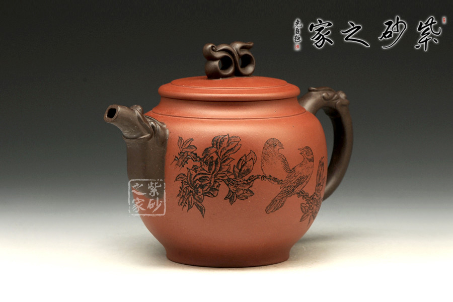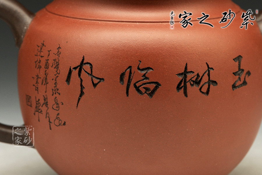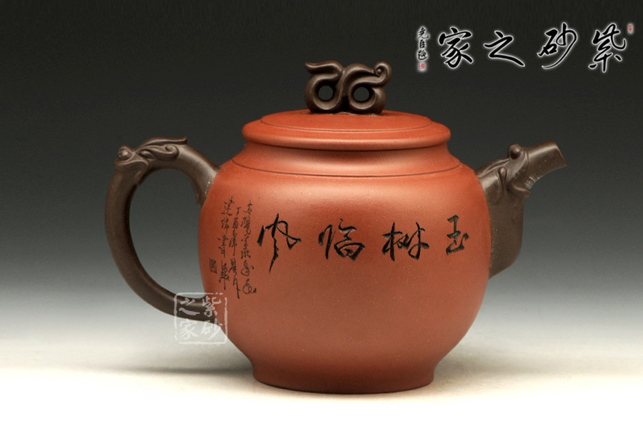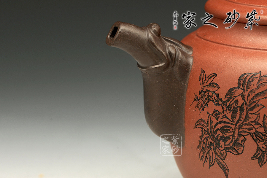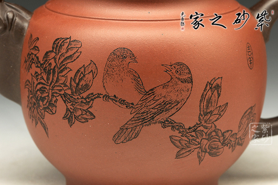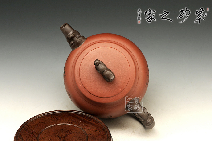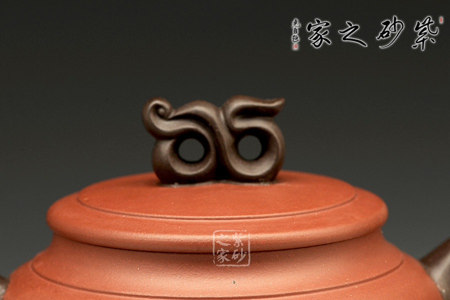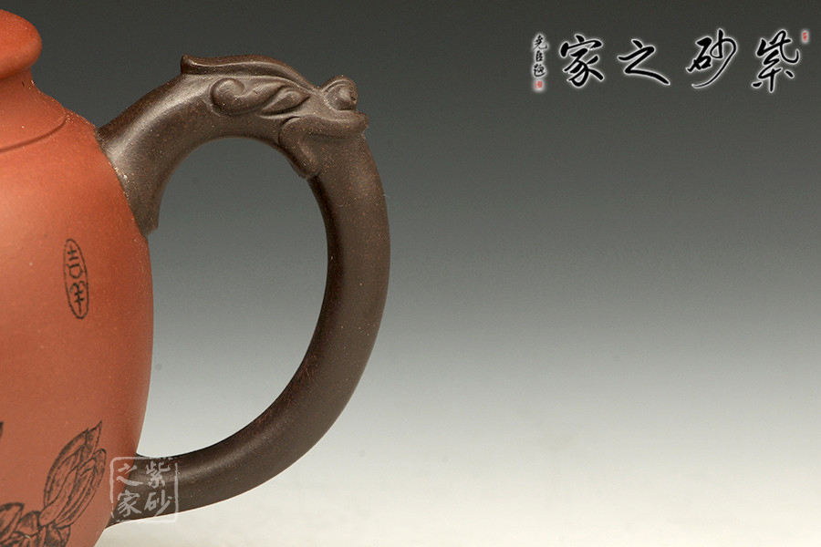 書畫與紫砂藝術(shù)的結(jié)合不但讓作品更具欣賞價值,同時增添作品的趣味性。此壺大肚圓融,以簡練的線條構(gòu)造出厚重穩(wěn)實的作品,一眼看上便覺心清氣爽。彎流和耳把,異色雙龍造型,一吸一納間,水潤流轉(zhuǎn),與壺身結(jié)合自然。壺鈕似水浪翻轉(zhuǎn),抽象異形,可謂造型別致??傮w使人把玩之余,情趣使然!