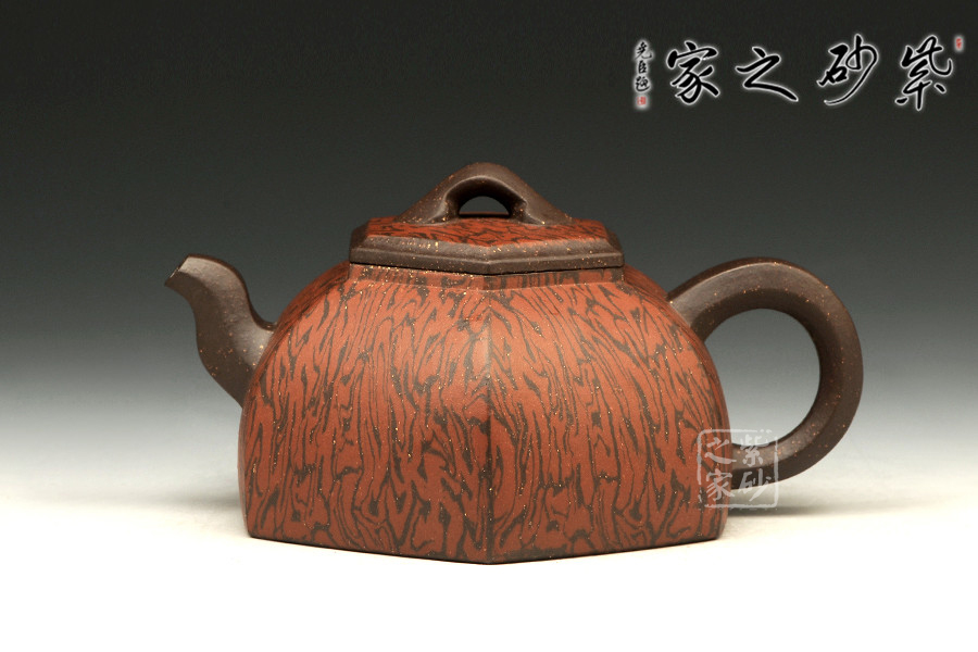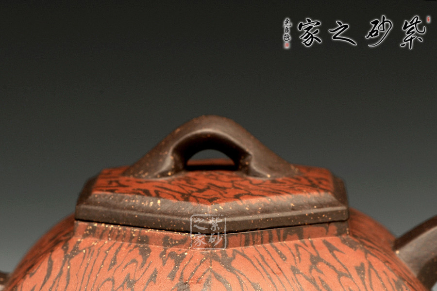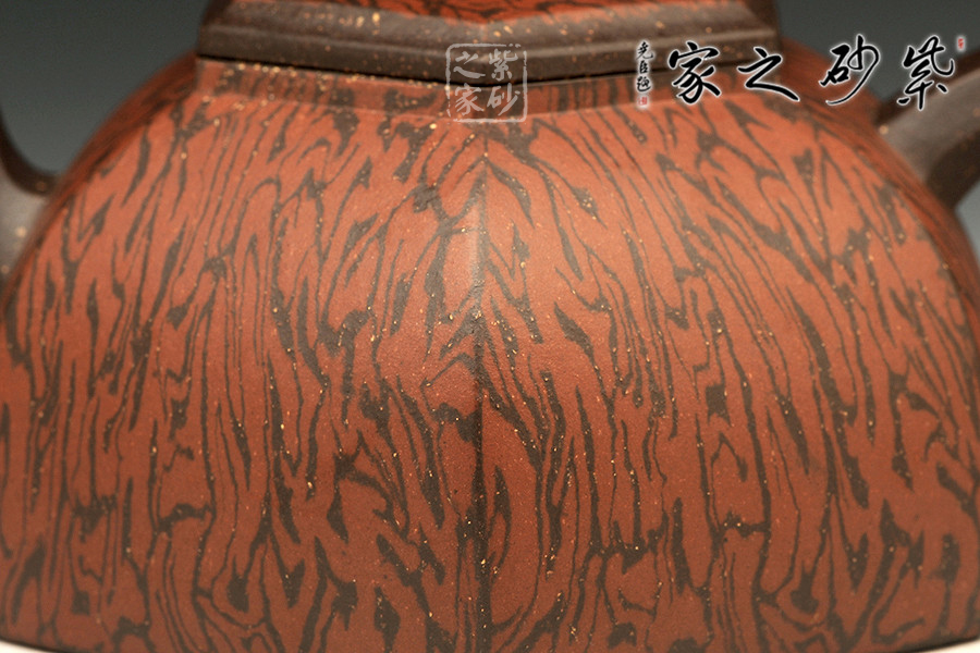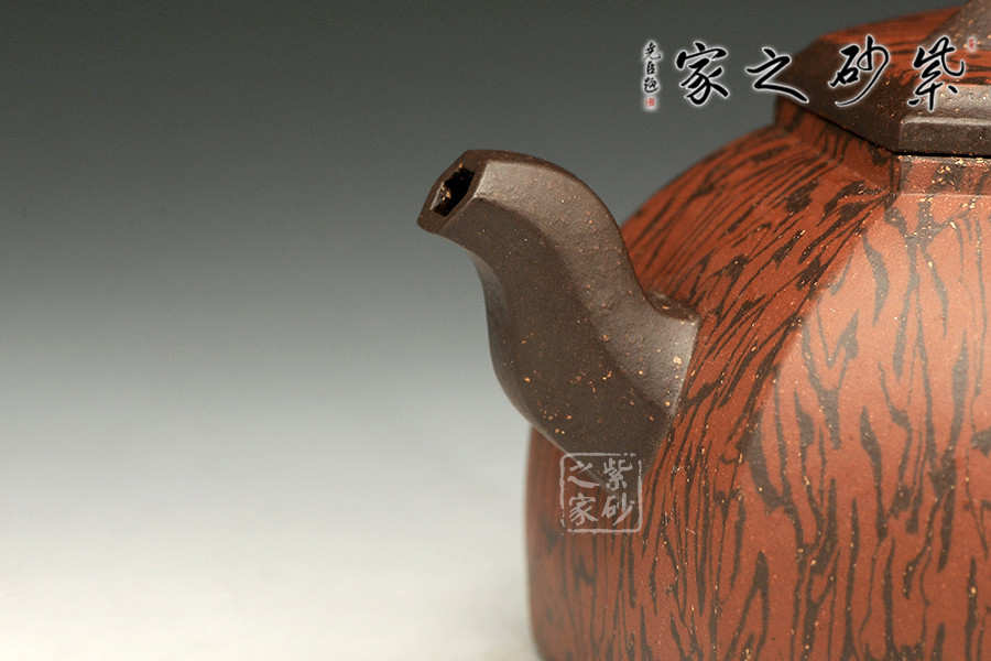 此壺取名六合同春,壺身有六面,圓潤有度,但棱角分明。從上之下,下落有序,整身采用絞泥工藝難度大,制作成本高,平蓋蓋面同樣采用絞泥工藝,整壺融合一體。短頸同樣棱角分明,線條利落。橋鈕、圓把、彎流紫泥調(diào)砂,布滿點(diǎn)點(diǎn)異色,奪目異常,是經(jīng)久愈泡的佳作。
