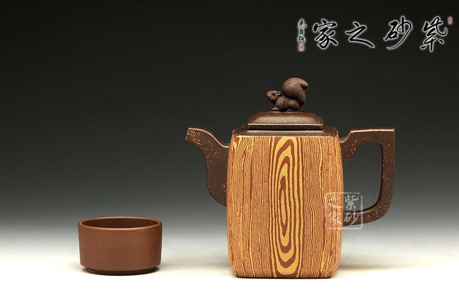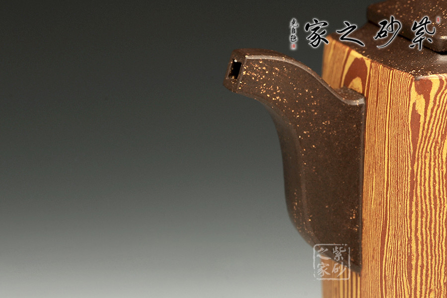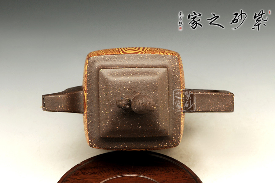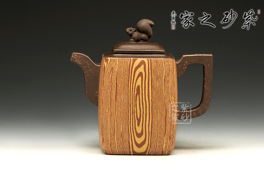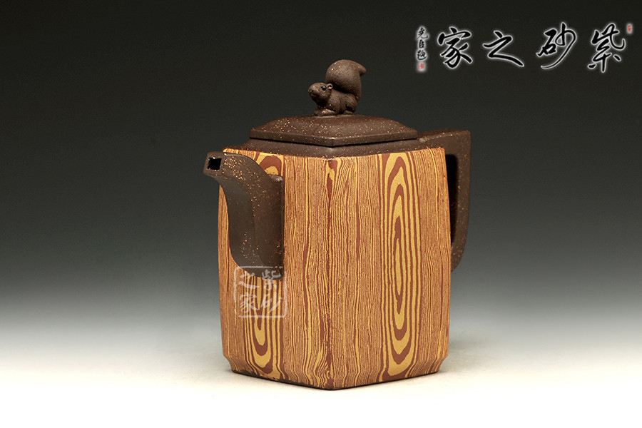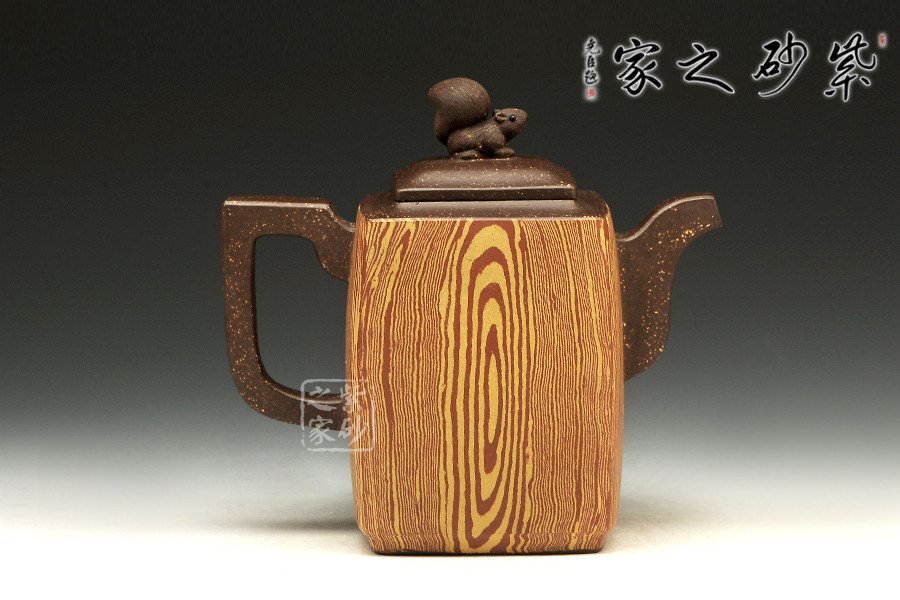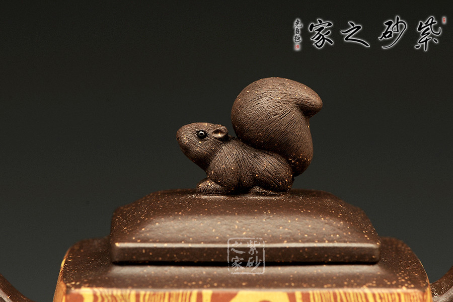 此壺四方長(zhǎng)壺,壺身采用絞泥工藝,除壺身外,皆使用原礦紫泥,加之調(diào)砂工藝,金光閃閃,星星點(diǎn)點(diǎn)。彎嘴勢(shì)大,出水迅猛,壺把輪廓清晰,把大拿捏舒適,四方壺蓋與口沿吻合嚴(yán)密,壺鈕是只小松鼠,自然生動(dòng),毫毛都清晰可見(jiàn),既寓意萬(wàn)代綿長(zhǎng),又有聚財(cái)之意,整壺充滿(mǎn)勃勃生機(jī),是收藏把玩的佳品。