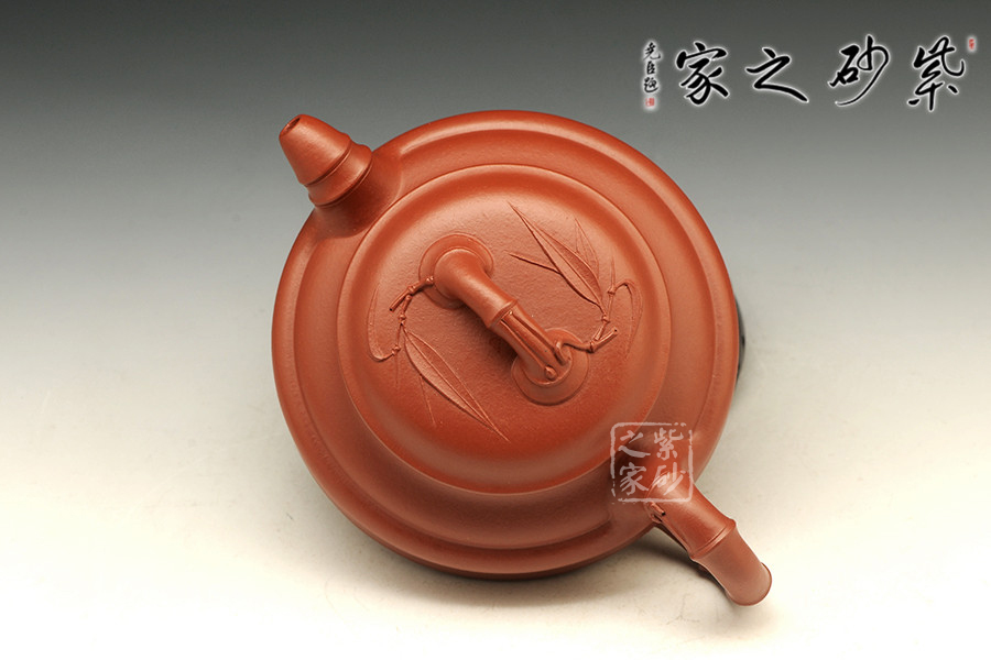 壺以竹為題材,夸張變化成形,壺身塑成主干,竹節(jié)簡潔有致,中正沈穩(wěn)。流、把化為新抽嫩枝,動(dòng)勢內(nèi)醞,生動(dòng)有力。蓋上堆塑屈曲的竹枝為橋形鈕,鈕下貼塑竹葉紋飾。蓋口平整,光滑細(xì)膩,端莊高雅,精細(xì)竹貴,是手工壺中的珍品。