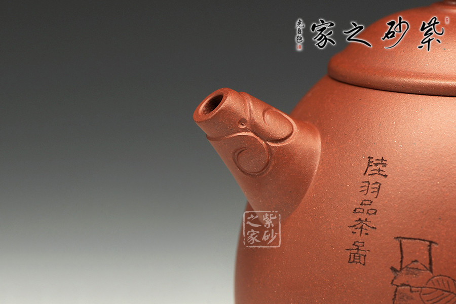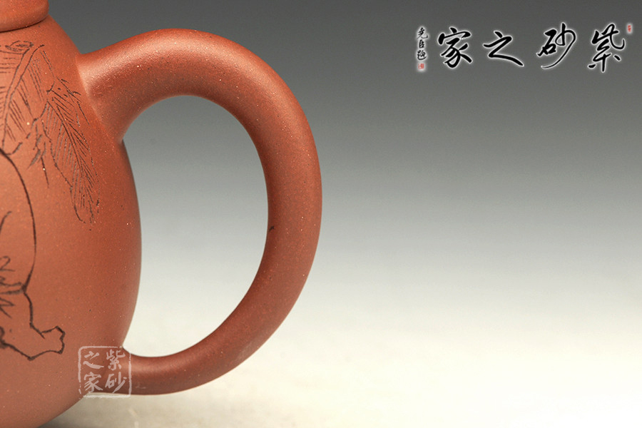 此壺通體狀似蛋形,截蓋,圓珠形壺鈕如同明珠,直流嘴,大圈把勢(shì)與壺體趁勢(shì),壺體下部過(guò)渡平緩。整器線條流暢自然,有如一氣呵成,體現(xiàn)出作者高超精準(zhǔn)的技藝,給全器平添一種拙味和稚氣的親切感。