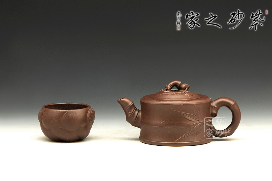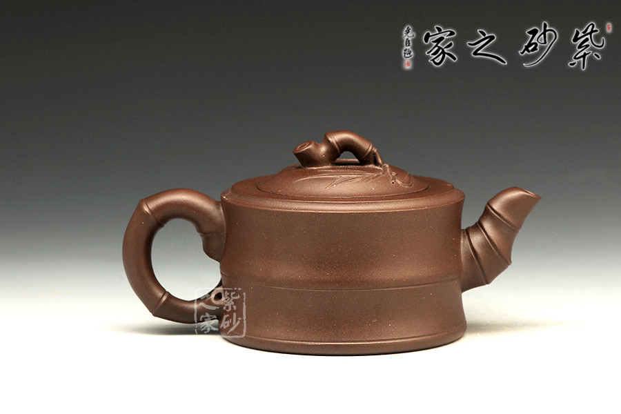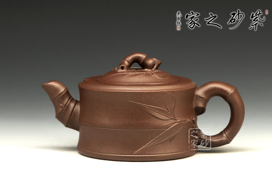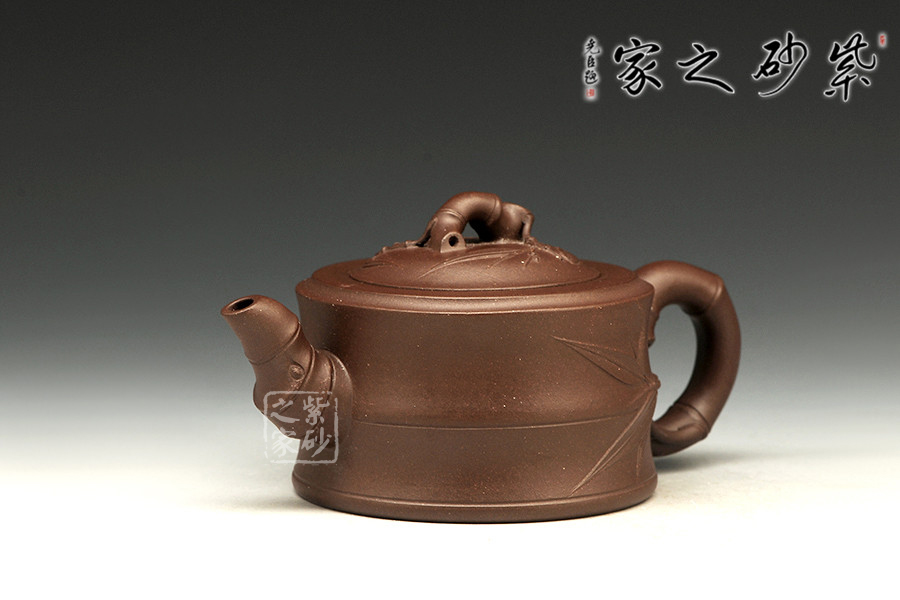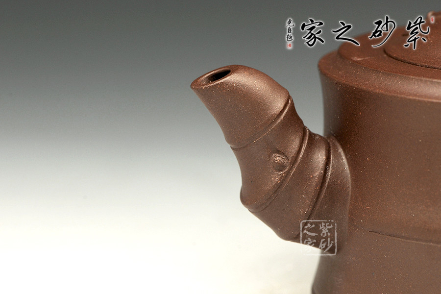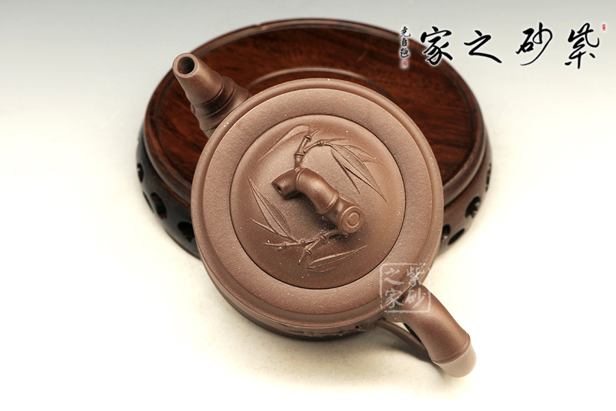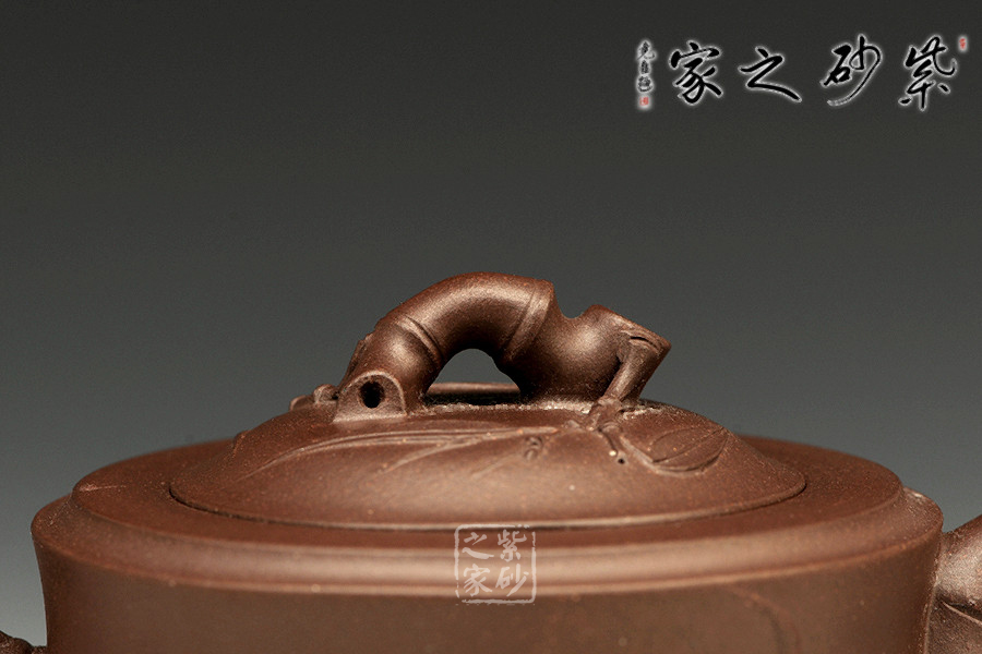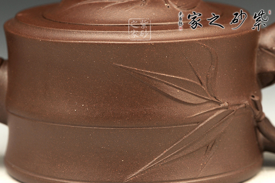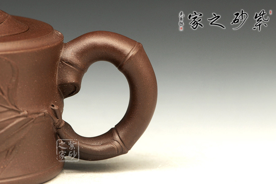敦實的壺身,全身多處采用竹節(jié)形制,可感覺到竹的靈氣。彎曲的竹枝為壺嘴和壺把,卷曲有度。嵌蓋設計吻合嚴密,恰到好處的仿制了竹的靈動,又不顯呆板。壺鈕同樣一截彎曲自然的竹節(jié),延伸片片竹葉,飄逸灑脫,高風亮節(jié)。壺身同樣貼片竹葉,形象生動,整壺得到了藝術的升華,給人以無限遐想的空間和無法忘懷的魅力。