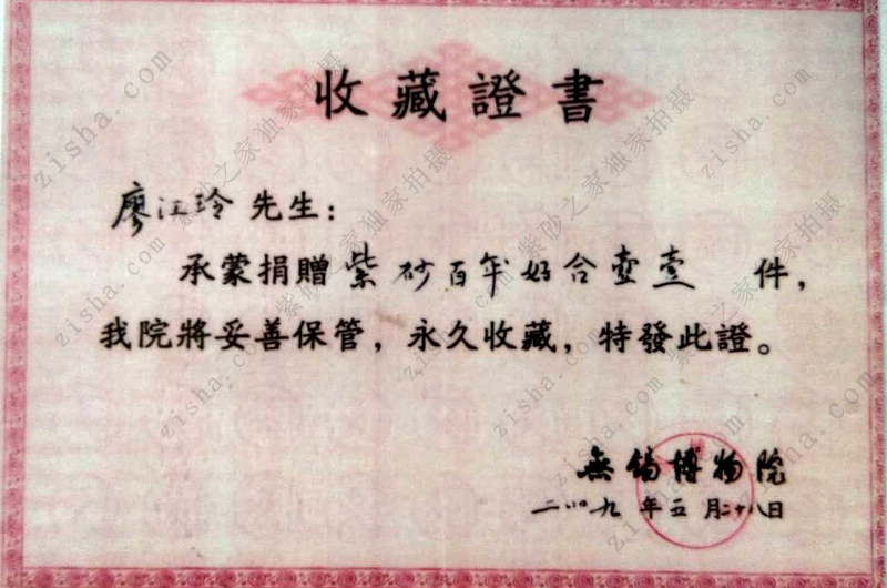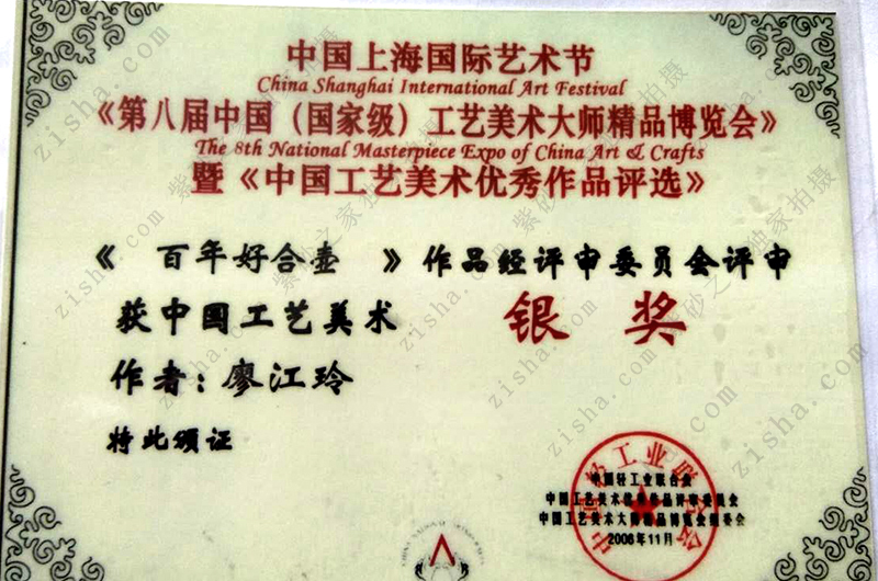 2009年5月 廖江玲女士的『百年好合壺』被無錫博物院永久收藏。此前該作品已獲得工藝美術(shù)博覽會(huì)銀獎(jiǎng)。