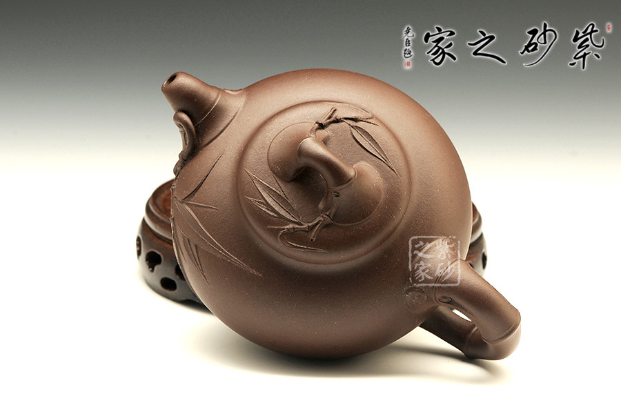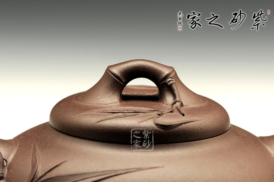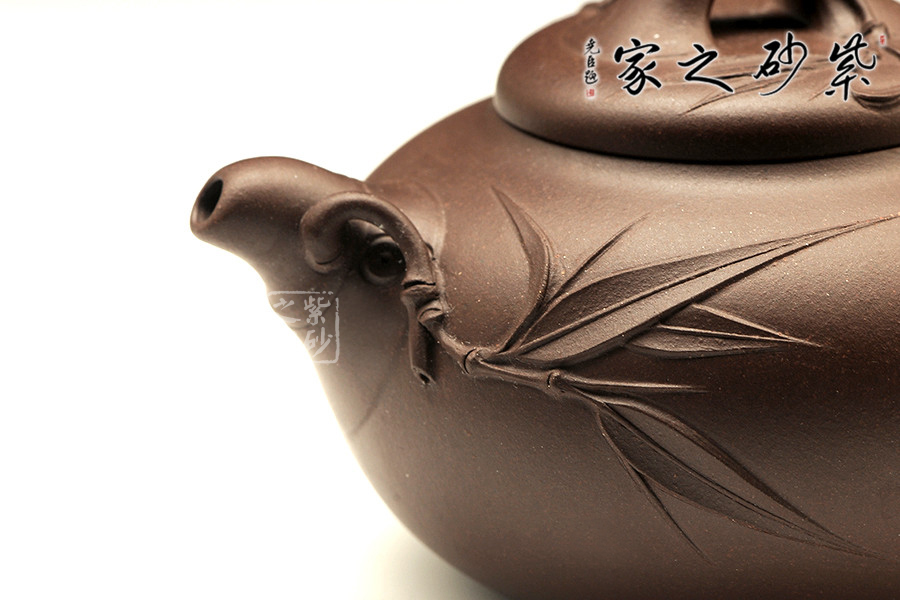整器為飽滿的圓器,壺蓋設(shè)計不同于往,清秀雅致。壺鈕、壺嘴、壺把均為竹節(jié)制成;壺嘴簡短精悍,包嘴設(shè)計不易流延;壺把大方自然,拿捏舒適,上邊節(jié)痕累累,與壺嘴相映成趣;壺鈕為橋形鈕,還有點點斑節(jié),一根細(xì)枝竄出,片片竹葉貼于蓋面;壺身一側(cè)也是連接壺嘴竄出一枝竹葉,安于壺身,富有生氣。此壺充滿閑適、舒展、輕松的情態(tài),線條與器型都流露出閑適之情,逸趣橫生。