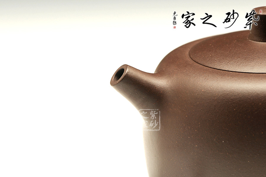 此壺周身皆由弧線構成,線條圓融有力,簡潔明快。壺身難圓似方沉穩(wěn)而不凝帶,直嘴短如鷹喙,簡單流利,端把似耳垂一樣圓潤肥大。壺身光滑的幾何形態(tài),顯得古樸而又優(yōu)雅,手感也十分細膩。觀此壺, 猶似任爾風吹雨 ,我亦悠然閑庭度 ,可稱之壺之隱者。