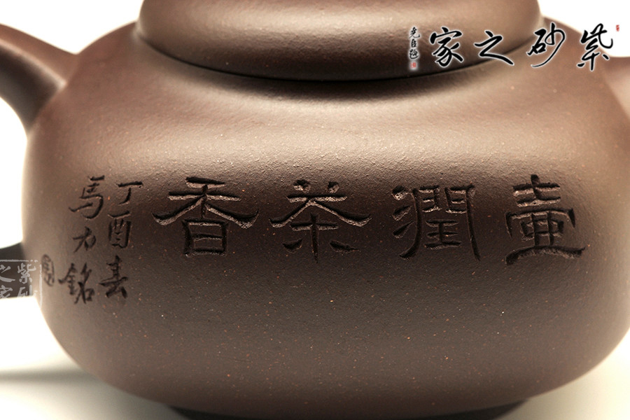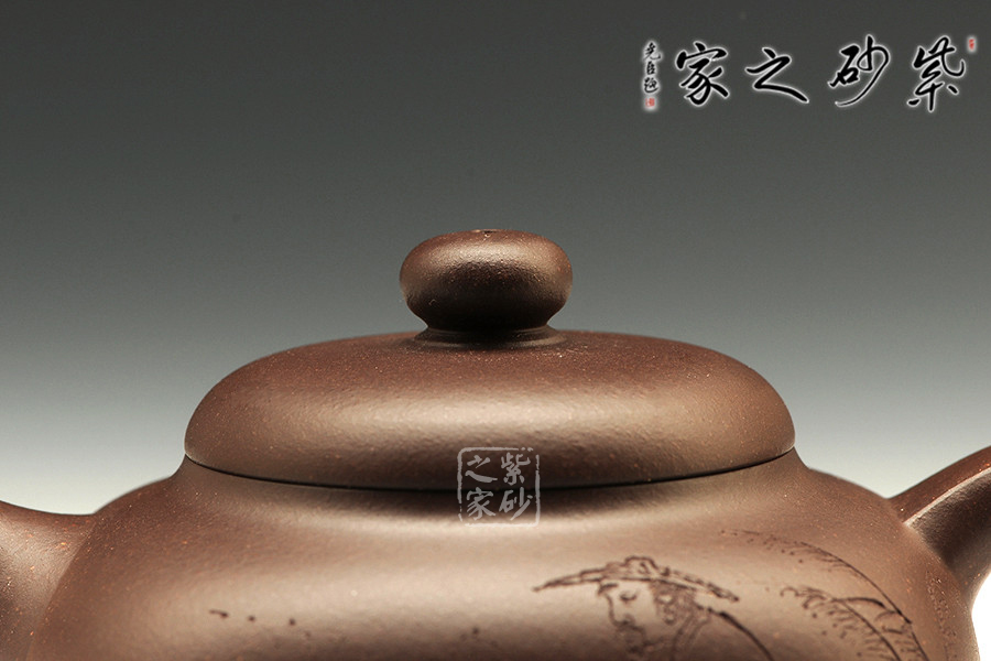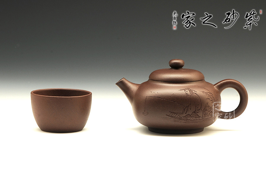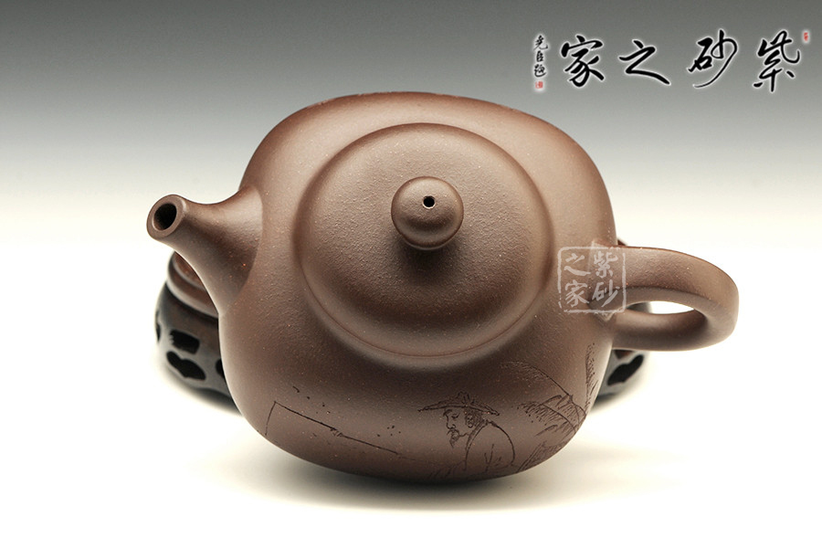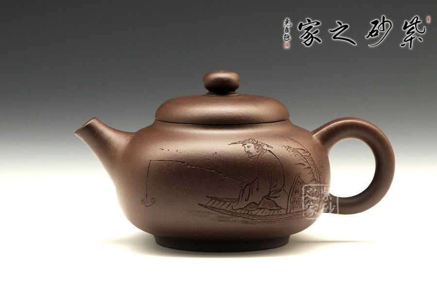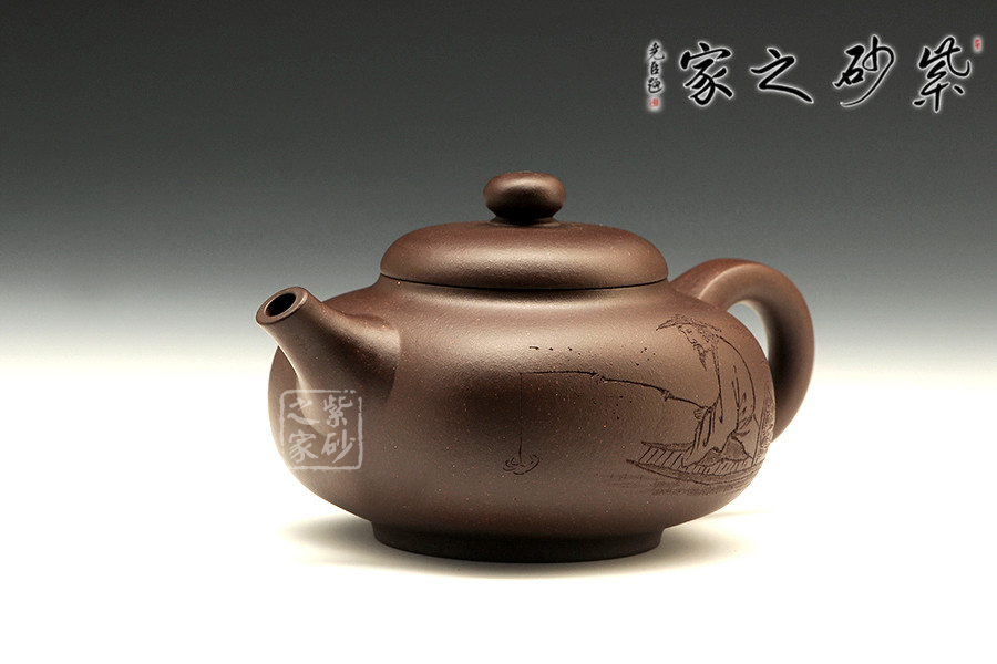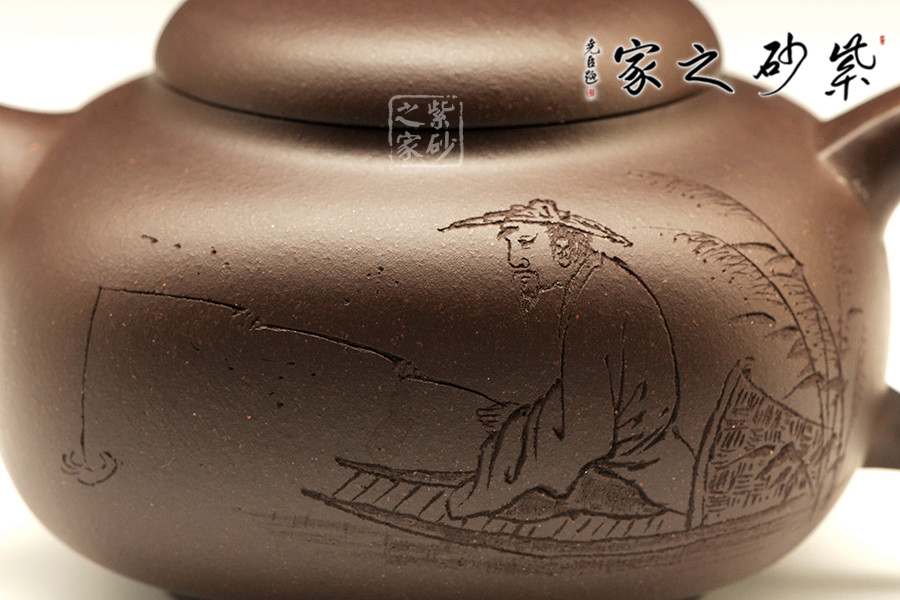此壺顏色略紫,彰顯高貴優(yōu)雅的氣質(zhì)。型方中見圓,圓中寓方,暗喻地闊天圓;壺嘴銜接自然,出水流暢,壺把彎曲有度,端握舒適。壺身刻繪漁翁垂釣圖,“孤舟蓑笠翁,獨(dú)釣寒江雪”。此壺做工精湛,明針處理細(xì)膩到位,實(shí)是為君量身打造的沖茗佳作。