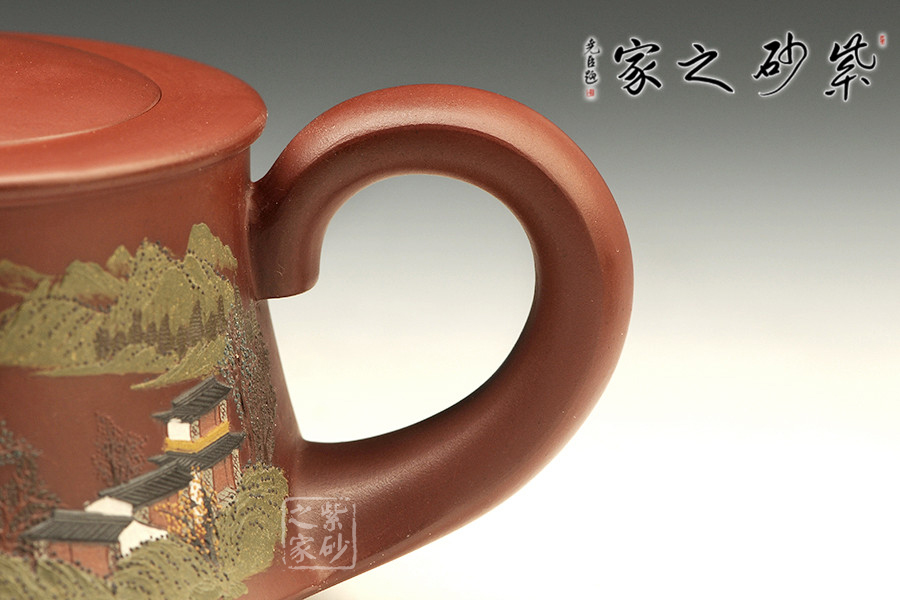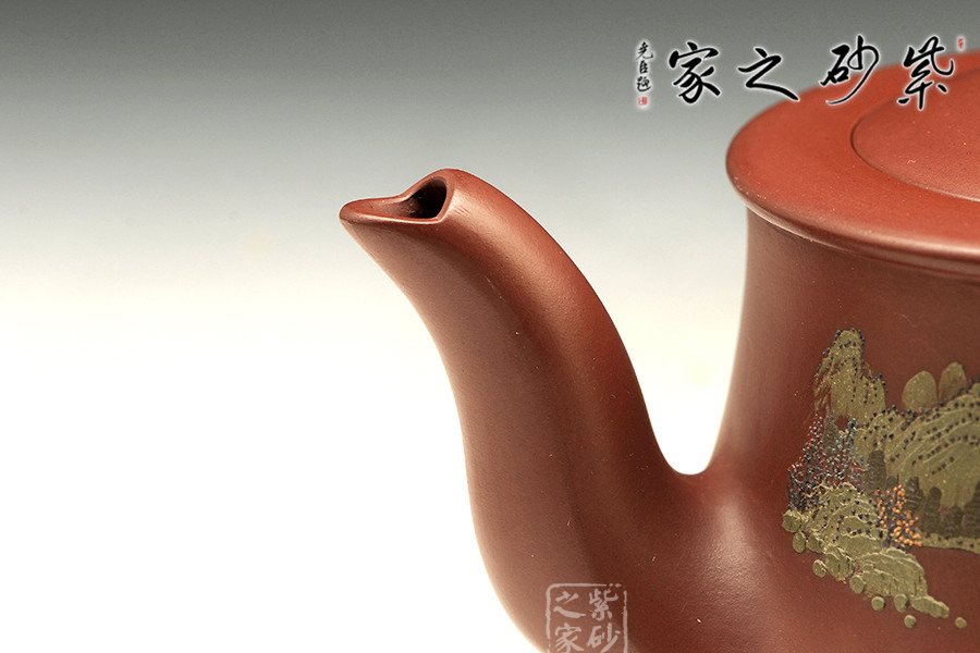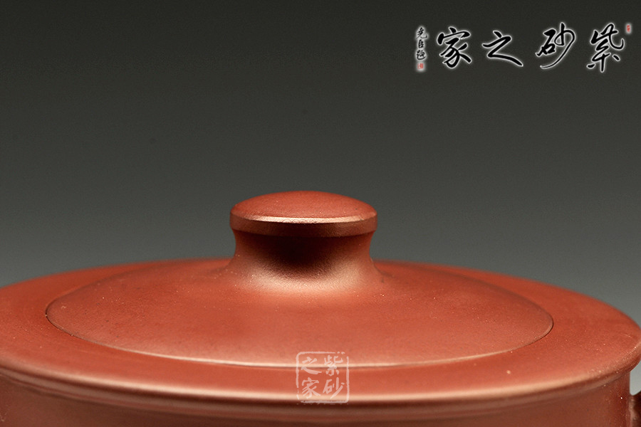 此壺做工很細致,色澤古雅,底蘊十足。整款壺為柱形,上窄下寬,壺底如同一個盤子與壺身相接而成,相交處可見一條腰線,力蘊十足。壺嘴與壺把皆從底部腰線延伸而至,自然過渡,線條粗礦;壺把嘴口朝天,壺嘴自然形成一個折口,出水利落;壺把從下而上,逐漸細致,形成一個漂亮的耳把。圓的子,嵌蓋,氣密性極好,歷久彌新,足見功力。
