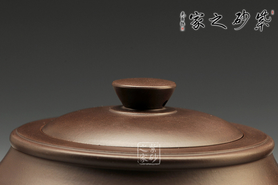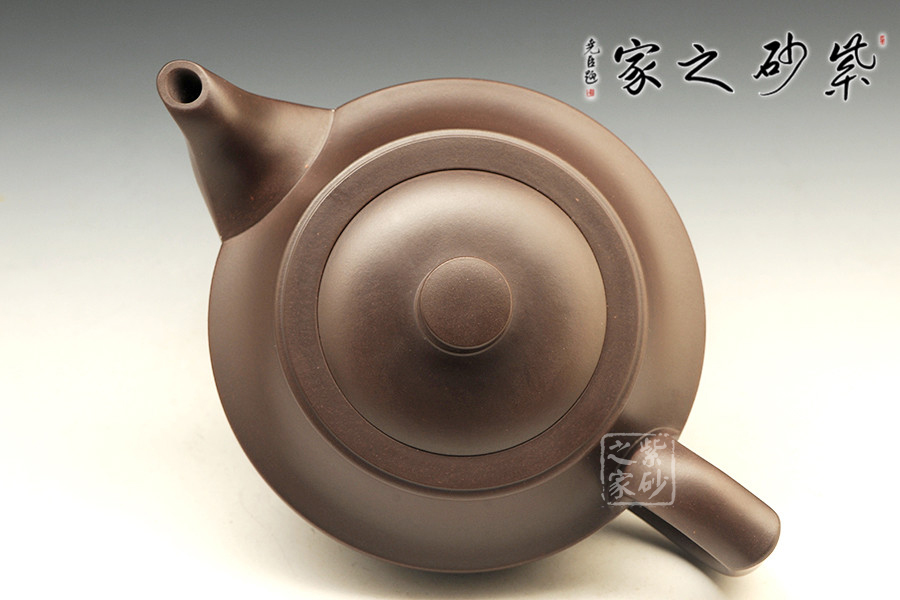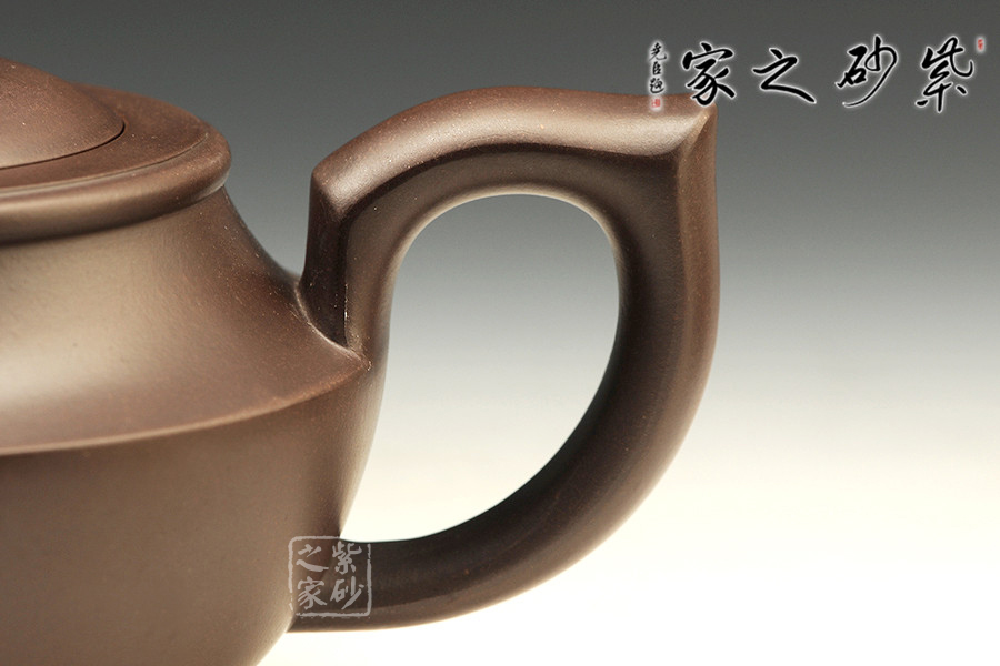 整壺為圓壺,圓腹飽滿,肩線明顯,為整壺增添一份剛毅之美。內(nèi)陷的肩部與頸部合二為一,襯托出線條之美,嵌蓋設(shè)計(jì)讓壺蓋與口沿融合一體,微鼓的蓋面,壺鈕與壺身造型相呼應(yīng)。壺嘴與壺把從肩線延伸兩端,能明顯看見兩條棱線,彎嘴平舌出水爽利,耳型把做工精巧,飛把拿捏有力,不可多得的工藝精品。