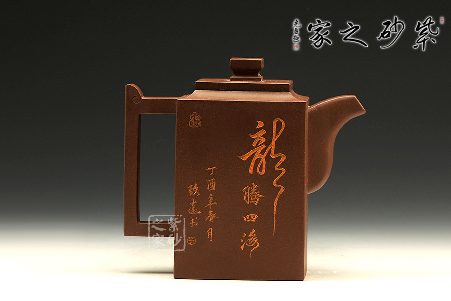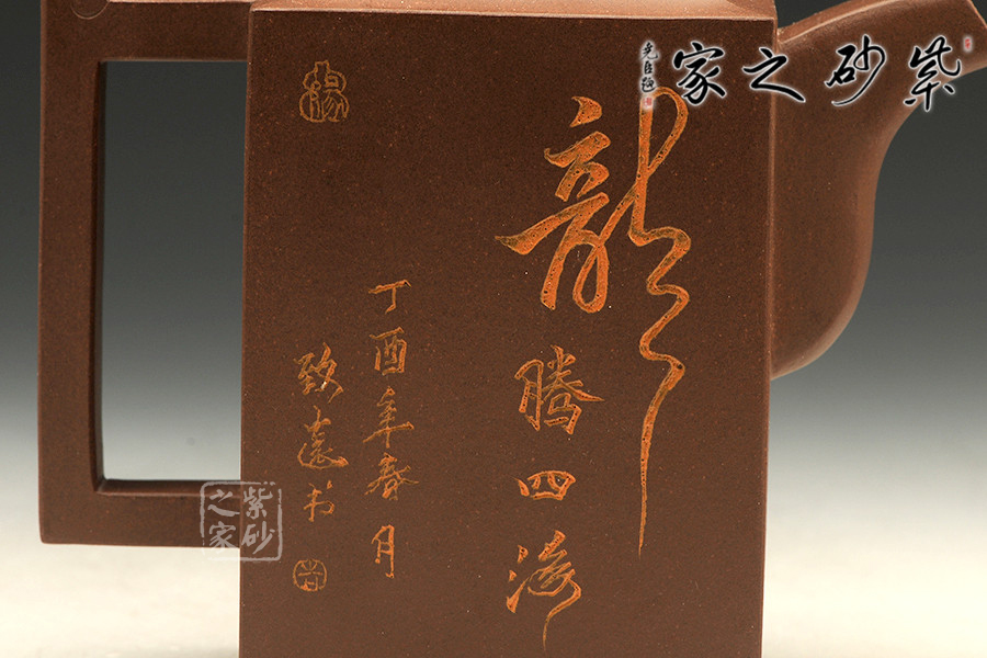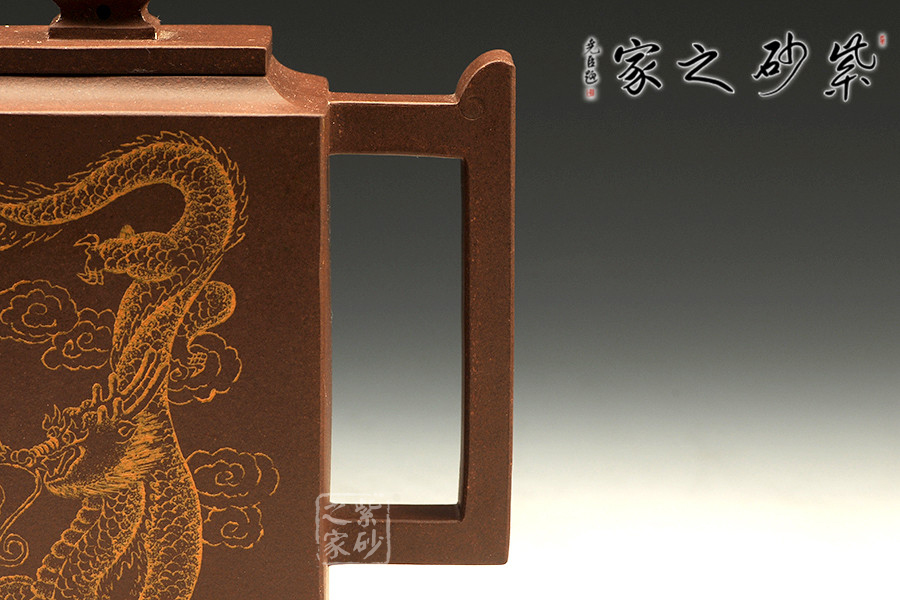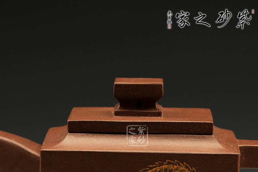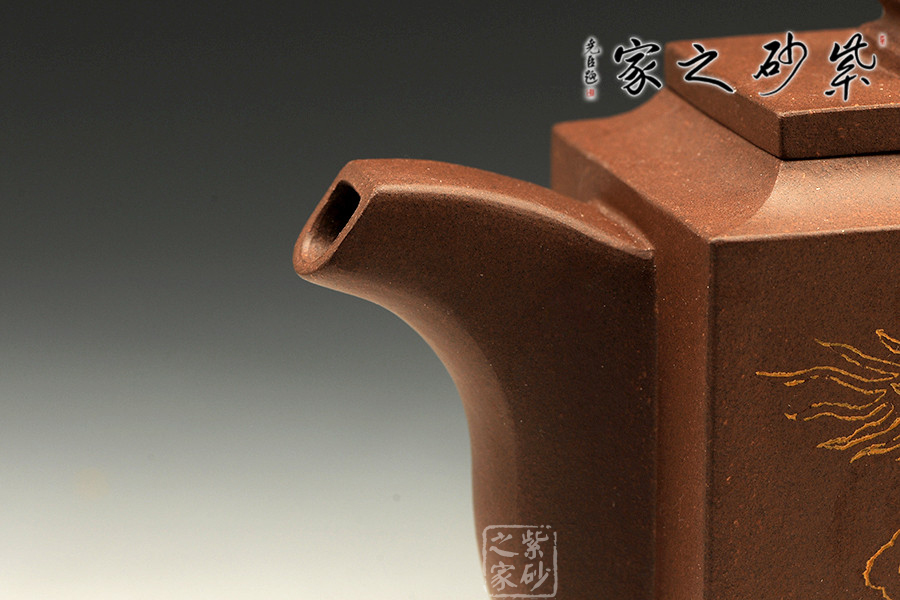 壺身上下線條筆挺,四個面光滑整潔,雙面描金刻繪,給此壺增加靈動氣質(zhì)。平蓋設(shè)計簡練而生動,方形鈕與壺蓋呼應(yīng)。壺把和壺嘴則是相互對應(yīng),以方為基礎(chǔ),又加入曲線裝飾。壺嘴粗且厚重,壺把卻細(xì)而靈動。一粗一細(xì),相映成趣。