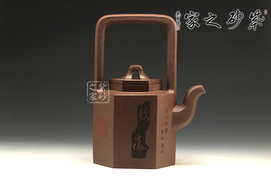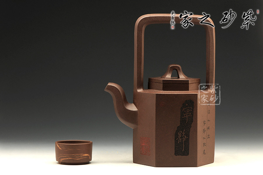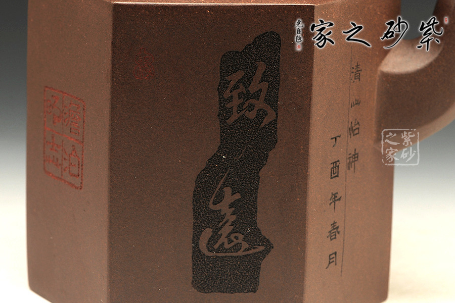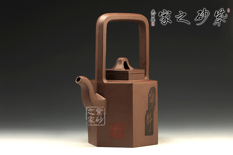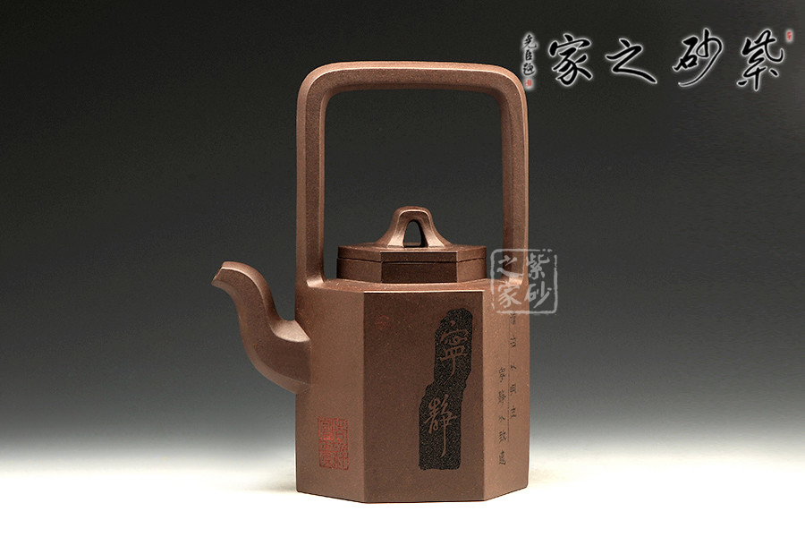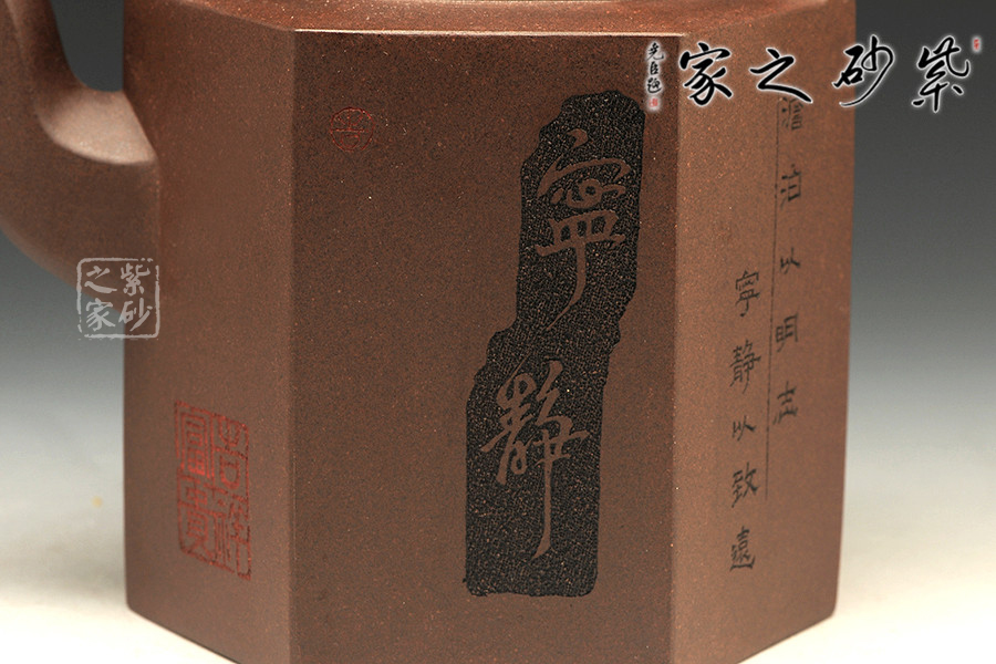 六方提梁因壺似六方柱形而得名,六方使壺體更端莊大器。在造型上似有方方正正之感,卻能讓線條更加俊朗有力,增加壺體的力量之美。三彎流的壺嘴使得出水不斷流,六方的造型與壺身呼應(yīng)。提梁把更是剛正不阿,為整壺增添美感,長拱形的壺鈕也十分精致。壺身六面均有刻繪,前后呼應(yīng),正面“寧靜”,反面“致遠(yuǎn)”,并配有兩面印章《吉祥富貴》、《澹泊明志》,靜能使人心明神清,慧增開悟,只要你保持一種超然清靜的心境,守住一片溫馨的寧靜,生命將會變得更加純凈,事業(yè)將會更加輝煌。