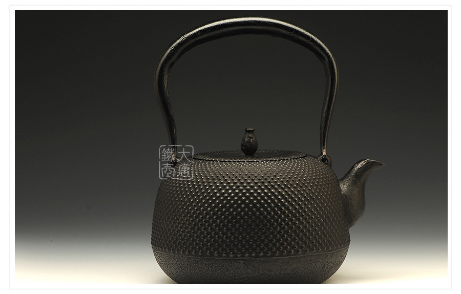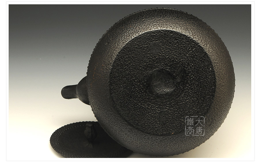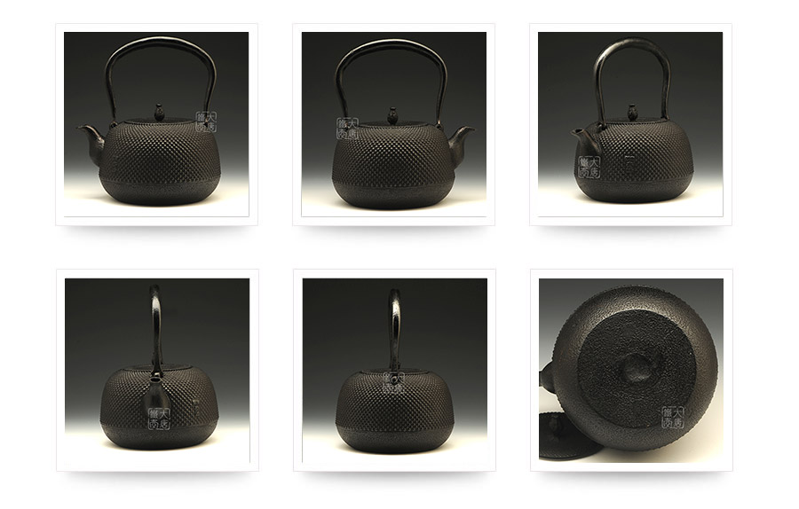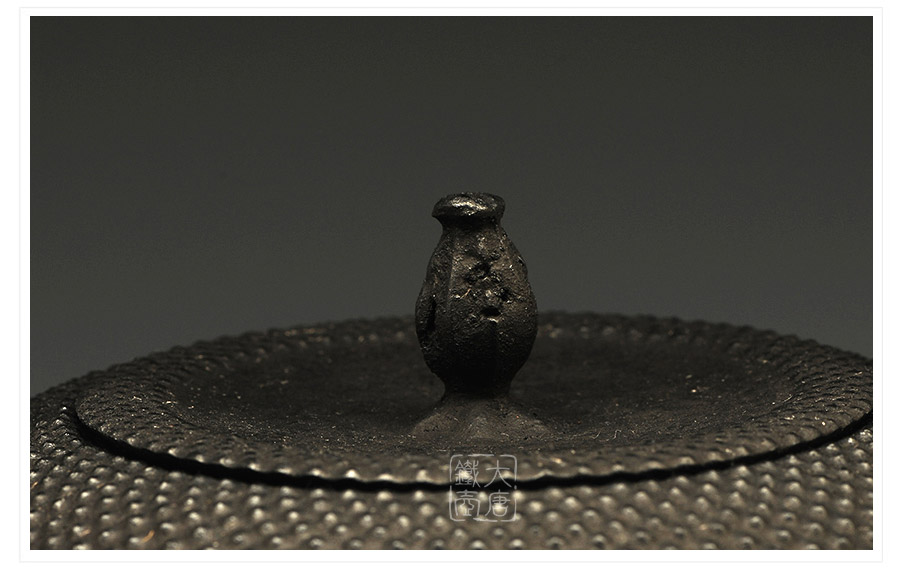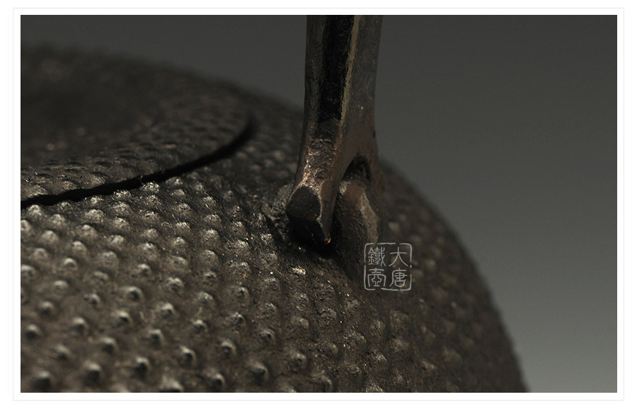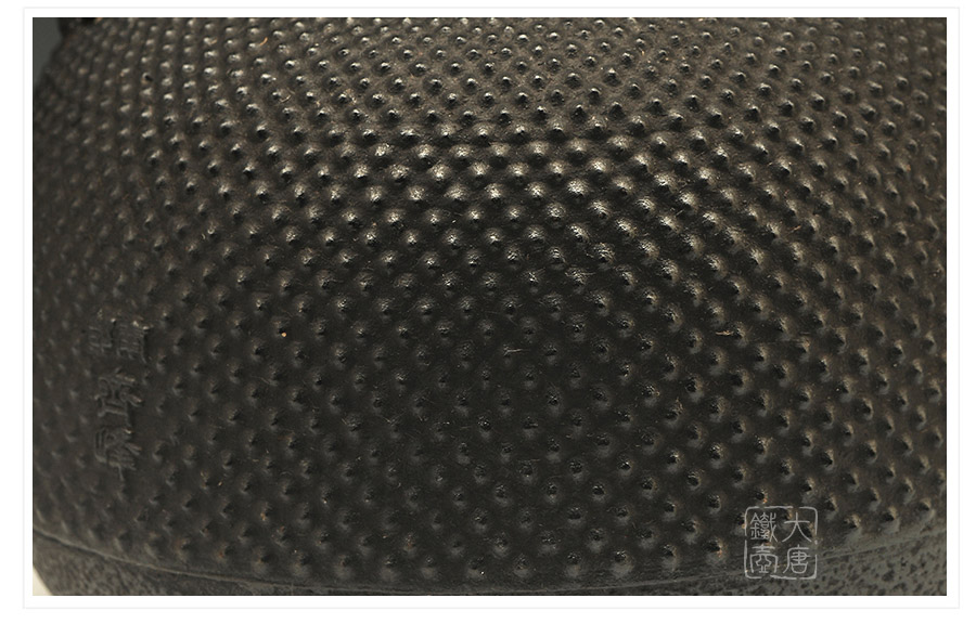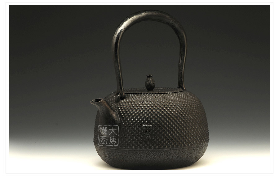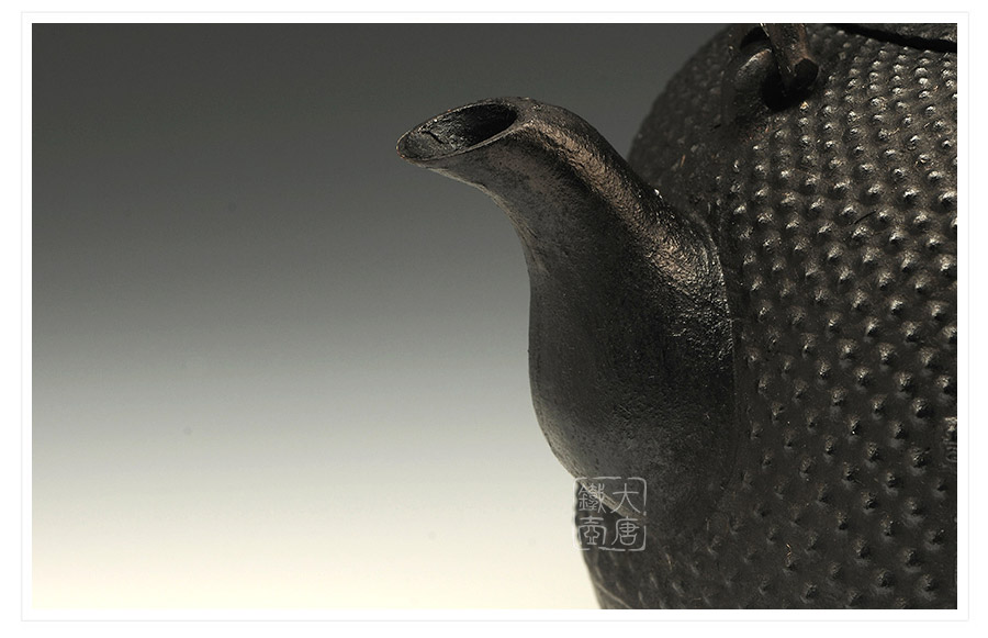 水澤名師及川齊作品,壺嘴簡約古樸,線條凝練大氣,生鐵蓋外圍霰紋與壺身相互映襯,渾然一體,壺身上部采用南部經(jīng)典霰紋,霰點精巧銳利,充滿動感和韻律。