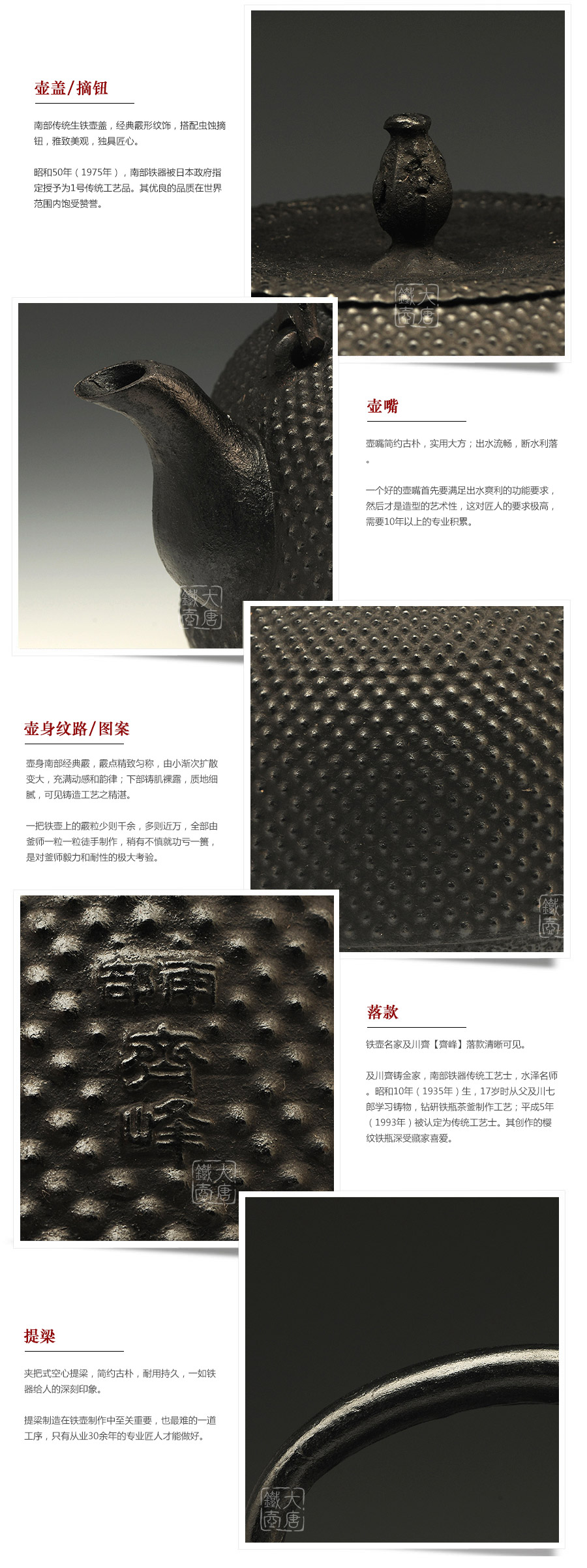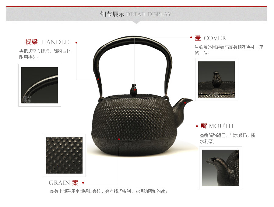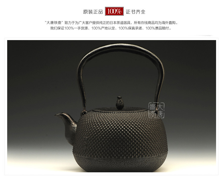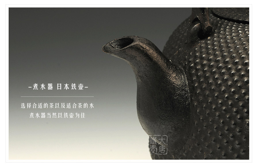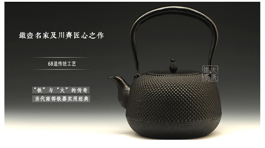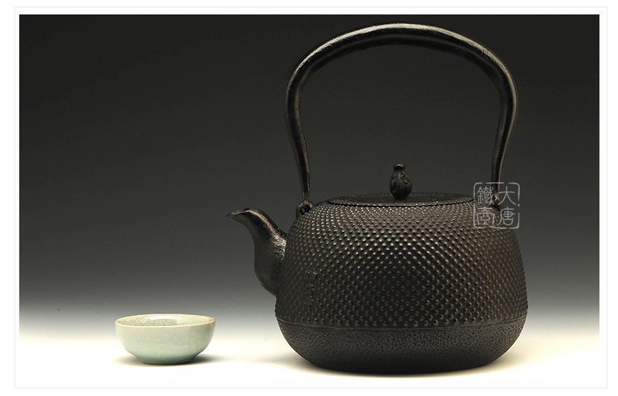水澤名師及川齊作品,壺嘴簡約古樸,線條凝練大氣,生鐵蓋外圍霰紋與壺身相互映襯,渾然一體,壺身上部采用南部經(jīng)典霰紋,霰點精巧銳利,充滿動感和韻律。
