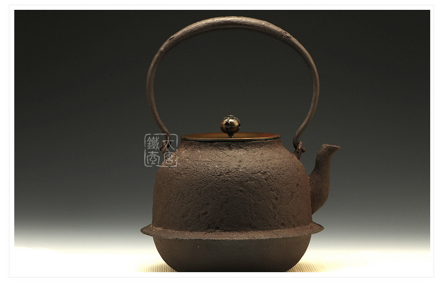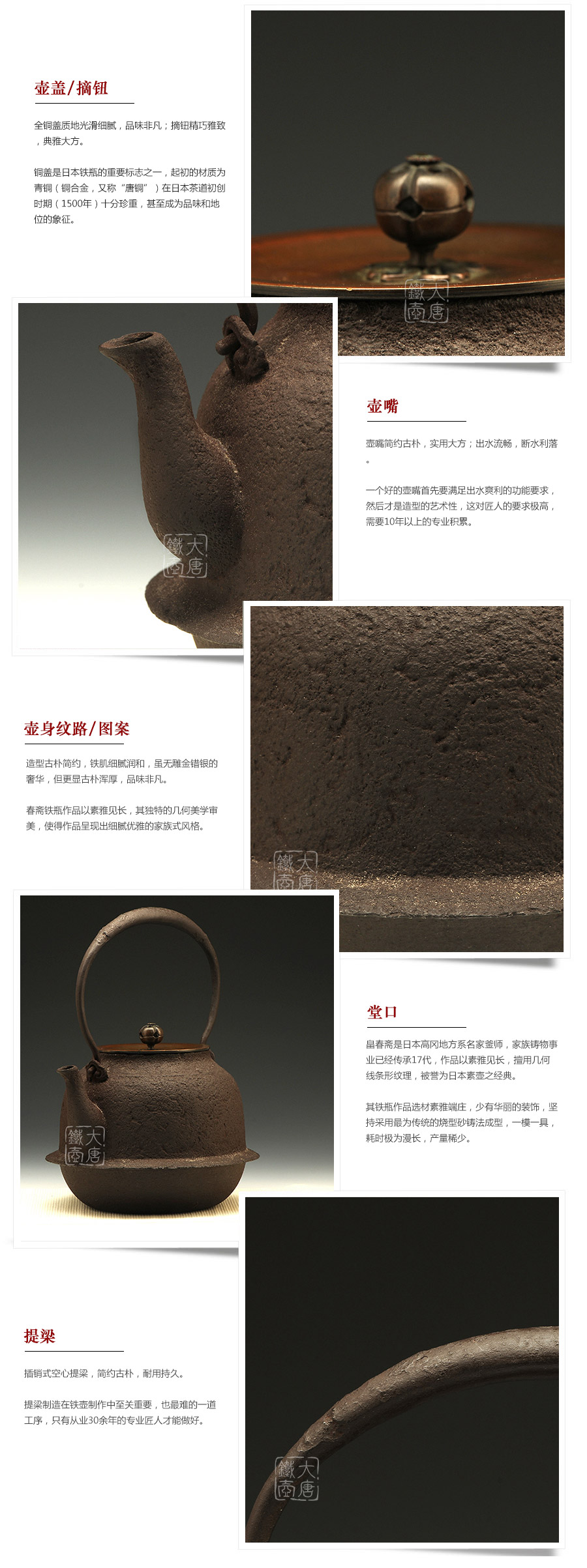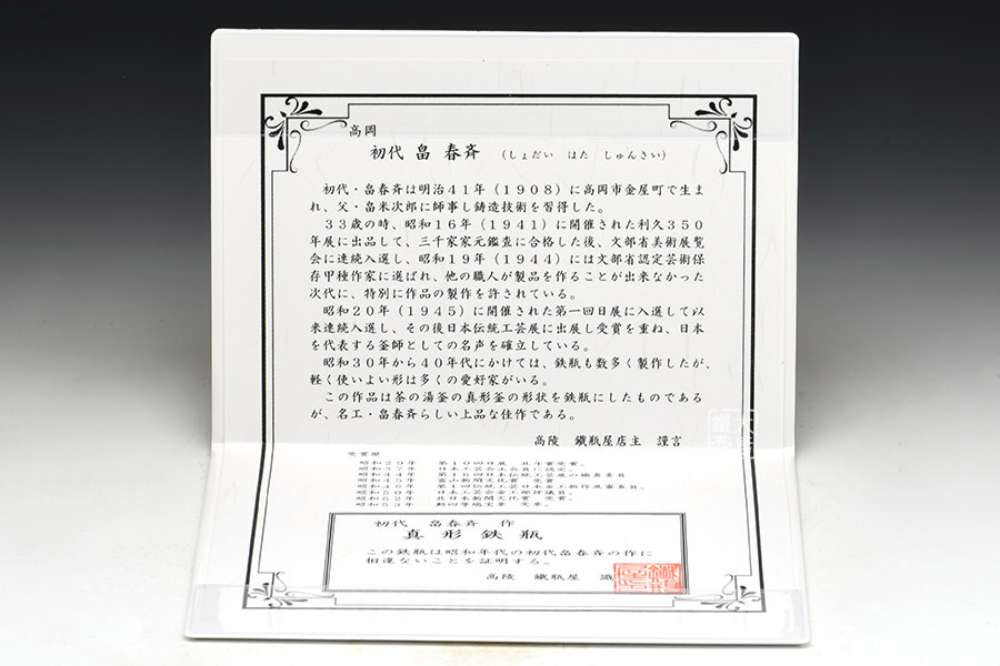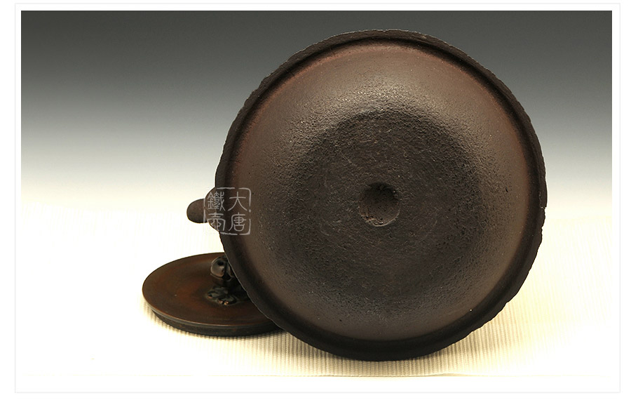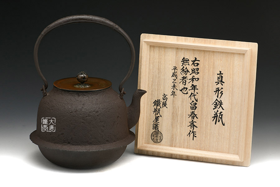鐵瓶?jī)?nèi)底被稱之為“鳴金”的響片使得水燒開(kāi)之后的煮沸聲更為悅耳。鐵瓶下側(cè)的“春齋”刻印以及共箱蓋子的題字都是作者親筆所寫。此為檢驗(yàn)春齋鐵瓶真?zhèn)蔚臉?biāo)志之一。