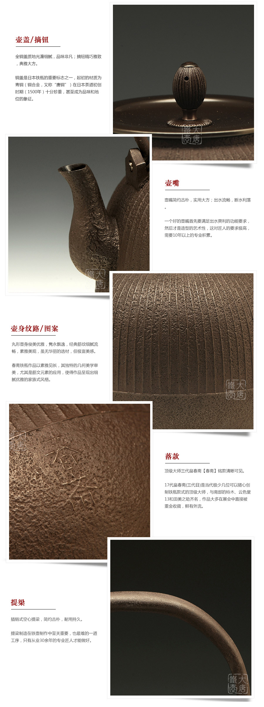 鐵瓶內(nèi)底被稱之為“鳴金”的響片使得水燒開之后的煮沸聲更為悅耳。鐵瓶下側(cè)的“春齋”刻印以及共箱蓋子的題字都是作者親筆所寫。此為檢驗(yàn)春齋鐵瓶真?zhèn)蔚臉?biāo)志之一。