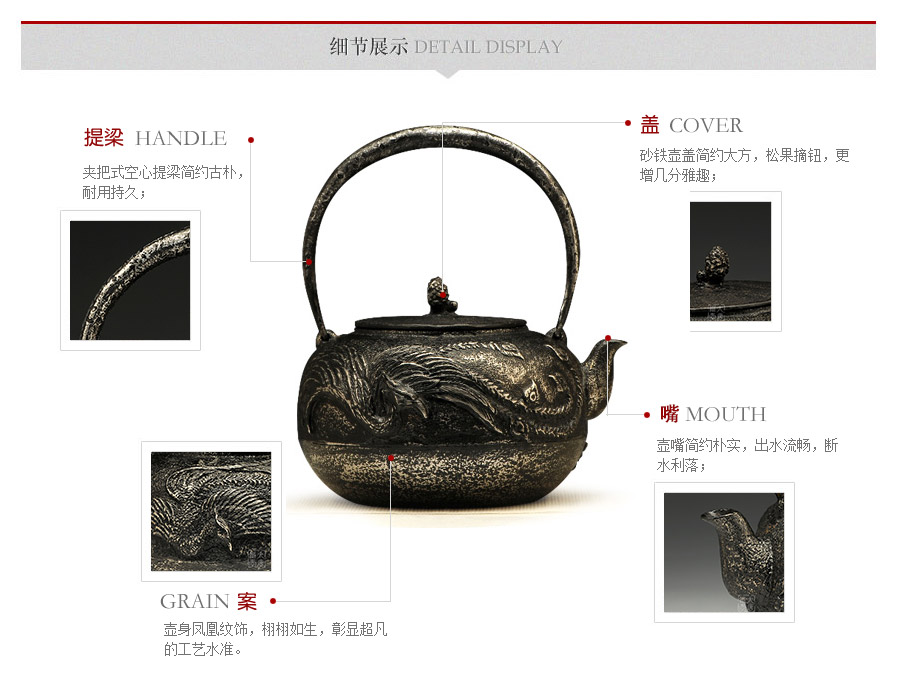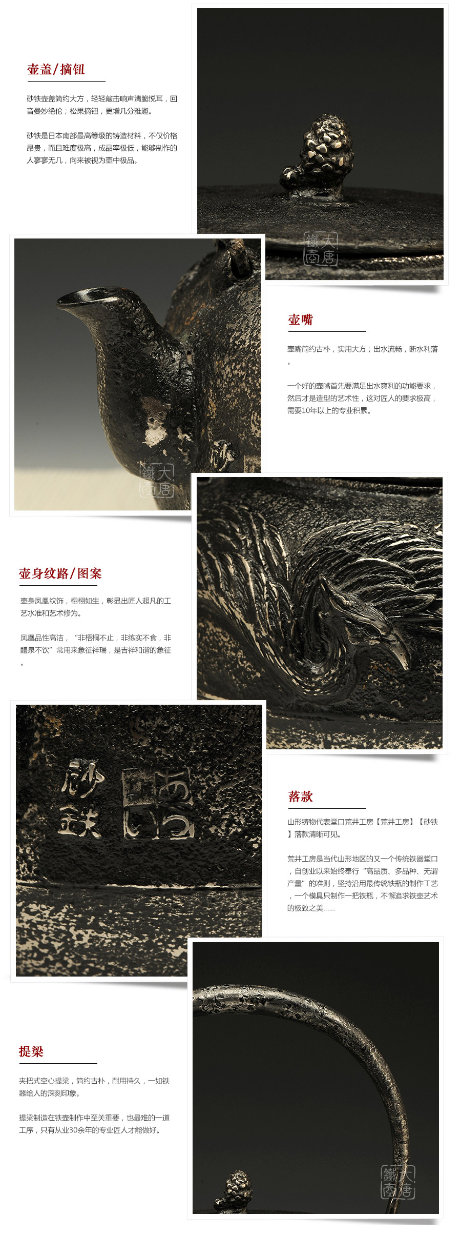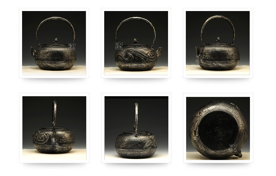 荒井工房匠心典范,一模一具,純手工蠟鑄成型。壺身鳳凰紋飾,栩栩如生,彰顯超凡的工藝水準(zhǔn)。