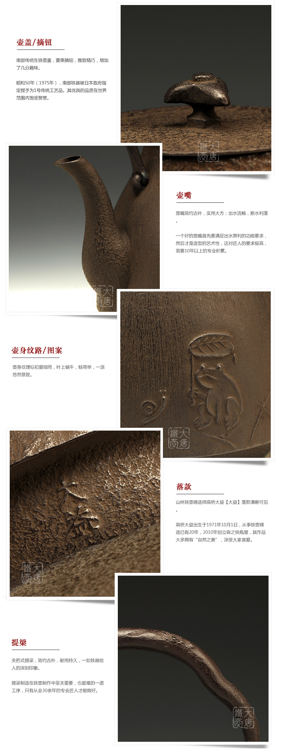 鐵壺鑄造師高橋大益出生于1971年10月1日,日本巖手縣矢巾町人。曾在盛岡市鐵器制造會(huì)社工作過13年,2010年辭職,同年4月創(chuàng)立自己的工房——“森之鐵瓶屋”。工房臨近盛岡市,藏身于日本雫石町一片茂林之中。雖然巖手縣聚集了一批從事鐵器制作的鑄造師,但是以“鐵瓶屋”命名的工房,卻獨(dú)此一家。“從出生開始,家里便一直有鐵壺的身影,幾乎每天都用著。數(shù)十年過去了,它還是那么堅(jiān)固耐用,燒水時(shí)發(fā)出好聽的‘咕嚕咕嚕’聲。人也一樣,越沉淀越有韻味。”做了十多年的鐵壺,高橋大益手藝精湛,很受業(yè)界稱贊。自獨(dú)立以來,他希望能鑄造出擁有“自然之美”、“與現(xiàn)代生活相契合”與“具有實(shí)用價(jià)值”的器物。