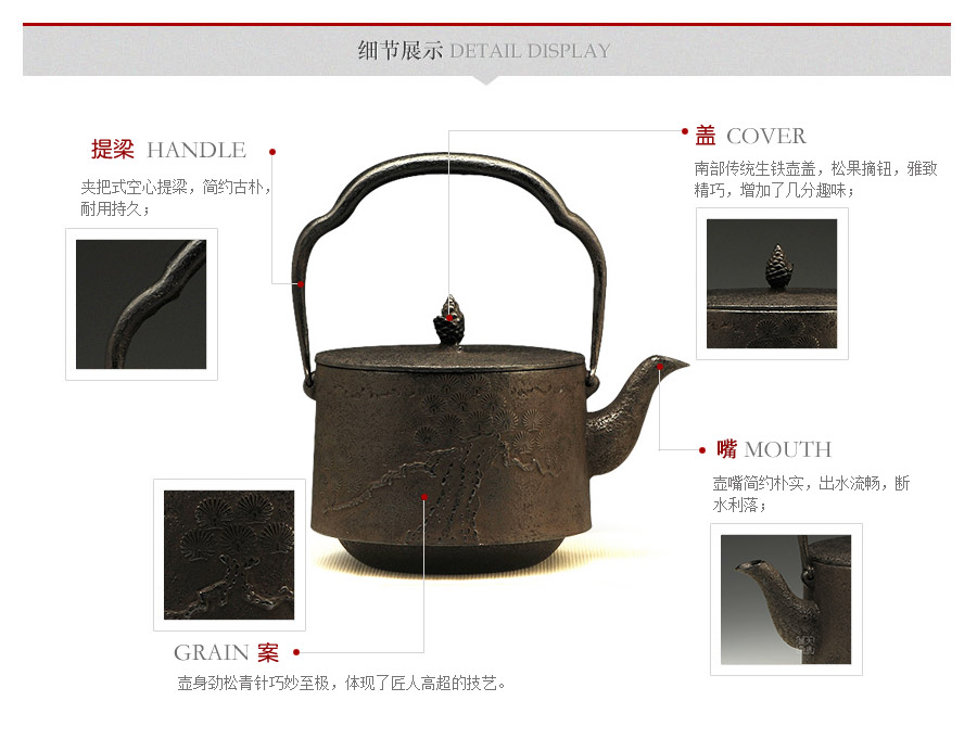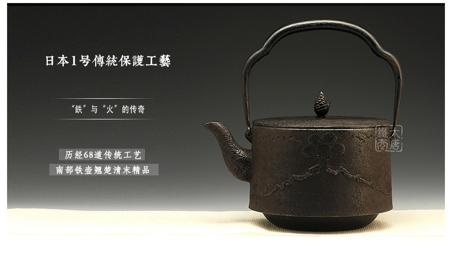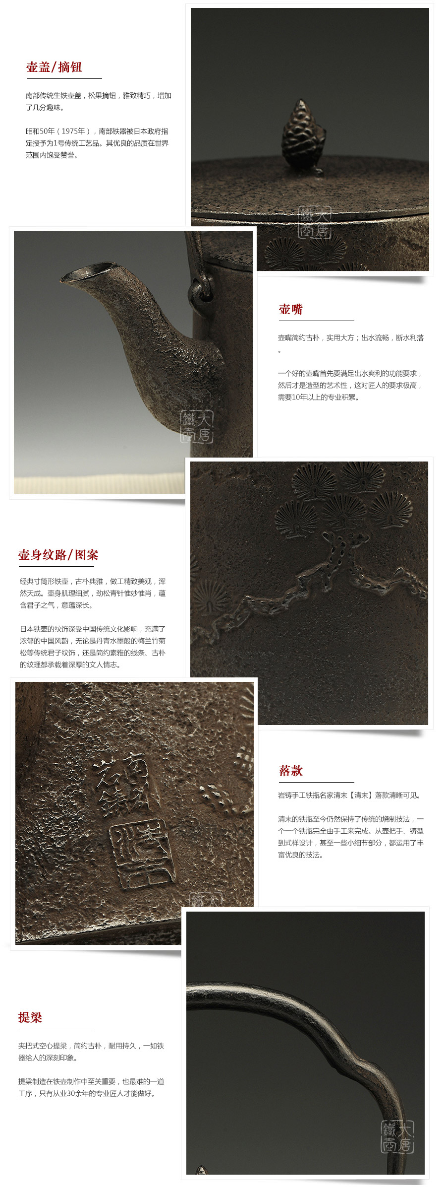 巖鑄手工鐵瓶名家清末作品,歷經(jīng)68道傳統(tǒng)工藝,壺身勁松青針巧妙至極,雅致古樸,夾把式空心提梁,簡(jiǎn)約實(shí)用。