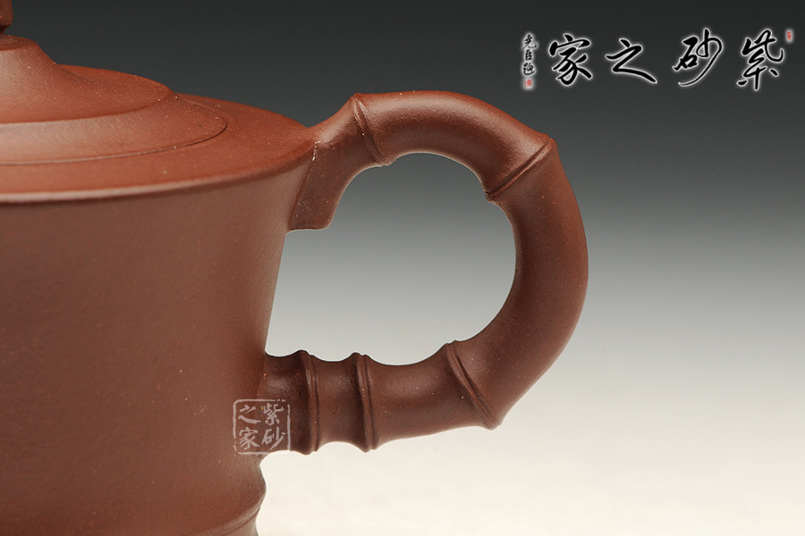 此壺以三節(jié)竹段為壺身桶,從壺底至鈕,以若干個(gè)不同直徑的同心圓,或陰或陽(yáng),或凸起,或凹陷,使壺表面呈現(xiàn)完美的曲線,完整有秩序,視覺沖擊力強(qiáng),無(wú)論從局部還是整體看,這款壺幾乎每個(gè)角度都是黃金分割,把、鈕和身筒三者比例完美。