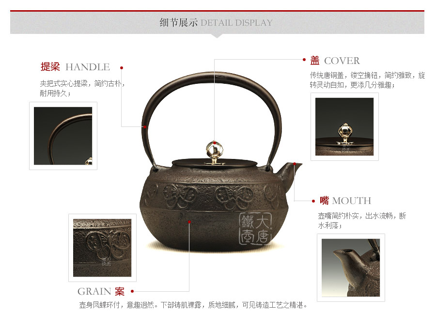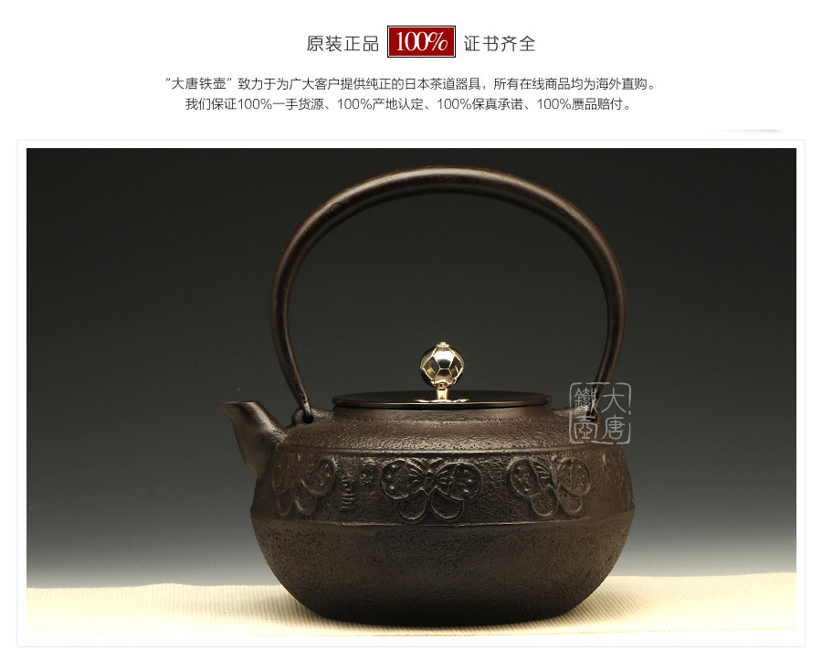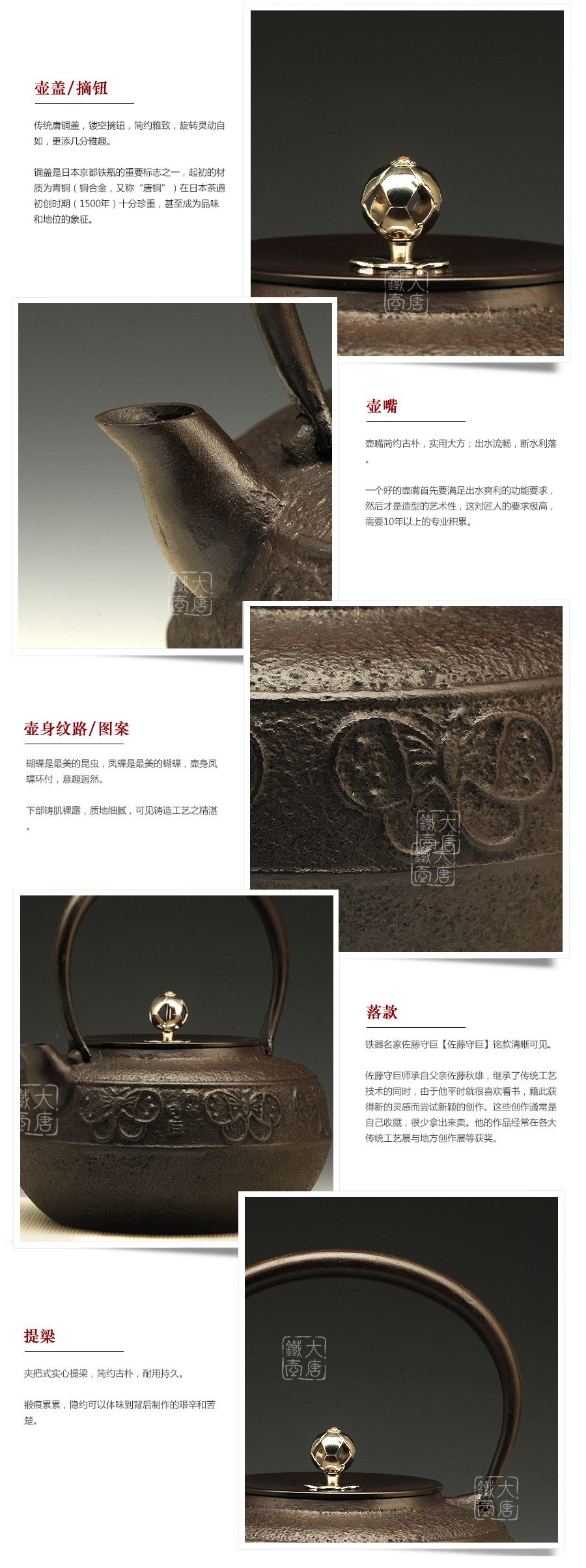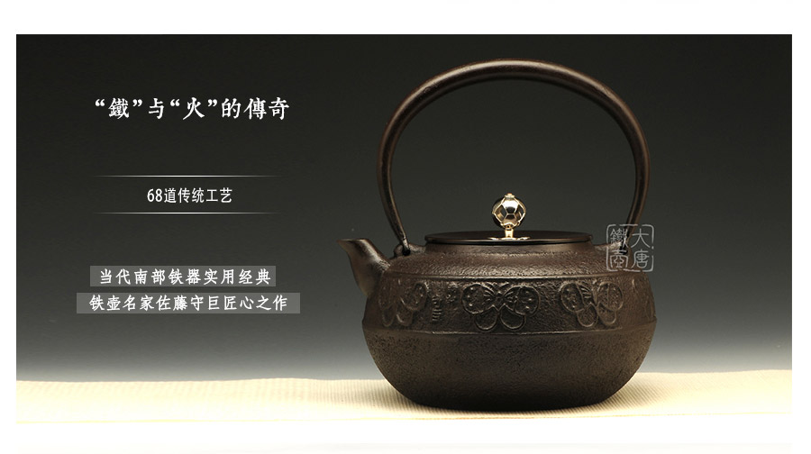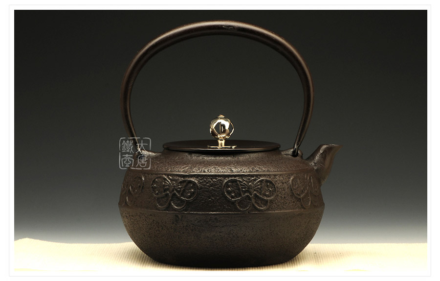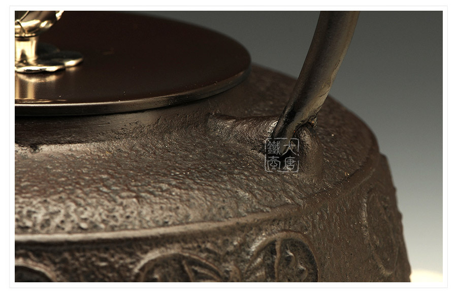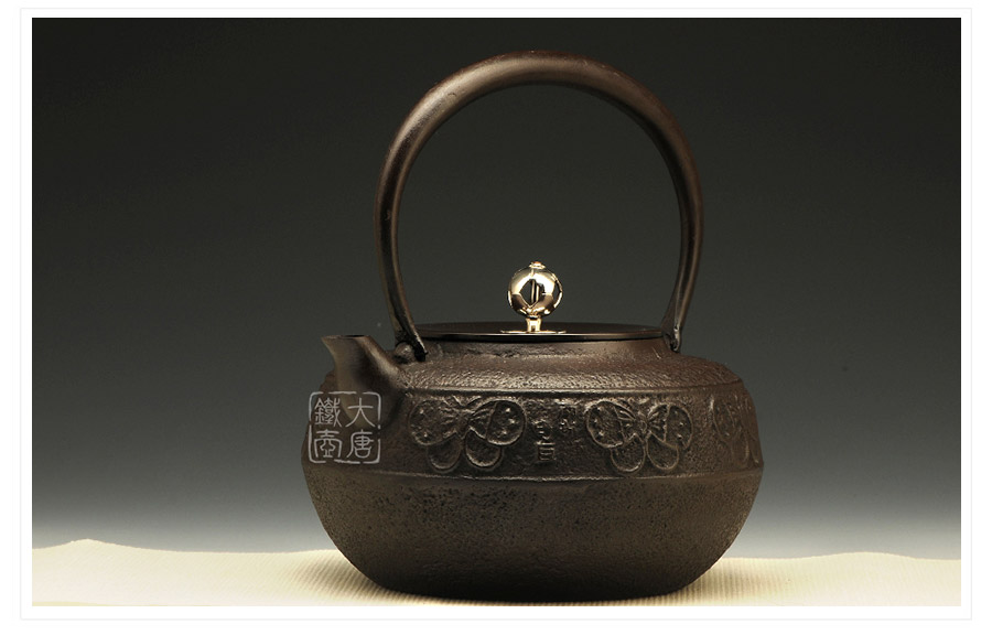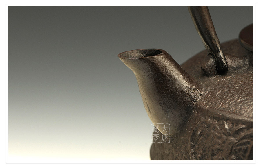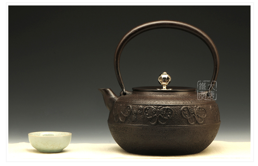 鐵壺名家佐藤守巨匠心之作,壺嘴簡約短促,出水順暢,傳統(tǒng)唐銅蓋,鏤空摘鈕,簡約雅致,壺身鳳蝶環(huán)付,意趣迥然。下部鑄肌裸露,質(zhì)地細(xì)膩,可見鑄造工藝之精湛。