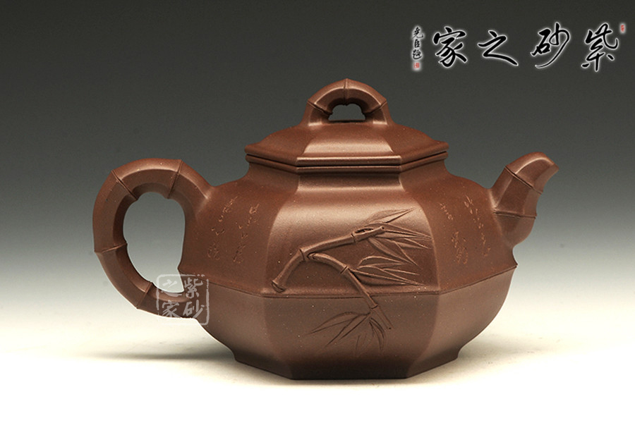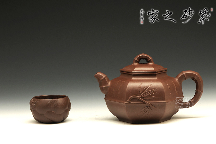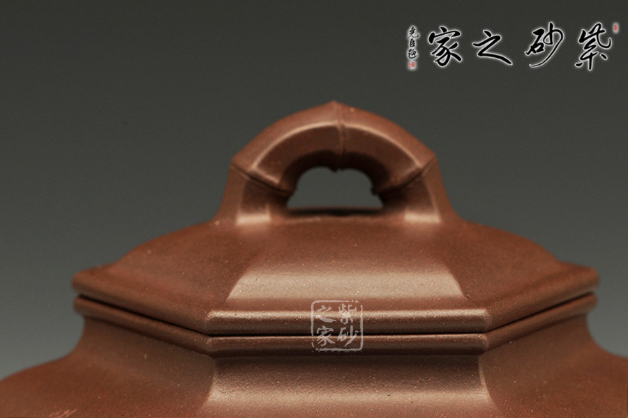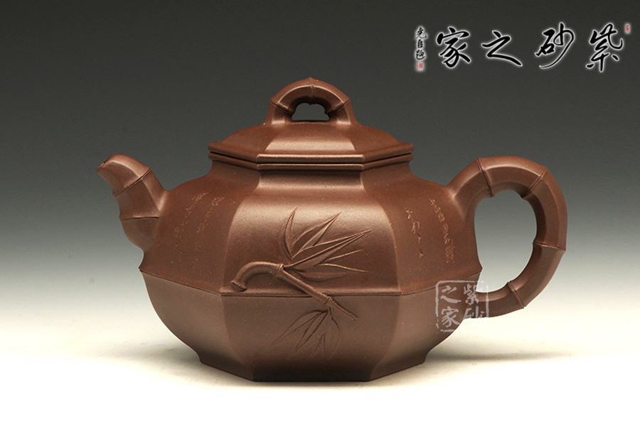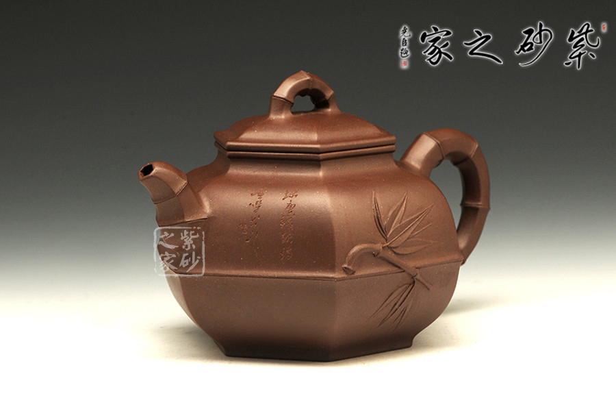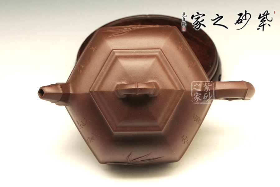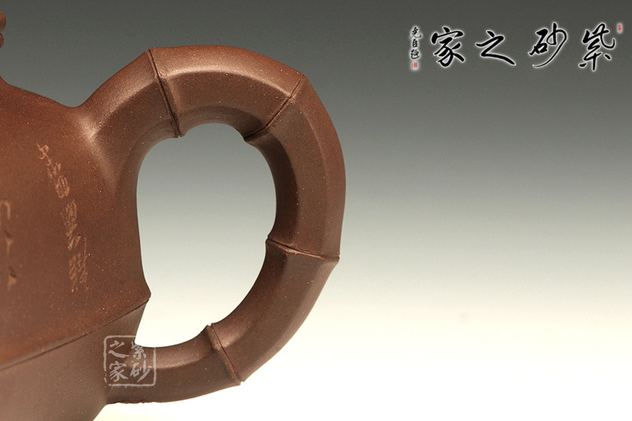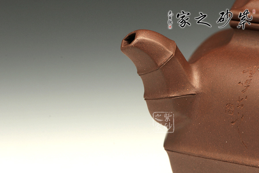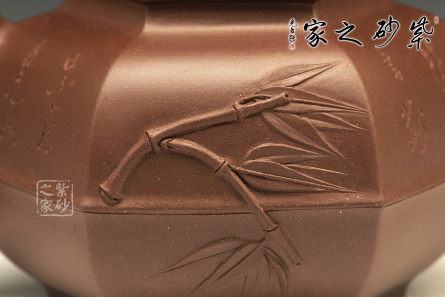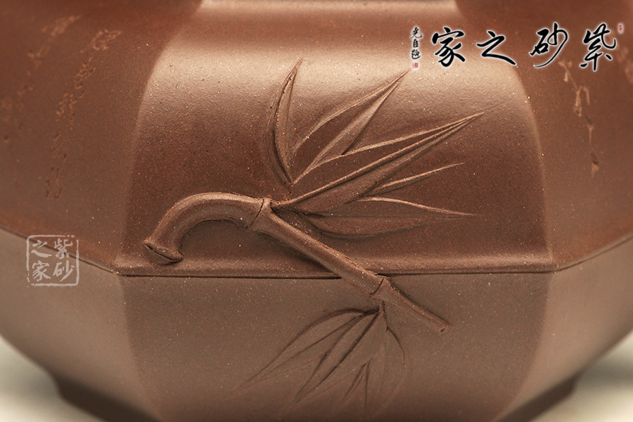 此壺呈六方狀,線面挺括有力,輪廓分明。壺身作方形竹節(jié)狀,壓蓋式,口蓋嚴絲合縫,壺嘴、壺把與壺鈕均以竹段為造型,從壺身竹節(jié)處冒出一竹枝,攀爬至壺身,輔以竹葉裝飾;方形竹節(jié)壺柄造型獨特,手執(zhí)舒適;整器對于竹節(jié)、竹葉的處理準確恰當、婀娜多姿。