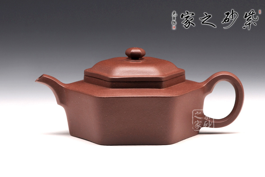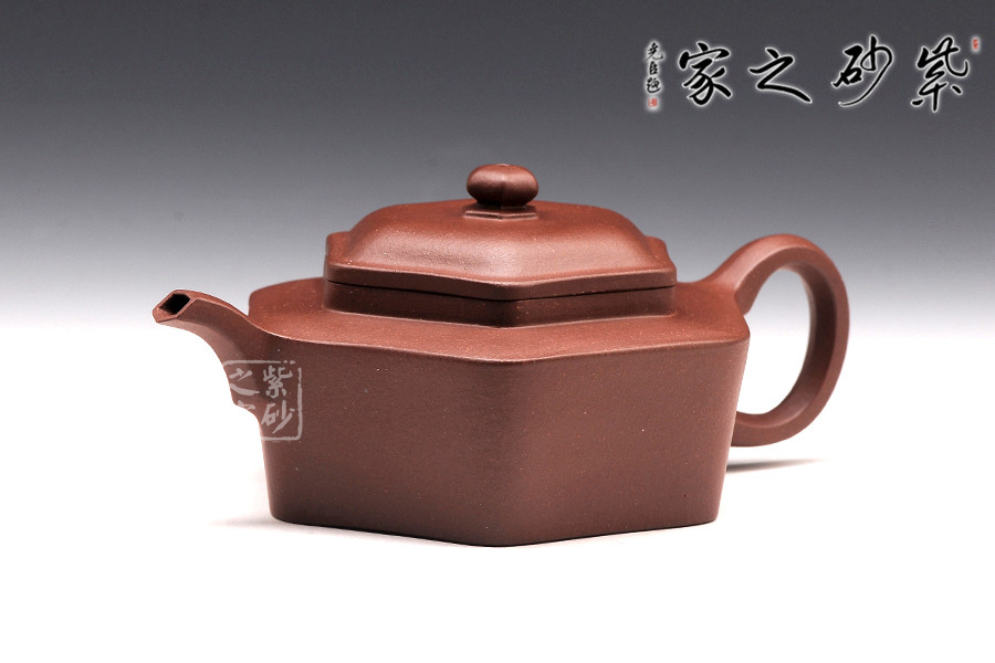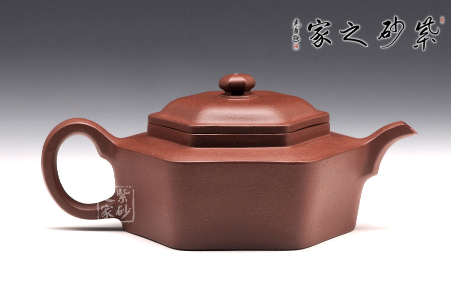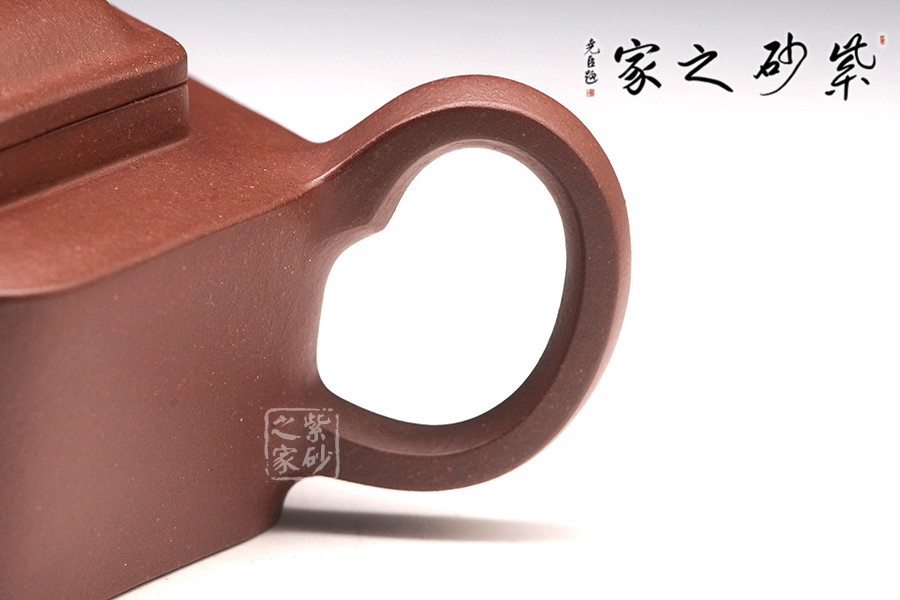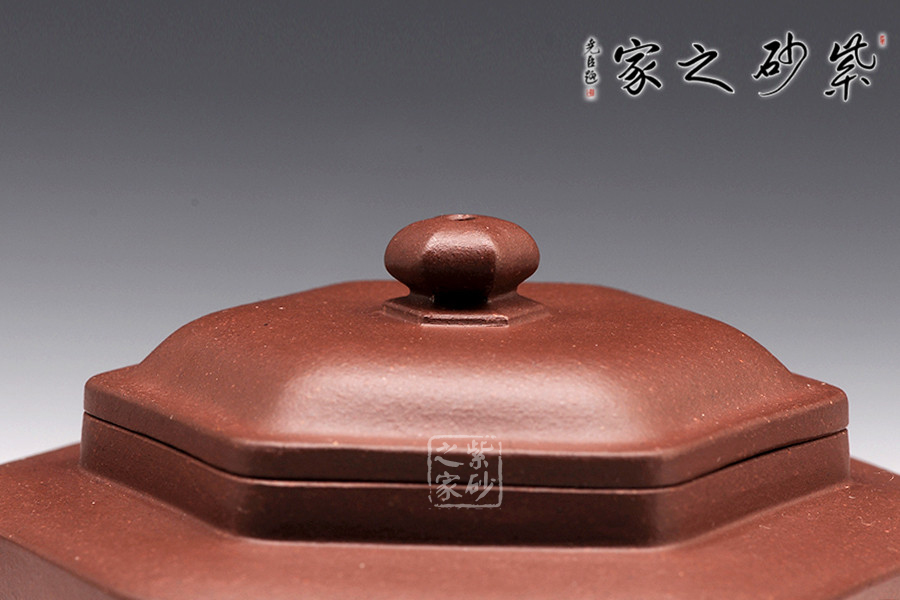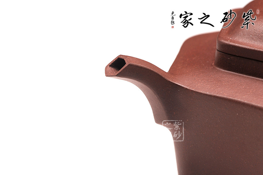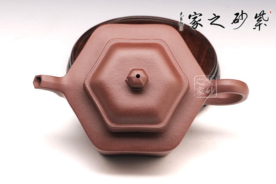 該壺壺身和和壺蓋皆呈六邊形,俊朗爽健。虛扁壺本身成型難度極大,再加上方器的成型難度亦比較的困難,再者融合在一起實(shí)乃難上加難,但周彥鋒老師制作的此款六方虛扁壺卻是線面挺括,輪廓分明,壺頸也呈六邊型展現(xiàn),古樸端莊,和壺蓋上的六邊形線條相映成趣,遙相呼應(yīng)。整個(gè)壺的高俊挺拔之氣便在這些六方形的輪廓和線條中顯現(xiàn)了出來(lái)。六方造型,寓意吉祥,饋贈(zèng)親友的佳品。