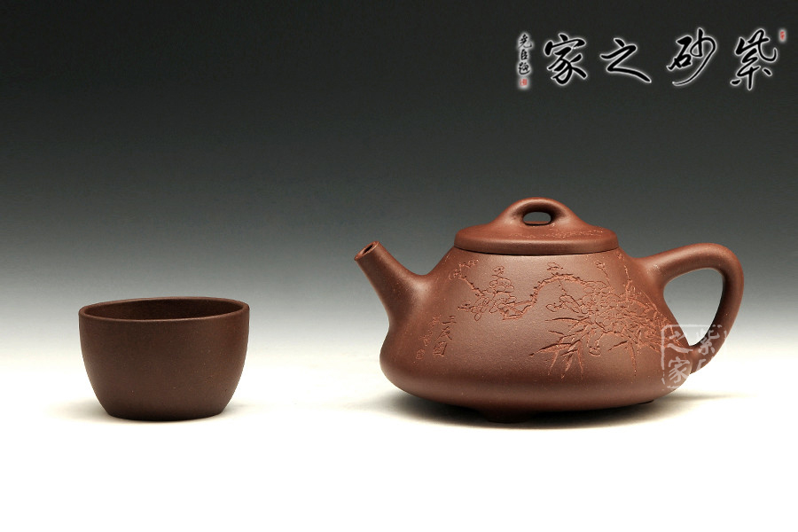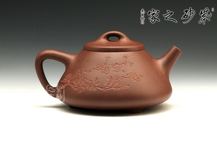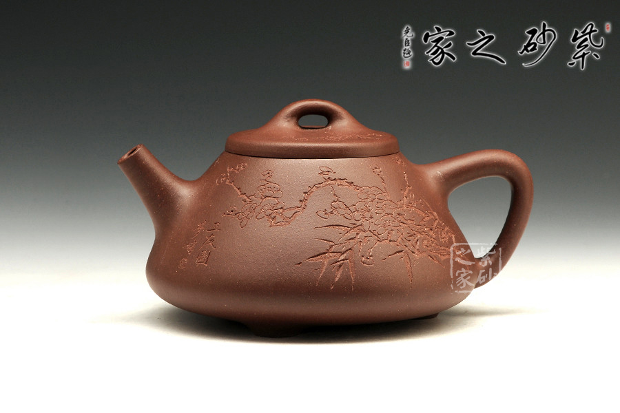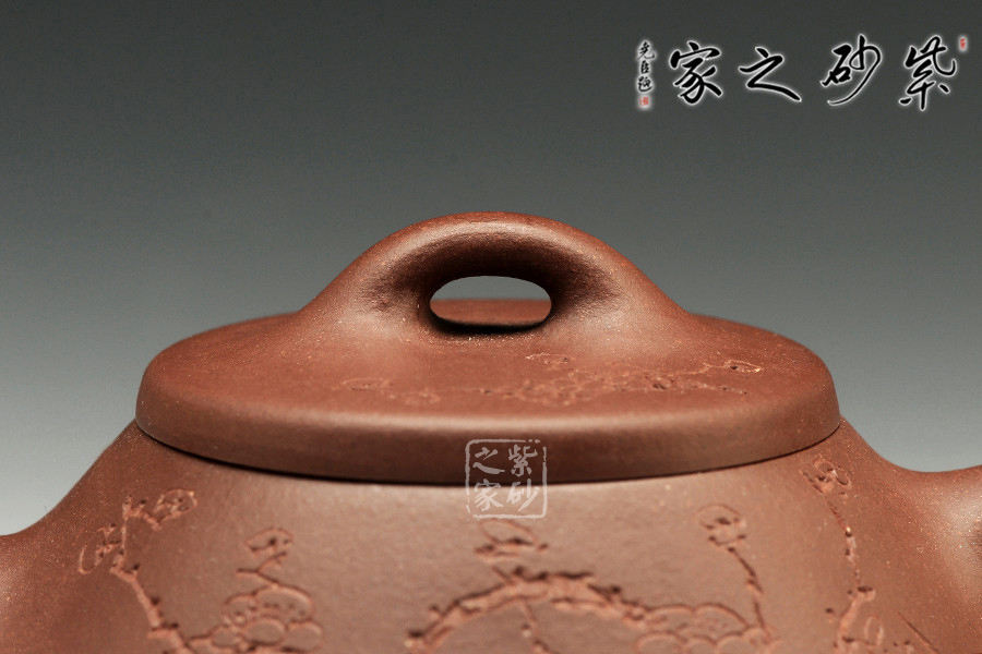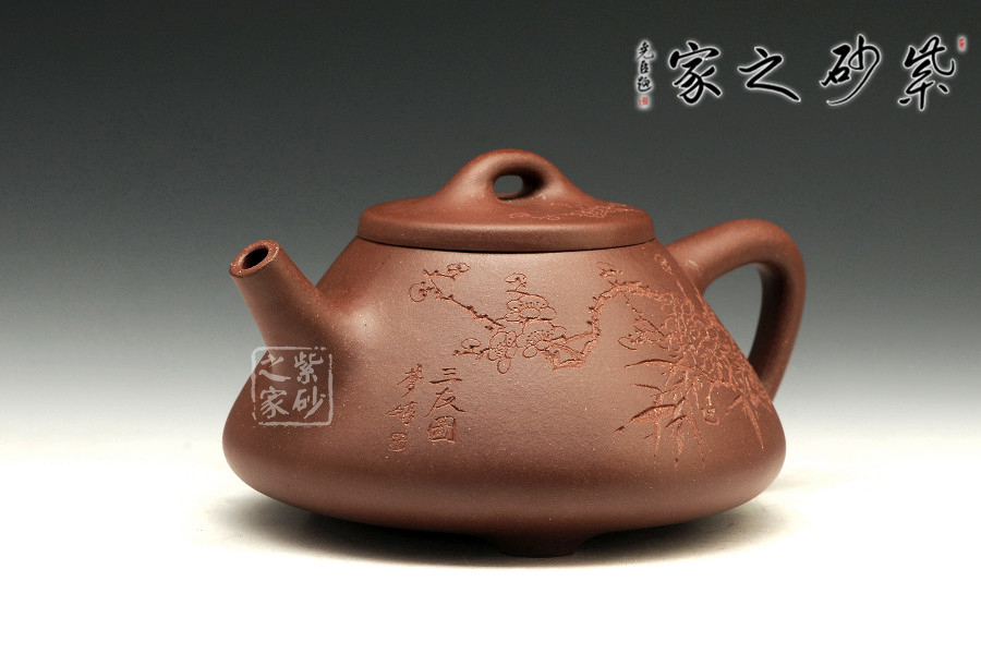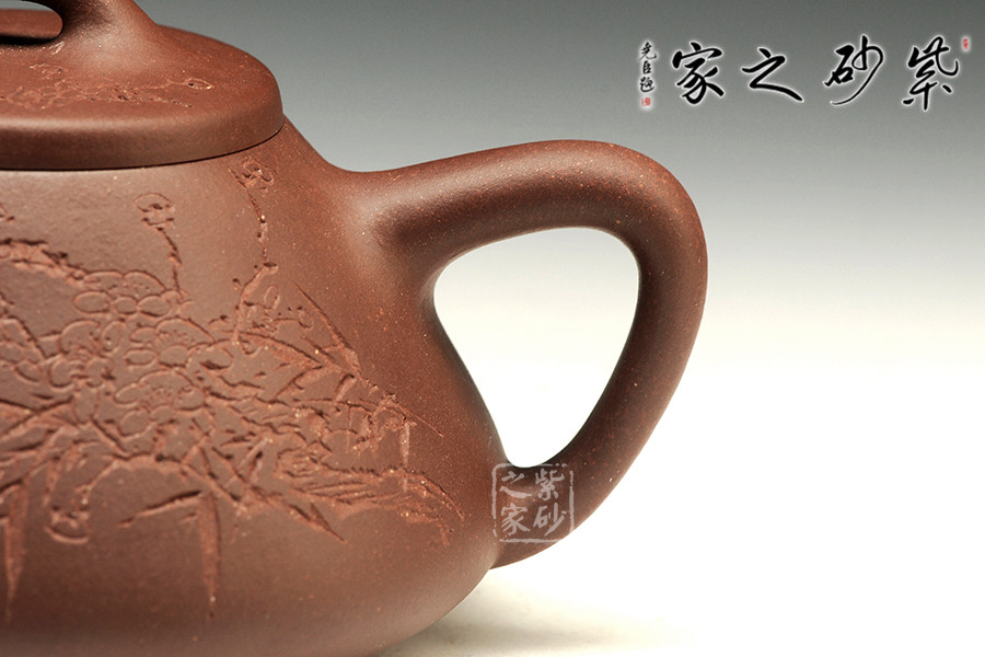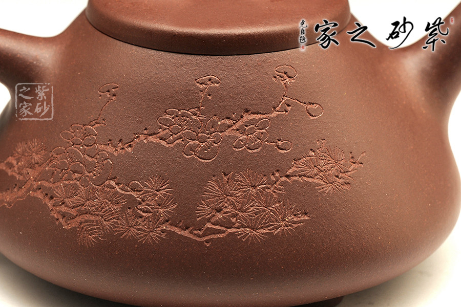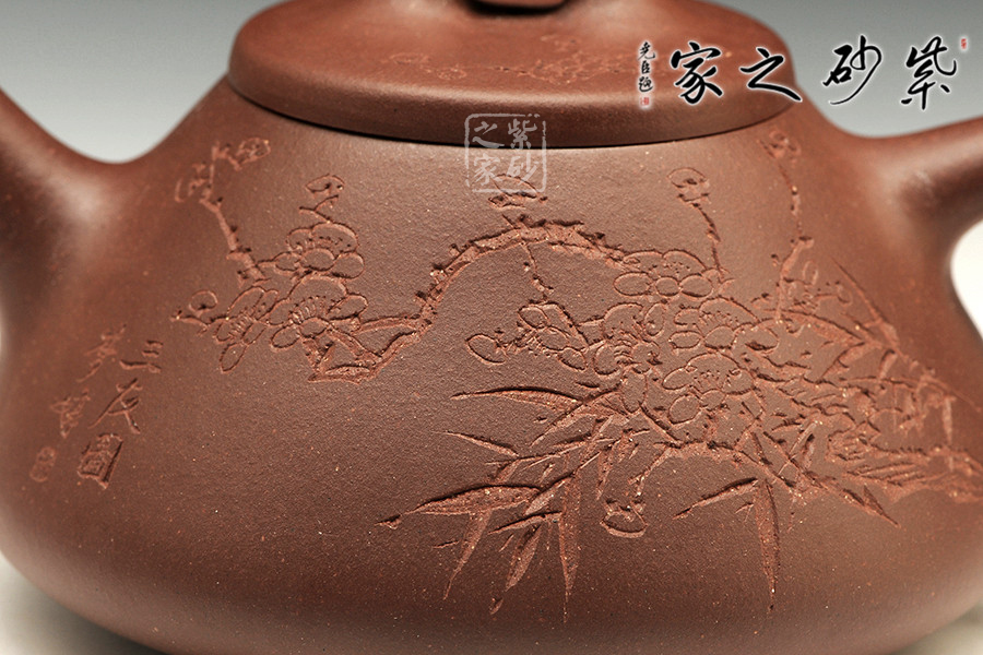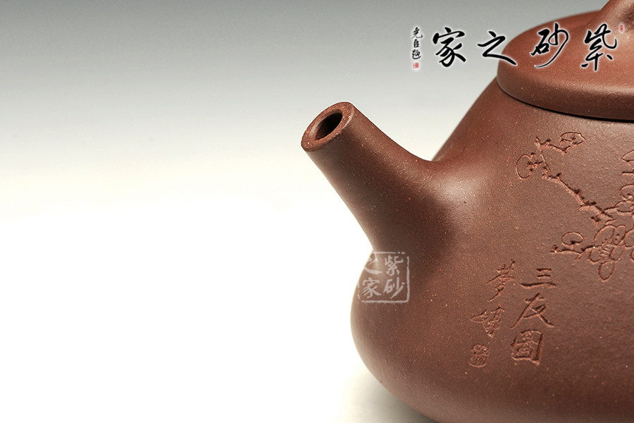中青年一代陶刻名匠中的佼佼者楊夢婷,師從研高蔣彥和陶刻大家陳宏林,作品均吳建平監(jiān)制,所用泥料優(yōu)秀,性價比高,潛力巨大。作品自制自銘,古樸內(nèi)斂,雙面刻繪,刀法利落,情趣韻味優(yōu)雅。此壺為經(jīng)典的石瓢造型,此壺下大上小呈三角形,周身皆以圓弧線條構(gòu)成,流、把、鈕處處銜接自然流暢,線條清爽利落,起承轉(zhuǎn)合自如得體。壺嘴、壺把、壺身三位一體。底部三圓足立起全身,使壺顯得挺括有神,展露出一種大氣風(fēng)范。壺身刻繪三君子,與作品本身展示的君子氣度十分契合,不失為一款賞玩佳器。