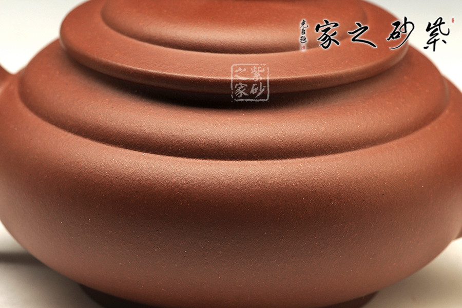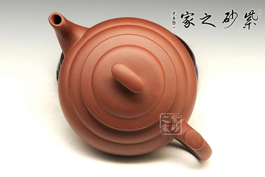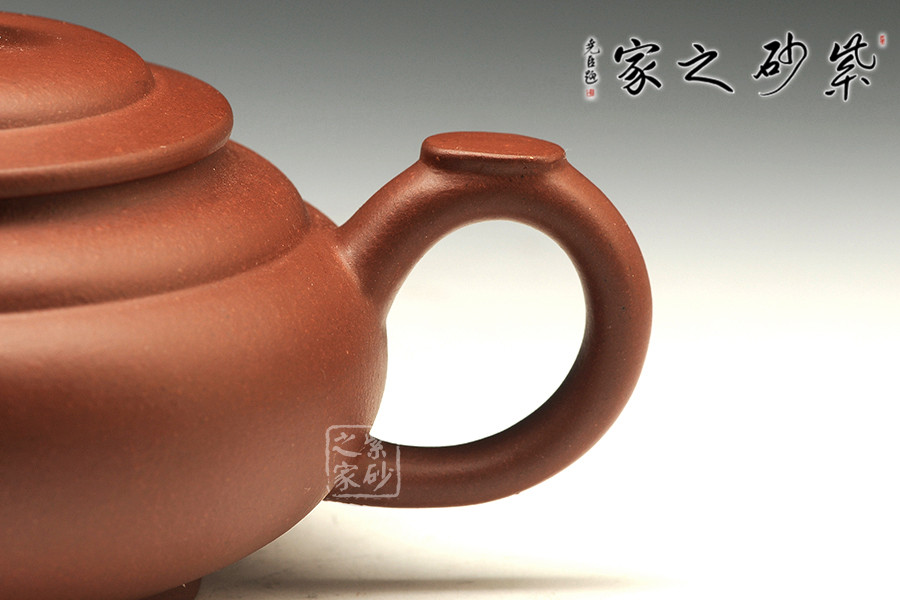 匠心傳承者吳行其,師從研高吳培林,有著30余年制壺功底,作品傳統(tǒng)與創(chuàng)新兼具,制作精良,實(shí)用性強(qiáng)。此壺泥色細(xì)膩,瑩潤光澤,壺身呈扁圓形,折腹圈足,曲流,環(huán)狀柄,柄上有方寸之地可安放拇指,見匠心獨(dú)運(yùn)。壓蓋式,橋形鈕,蓋部及肩部均以凹線分割空間,自上而下觀之,有“一環(huán)扣一環(huán)”之感,稍加想象,壺蓋上的橋形鈕正如水波蕩漾中的一座小橋,“上新橋壺”或由此得名。“上新橋壺”是顧景舟先生六十年代時(shí)原創(chuàng)壺形,是為大生產(chǎn)打樣創(chuàng)制而成,因款式簡(jiǎn)約,實(shí)用與觀賞性佳,成為經(jīng)典壺型之一。